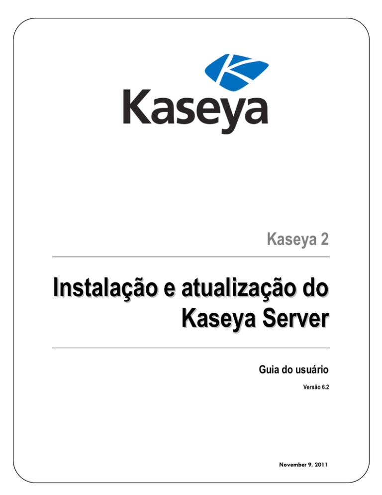 Kaseya 2 Instalação e atualização do Kaseya Server Guia do usuário Versão 6.2 November 9, 2011 About Kaseya Kaseya is a global provider of IT automation software for IT Solution Providers and Public and Private Sector IT organizations. Kaseya's IT Automation Framework allows IT Professionals to proactively monitor, manage and maintain distributed IT infrastructure remotely, easily and efficiently with one integrated Web based platform. Kaseya's technology is licensed on over five million machines worldwide. Copyright © 2000-2011 Kaseya International Limited. All Rights Reserved. Conteúdo Introdução 1 Pré-inicialização 2 Lista de verificação de pré-instalação.......................................................................................................2 Requisitos de sistema ..............................................................................................................................3 Plataformas do Kaseya Server não suportadas ........................................................................................3 Uso do Microsoft SQL 2005 64 bit ............................................................................................................3 Requisitos de espaço em disco ................................................................................................................3 Requisitos de memória (RAM)..................................................................................................................4 Pré-requisitos para instalação 4 Instalação do Microsoft NET Framework ..................................................................................................4 Instalação do Internet Information Service (IIS) ........................................................................................4 Instalação do ASP.NET State Service ......................................................................................................6 Instalação do Message Queuing Service (MSMQ)....................................................................................6 Aplicar as correções do sistema operacional recentes ..............................................................................7 Omissão de servidor proxy .......................................................................................................................8 Nome de domínio ou endereço IP do Kaseya Server................................................................................8 Configuração da porta..............................................................................................................................9 Instalação do SQL Server ......................................................................................................................10 Configuração do SQL Server Reporting Services ...................................................................................12 Instalação do novo Kaseya Server K2 13 Software antivírus ..................................................................................................................................13 Etapas de instalação do K2 ....................................................................................................................13 Criar um novo usuário mestre ................................................................................................................21 Baixar e aplicar manualmente as correções do Kaseya ..........................................................................22 Instalação de módulos suplementares para a nova instalação do K2......................................................22 Relator problemas do instalador .............................................................................................................23 Atualizar KServer existente para K2 24 Atualizar o Kaseya Server no mesmo computador .................................................................................24 Lista de verificação de pré-atualização .........................................................................................24 Fazer backup do Kaseya Server...................................................................................................25 Agendar a atualização..................................................................................................................25 Software antivírus ........................................................................................................................25 Atualizar módulos suplementares .................................................................................................25 Atualizar de 5.1 para 6.2 ..............................................................................................................26 Atualizar da versão 6.x para 6.2 ...................................................................................................32 Relator problemas do instalador ...................................................................................................35 Atualizar Kaseya Server ao migrar para novo hardware .........................................................................35 Lista de verificação de pré-atualização .........................................................................................35 Fazer backup do Kaseya Server...................................................................................................36 Agendar a atualização..................................................................................................................36 Software antivírus ........................................................................................................................36 Migrar Kaseya Server...................................................................................................................36 Arquivar Kaseya Server..................................................................
