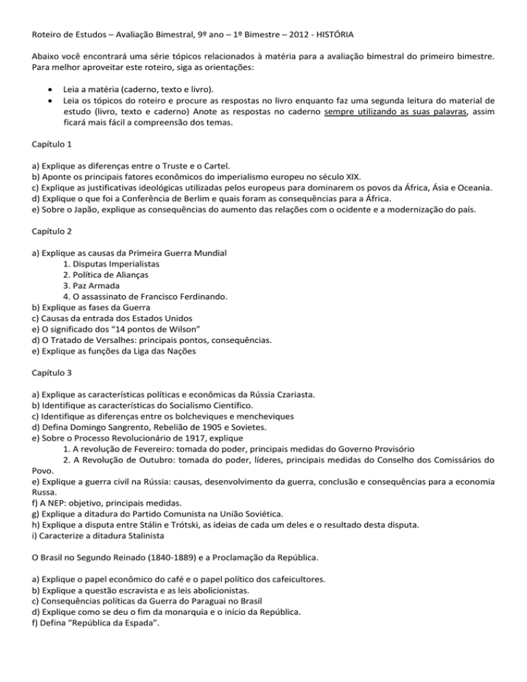 Roteiro de Estudos – Avaliação Bimestral, 9º ano – 1º Bimestre – 2012 - HISTÓRIA Abaixo você encontrará uma série tópicos relacionados à matéria para a avaliação bimestral do primeiro bimestre. Para melhor aproveitar este roteiro, siga as orientações: Leia a matéria (caderno, texto e livro). Leia os tópicos do roteiro e procure as respostas no livro enquanto faz uma segunda leitura do material de estudo (livro, texto e caderno) Anote as respostas no caderno sempre utilizando as suas palavras, assim ficará mais fácil a compreensão dos temas. Capítulo 1 a) Explique as diferenças entre o Truste e o Cartel. b) Aponte os principais fatores econômicos do imperialismo europeu no século XIX. c) Explique as justificativas ideológicas utilizadas pelos europeus para dominarem os povos da África, Ásia e Oceania. d) Explique o que foi a Conferência de Berlim e quais foram as consequências para a África. e) Sobre o Japão, explique as consequências do aumento das relações com o ocidente e a modernização do país. Capítulo 2 a) Explique as causas da Primeira Guerra Mundial 1. Disputas Imperialistas 2. Política de Alianças 3. Paz Armada 4. O assassinato de Francisco Ferdinando. b) Explique as fases da Guerra c) Causas da entrada dos Estados Unidos e) O significado dos “14 pontos de Wilson” d) O Tratado de Versalhes: principais pontos, consequências. e) Explique as funções da Liga das Nações Capítulo 3 a) Explique as características políticas e econômicas da Rússia Czariasta. b) Identifique as características do Socialismo Científico. c) Identifique as diferenças entre os bolcheviques e mencheviques d) Defina Domingo Sangrento, Rebelião de 1905 e Sovietes. e) Sobre o Processo Revolucionário de 1917, explique 1. A revolução de Fevereiro: tomada do poder, principais medidas do Governo Provisório 2. A Revolução de Outubro: tomada do poder, líderes, principais medidas do Conselho dos Comissários do Povo. e) Explique a guerra civil na Rússia: causas, desenvolvimento da guerra, conclusão e consequências para a economia Russa. f) A NEP: objetivo, principais medidas. g) Explique a ditadura do Partido Comunista na União Soviética. h) Explique a disputa entre Stálin e Trótski, as ideias de cada um deles e o resultado desta disputa. i) Caracterize a ditadura Stalinista O Brasil no Segundo Reinado (1840-1889) e a Proclamação da República. a) Explique o papel econômico do café e o papel político dos cafeicultores. b) Explique a questão escravista e as leis abolicionistas. c) Consequências políticas da Guerra do Paraguai no Brasil d) Explique como se deu o fim da monarquia e o início da República. f) Defina “República da Espada”. Capítulo 4 a) Explique o termo “República das Oligarquias” b) Defina: Coronel, voto de cabresto e Coronelismo c) Explique as estratégias utilizadas pelo coronel para controlar os votos. d) Defina a Política dos Governadores e a Política do Café com Leite. e) Explique o que foi o Convênio de Taubaté: seus objetivos e medidas adotadas. f) Explique por que a extração do látex se tornou importante para a economia do norte g) Identifique as consequências da exploração do látex. h) Explique o fim do chamado “ciclo da borracha”. i) Identifique as causas do crescimento industrial brasileiro durante a República Velha. j) Caracterize a urbanização no Brasil h) Identifique: os principais grupos de imigrantes que vieram ao Brasil, para onde se dirigiam e por que.