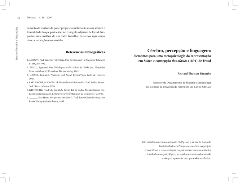 Dossiê Filosofia e Psicanálise 52 Discurso n. 36 2007 conceito de vontade de poder propicie à sublimação maior alcance e fecundidade do que pode caber no triângulo edipiano de Freud. Isso, porém, seria matéria de um outro trabalho. Basta-nos aqui, como disse, a indicação nesse sentido. Referências Bibliográficas 1. ASSOUN, Paul-Laurent. “L’héritage de la psychanalyse” in Magazine Litteraire n. 298, Avr 1992. Cérebro, percepção e linguagem: elementos para uma metapsicologia da representação em Sobre a concepção das afasias (1891) de Freud 2. FREUD, Sigmund. Das Unbehagen in der Kultur. In Werke (ed. Alexander Mitscherlich et al). Frankfurt: Fischer Verlag, 1982. 3. GASSER, Reinhard. Nietzsche und Freud. Berlim/Nova York: de Gruyter, Richard Theisen Simanke 1987. 4. LAPLANCHE, & PONTALIS. Vocabulário da Psicanálise. Trad. Pedro Tamen. 3ed. Lisboa: Moraes, 1976. Professor do Departamento de Filosofia e Metodologia das Ciências da Universidade Federal de São Carlos (UFSCar) 5. NIETZSCHE, Friedrich. Sämtliche Werke. Ed. G. Colli e M. Montinrari. Kritische Studienausgabe. Berlim/Nova York/Munique: de Gruyter/DTV. 1980. 6. .______. Ecce Homo. Por que sou tão sábio 7. Trad. Paulo César de Souza. São Paulo: Companhia das Letras, 1995. Este trabalho recebeu o apoio do CNPq, sob a forma da Bolsa de Produtividade em Pesquisa concedida ao projeto Consciência e representação em psicanálise: alcance e limites da reflexão metapsicológica, ao qual se encontra relacionado e do qual apresenta uma parte dos resultados. Cérebro, percepção e linguagem: elementos para uma metapsicologia da representação em Sobre a concepção das afasias (1891) de Freud Introdução O objetivo deste artigo é mostrar que o ensaio crítico Sobre a concepção das afasias, escrito por Freud em 1891, é o primeiro passo para a formulação de uma doutrina da representação, cujas características iniciais permanecerão inalteradas ao longo de todo o desenvolvimento da obra e cuja compreensão é indispensável para a elucidação desse amplo projeto teórico de fundamentação de uma ciência naturalista da mente, que Freud denominou metapsicologia. Palavras-chave: psicanálise, Freud, metapsicologia, representação, associacionismo, atomismo psicológico Mind, perception and language: elements to a metapsychology of representation in the Conception of aphasia The aim of this paper is to show that Freud’s Conception of aphasia is the first step towards the framing of a doctrine of representation whose main features remain unchanged throughout the further developments of his work. The right comprehension of such a doctrine is a fundamental requirement in the study of Freud’s metapsychology conceived as a naturalistic science of the mind. Key words: psychoanalysis, metapsychology, representation, associacionism, psychological atomism. O ensaio freudiano sobre a afasia (Freud 8) já foi objeto de numerosos estudos1, e sua importância histórica para a fundação da psicanálise tem sido amplamente reconhecida. Talvez a principal evidência dessa importância seja a formulação dos conceitos de representação de palavra (Wortvorstellung) e representação de objeto (Objektvorstellung), distinção que foi largamente empregada por Freud em momentos cruciais da reflexão metapsicológica posterior (Freud 11, p. 115; Freud 12, pp 197-200; Freud 13, p. 227, entre outros). O que se pretende no presente trabalho é retomar a formulação inicial desses conceitos, assim como outras noções propostas por Freud, para mostrar, em primeiro lugar, de que modo eles pressupõem toda uma revisão da concepção sobre a natureza do fato psicológico e de sua relação com o cérebro e o sistema nervoso, implícita nas teorias localizacionistas criticadas por Freud em seu ensaio. Em segundo lugar, trata-se de mostrar como essa revisão conduz à formulação de uma outra concepção de representação, presente em todas as elaborações metapsicológicas posteriores. Com isso, pretende-se argumentar, por um lado, que a monografia sobre as afasias é não apenas importante para a compreensão da metapsicologia freudiana, mas constitui, de fato, seu passo inaugural e decisivo; por outro lado, que o conceito de representação é crucial para o projeto metapsicológico freudiano 1 Para citar apenas alguns, mencionemos Greenberg 19, Henderson 21, Marx 28, Miller 29 e Rizzuto 33, 34, 35. No Brasil, cabe destacar Araújo 2, Birman 4, Caropreso 6, Gabbi Jr. 16 e Garcia-Roza 18. Discurso n. 36 2007 e pode ser considerado um Grundbegriff tão legítimo da teoria psicanalítica quanto aqueles via de regra reconhecidos como tais (pulsão, inconsciente, repressão etc.). Por fim, tentar-se-á mostrar que é o sentido específico desse conceito de representação aí formulado que permite romper com a identificação entre o psíquico e o consciente – ruptura não só característica, mas, no limite, constitutiva da psicanálise –, assim como ultrapassar o paralelismo psicofisiológico e, de modo mais geral, as concepções dualistas sobre a relação mente-corpo ou mente-cérebro. Nenhuma dessas posições é claramente assumida em Sobre a concepção das afasias e, embora o inconsciente vá tornar-se uma peça central do ideário psicanalítico, já nos anos imediatamente posteriores a 1891, a superação do paralelismo assumido inicialmente tem uma história mais complicada, tendo sido negligenciada por diversos comentadores, apesar das renovadas reivindicações materialistas de Freud. Desde esse ponto de vista, o conceito de representação esboçado por Freud nesse escrito inicial pode aparecer como a chave para a elucidação de muitos desenvolvimentos conceituais de sua metapsicologia, e estes, por sua vez, como o resultado da exploração das possibilidades abertas por essa primeira formulação de uma teoria da representação. Essa exploração certamente permaneceu incompleta no trabalho sobr