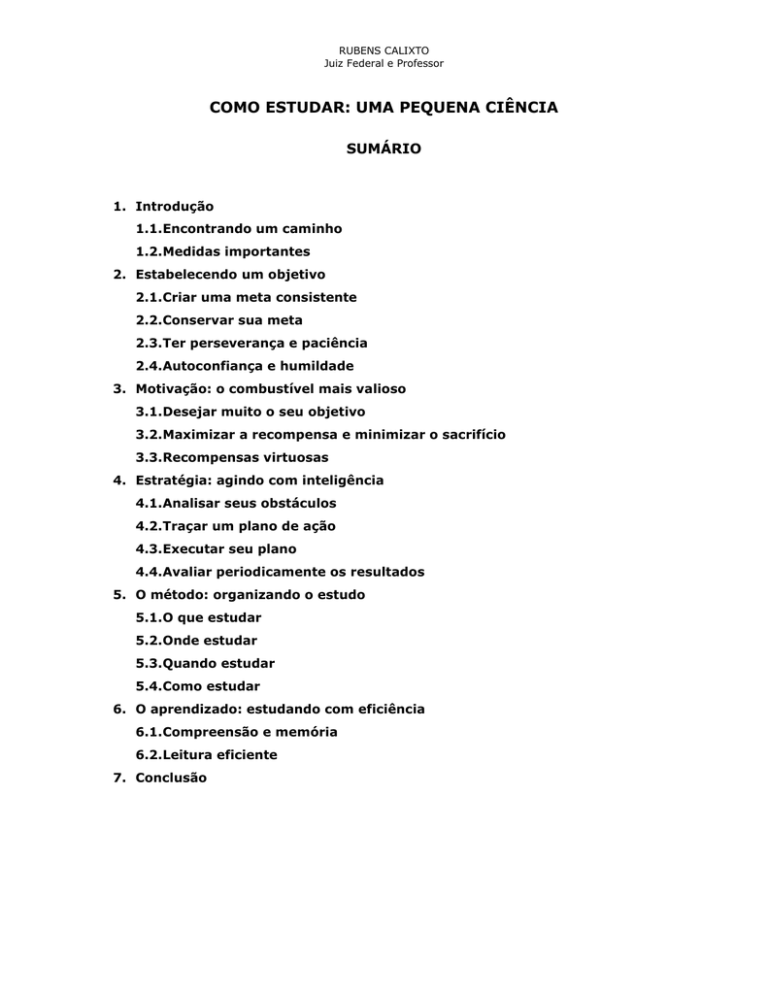 RUBENS CALIXTO Juiz Federal e Professor COMO ESTUDAR: UMA PEQUENA CIÊNCIA SUMÁRIO 1. Introdução 1.1.Encontrando um caminho 1.2.Medidas importantes 2. Estabelecendo um objetivo 2.1.Criar uma meta consistente 2.2.Conservar sua meta 2.3.Ter perseverança e paciência 2.4.Autoconfiança e humildade 3. Motivação: o combustível mais valioso 3.1.Desejar muito o seu objetivo 3.2.Maximizar a recompensa e minimizar o sacrifício 3.3.Recompensas virtuosas 4. Estratégia: agindo com inteligência 4.1.Analisar seus obstáculos 4.2.Traçar um plano de ação 4.3.Executar seu plano 4.4.Avaliar periodicamente os resultados 5. O método: organizando o estudo 5.1.O que estudar 5.2.Onde estudar 5.3.Quando estudar 5.4.Como estudar 6. O aprendizado: estudando com eficiência 6.1.Compreensão e memória 6.2.Leitura eficiente 7. Conclusão RUBENS CALIXTO Juiz Federal e Professor 1. INTRODUÇÃO 1.1. ENCONTRANDO UM CAMINHO Estudar com eficiência é uma preocupação que atravessa os séculos desde que Gutenberg inventou a imprensa, por volta do ano 1450, e a busca do conhecimento se expandiu de forma inusitada com a massificação da leitura. Todavia, se os livros ficaram ao alcance de todos – ou quase todos –, o estudo eficiente não se vulgarizou na mesma proporção, pois muitos não conseguem extrair da leitura tudo que ela pode oferecer. A quantidade de horas ou dias devotados aos estudos não é um parâmetro seguro do proveito do que se estudou. Estudar muito nem sempre equivale a estudar bem. Estudar com qualidade é uma pequena ciência que muitos não dominam, às vezes, por falta de orientação. Vamos tentar abordar um pouco deste universo, contando com a preciosa contribuição de algumas ciências auxiliares como a Filosofia, a Psicologia Cognitiva e a Pedagogia. A Filosofia cuida do próprio conhecimento, em si. Em sua definição mais aceita, busca conhecer tudo que nos cerca, mediante a utilização do intelecto humano. Sobre a antiga disputa filosófica entre racionalistas (que fundam o conhecimento no intelecto) e empiristas (que atribuem o conhecimento à experiência), BATTISTA MONDIN, na obra Introdução à filosofia, pontua que o conhecimento necessita de ambos, pois “qualquer ação, para não ser cega e boba, precisa ser guiada, iluminada por um pensamento que a dirige”. Neste sentido, a busca do estudo eficiente não deve ser pautada pura e exclusivamente na intensa dedicação do estudante. Esta ação 2 RUBENS CALIXTO Juiz Federal e Professor precisa também ser guiada por informações que possam conduzir a um bom resultado. 1.2. MEDIDAS IMPORTANTES O passo inaugural para estudar com boa qualidade é definir e analisar precisamente o objeto do estudo. O que vamos estudar? Em que contexto? Com que finalidade? Qual a sua extensão? A motivação também é imprescindível para que se extraia do estudo o melhor que ele pode oferecer. Conforme veremos, este fator é preponderante para o sucesso acadêmico ou em qualquer outra atividade humana. Definir uma boa estratégia de estudo também contribui bastante para o sucesso da empreitada, pois, sem um plano de ação, a dedicação ao estudo será um tanto quanto “cega”. Importante, ainda, é estabelecer um bom método de estudo, para que cada minuto dedicado a essa atividade proporcione o melhor rendimento possível. Finalmente, precisamos tratar com carinho do melhor amigo do nosso aprendizado: nosso cérebro. Sob este aspecto, existem importantes informações da Psicologia Cognitiva sobre as principais operações do conhecimento: apreensão, codificação, organização, armazenamento e recuperação das informações. Tratemos de cada um destes fatores nos tópicos seguintes deste texto. 3 RUBENS CALIXTO Juiz Federal e Professor 2. ESTABELECENDO UM OBJETIVO 2.1. CRIAR UMA META CONSISTENTE Pode até soar banal, mas estabelecer uma meta consistente é fundamental para o sucesso nos estudos, principalmente quando se trata de um projeto ambicioso, como a aprovação em disputados concursos públicos. MORGAN e DEESE afirmam, no clássico livro “Como estudar”, baseado em ampla pesquisa com universitários, que com um propósito bem definido o estudante achará mais fácil adquirir os hábitos e as habilidades necessárias a um estudo eficiente. Não é raro encontrar pessoas que se dedicam ao estudo sem uma definição do que realmente pretendem. Com este espírito, o estudante é um sério candidato a se transformar numa espécie de “zumbi acadêmico”, que vaga por aí sem saber exatamente o que busca. Esta postura descompromissada se torna um verdadeiro muro entre o estudante e o sucesso, pois não permite que ele tenha foco no que deve ser feito. Se não há foco em algo concreto, jamais conseguiremos ter um bom desempenho nos estudos ou em qualquer atividade, pois não estaremos suficientemente concentrados no que fazemos. Portanto, é imprescindível definir o alvo do nosso desejo, o que pode exigir orientações e aconselhamentos específicos. 2.2. CONSERVAR SUA META Tão importante quanto definir uma meta é conservá-la de forma obstinada. Não podemos negligenciá-la e nem substituí-la como trocamos de roupa. 4 RUBENS CALIXTO Juiz Federal e Professor Uma vez definido o nosso objetivo, temos que nos agarrar a ele e procurar cultivá-lo, salvo se houver ótimas razões para alguma mudança. Frequentemente, nos deparamos com pessoas que, ao menor pretexto, mudam de objetivo a cada mês ou mesmo semana, o que implode qualquer projeto de estudo. Esta fugacidade de objetivos certamente dificulta a aprovação em concursos ou coisa parecida, pelas mesmas razões que a falta deles nos prejudica: a ausência de foco e concentração no que é necessário ser feito. 2.3. PERSEVERANÇA E PACIÊNCIA Alguns atribuem a Shakespeare a frase “a paciência é a mãe de todas as virtudes”. Perseverança e paciência são realmente virtudes muito úteis frente a desafios árduos e duradouros. Em sua jornada, sempre 