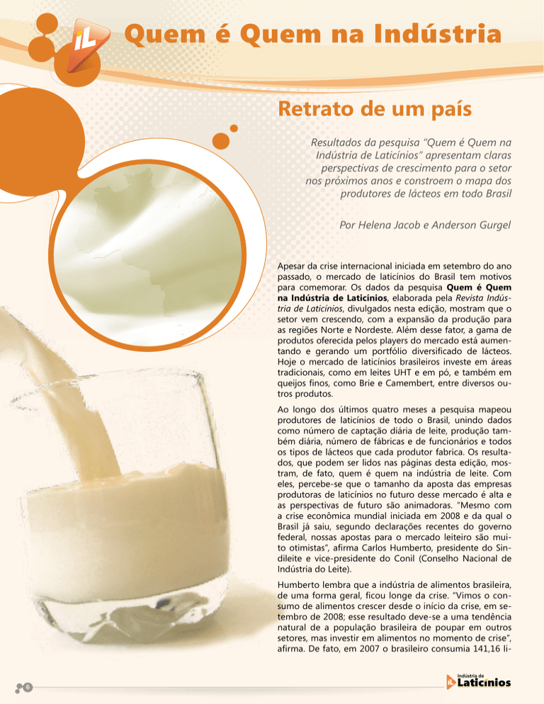 Quem é Quem na Indústria Retrato de um país Resultados da pesquisa “Quem é Quem na Indústria de Laticínios” apresentam claras perspectivas de crescimento para o setor nos próximos anos e constroem o mapa dos produtores de lácteos em todo Brasil Por Helena Jacob e Anderson Gurgel Apesar da crise internacional iniciada em setembro do ano passado, o mercado de laticínios do Brasil tem motivos para comemorar. Os dados da pesquisa Quem é Quem na Indústria de Laticínios, elaborada pela Revista Indústria de Laticínios, divulgados nesta edição, mostram que o setor vem crescendo, com a expansão da produção para as regiões Norte e Nordeste. Além desse fator, a gama de produtos oferecida pelos players do mercado está aumentando e gerando um portfólio diversificado de lácteos. Hoje o mercado de laticínios brasileiros investe em áreas tradicionais, como em leites UHT e em pó, e também em queijos finos, como Brie e Camembert, entre diversos outros produtos. Ao longo dos últimos quatro meses a pesquisa mapeou produtores de laticínios de todo o Brasil, unindo dados como número de captação diária de leite, produção também diária, número de fábricas e de funcionários e todos os tipos de lácteos que cada produtor fabrica. Os resultados, que podem ser lidos nas páginas desta edição, mostram, de fato, quem é quem na indústria de leite. Com eles, percebe-se que o tamanho da aposta das empresas produtoras de laticínios no futuro desse mercado é alta e as perspectivas de futuro são animadoras. “Mesmo com a crise econômica mundial iniciada em 2008 e da qual o Brasil já saiu, segundo declarações recentes do governo federal, nossas apostas para o mercado leiteiro são muito otimistas”, afirma Carlos Humberto, presidente do Sindileite e vice-presidente do Conil (Conselho Nacional de Indústria do Leite). Humberto lembra que a indústria de alimentos brasileira, de uma forma geral, ficou longe da crise. “Vimos o consumo de alimentos crescer desde o início da crise, em setembro de 2008; esse resultado deve-se a uma tendência natural de a população brasileira de poupar em outros setores, mas investir em alimentos no momento de crise”, afirma. De fato, em 2007 o brasileiro consumia 141,16 li- 6 de Laticínios Leite – Consumo Per Capita Aparente no Brasil – 1990-2008 150,0 140,0 127,97 litros / habitante 130,0 130,88 135,43 138,70 141,16 142,74 120,0 110,0 100,0 90,0 80,0 70,0 60,0 50,0 1990 1991 1992 1993 1994 1995 1996 1997 1998 1999 2000 2001 2002 2003 2004 2005 2006 2007* 2008* Anos Fonte Milkpoint-Ibge * Estimativa tros de leite por ano e em 2008, ele consumiu 142,74 litros, um aumento de 1,58 litros por habitante; o valor é de fato significativo para um mercado que, há 10 anos, consumia apenas 127 litros por habitante. Vale lembrar, no entanto, que o consumo do Brasil ainda tem muito potencial de crescimento. Na Argentina, por exemplo, o consumo atual é de 200 litros por habitante ao ano. Nem todos compartilham do otimismo de Humberto. Glauco Carvalho, economista e pesquisador da Embrapa Gado de Leite, diz que, apesar do bom desempenho, o período de crise foi sim um problema para produtores do setor no país, mas que, de fato, o consumo de lácteos aumentou no último ano. “Dois fatores são responsáveis por esse aumento: o primeiro é que o consumo de lácteos possui uma relação estreita com a renda per capita, ou seja, estados de maior renda per capita tendem a apresentar maior consumo, portanto, se a renda cresce o consumo também aumenta; o segundo fator é que as classes de renda mais baixas possuem maior propensão ao consumo, o que indica que os programas de transferência de renda e aumento real do salário mínimo tendem a impulsionar a demanda de lácteos”, explica. Rendimento médio mensal real do trabalho principal dos empregados e trabalhadores domésticos, de 10 anos ou mais de idade no trabalho principal da semana de referência, por categoria do emprego no trabalho principal Brasil – 2007-2008 Empregados com carteira de trabalho assinada 1 034 1 021 Militares e funcionários públicos estatutários 1 760 1 752 Outros empregados sem carteira de trabalho assinada 604 588 Trabalhadores domésticos com carteira de trabalho assinada 523 512 Trabalhadores domésticos sem carteira de trabalho assinada 300 292 2007 2008 Fonte Milkpoint-Ibge Aumento na renda É justamente por essa razão, afirma Carvalho, que há várias empresas do mercado investindo em produtos para as classes C, D e E. “Trata-se de uma grande parcela da 7 Quem é Quem população com consumo reprimido e que tem conseguido melhoria de condições de vida”, pontua. De fato, o último resultado da PNAD (Pesquisa Nacional por Amostra de Domicílios), do IBGE (Instituto Brasileiro de Geografia e Estatística), mostrou essa evolução, com o aumento significativo do rendimento mensal dos trabalhadores brasileiros, especialmente nos estados da Região Norte e Região Nordeste do Brasil. Rendimento – Pessoas ocupadas Rendimento médio mensal real de todos os trabalhos das pessoas de 10 anos ou mais de idade, ocupadas na semana de referência, com rendimento de trabalho, por sexo, segundo as Unidades da Federação – 2007-2008 Unidades da Federação Rendimento médio mensal real de todos os trabalhos das pessoas de 10 anos ou mais de idade, ocupadas na semana de referência, com rendimento de trabalho (R$) Total Homens Mulheres 1 019 1 153 823 914 969 815 1 022 1 092 915 922 987 819 2007 Brasil Rondônia Acre Amazonas Roraima 814 865 732 Pará 774 851 634 Amapá 973 1 015 911 Tocantins 820 933 650 Maranhão 624 713 489 Piauí 584 624 519 Ceará 584 640 499 Rio Grande do Norte 739 808 633 Paraiba 699 747 619 Pernambuco 660 703 586 Alagoas 718 801 570 Sergipe 713 807 584 Bahia 653 710 558 Minas Gerais 807 1 038 713 Espírito Santo 995 1 177 729 Rio de Janeiro 1 209 1 395 963 São Paulo 1 288 1 508 1 021 Paraná 1 161 1 369 863 Santa Catarina 1 205 1 390 