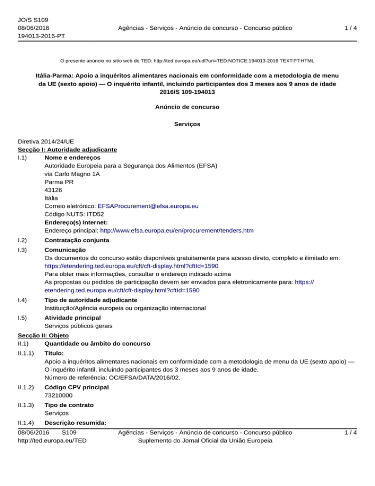 JO/S S109 08/06/2016 194013-2016-PT Agências - Serviços - Anúncio de concurso - Concurso público 1/4 O presente anúncio no sítio web do TED: http://ted.europa.eu/udl?uri=TED:NOTICE:194013-2016:TEXT:PT:HTML Itália-Parma: Apoio a inquéritos alimentares nacionais em conformidade com a metodologia de menu da UE (sexto apoio) — O inquérito infantil, incluindo participantes dos 3 meses aos 9 anos de idade 2016/S 109-194013 Anúncio de concurso Serviços Diretiva 2014/24/UE Secção I: Autoridade adjudicante I.1) Nome e endereços Autoridade Europeia para a Segurança dos Alimentos (EFSA) via Carlo Magno 1A Parma PR 43126 Itália Correio eletrónico: [email protected] Código NUTS: ITD52 Endereço(s) Internet: Endereço principal: http://www.efsa.europa.eu/en/procurement/tenders.htm I.2) Contratação conjunta I.3) Comunicação Os documentos do concurso estão disponíveis gratuitamente para acesso direto, completo e ilimitado em: https://etendering.ted.europa.eu/cft/cft-display.html?cftId=1590 Para obter mais informações, consultar o endereço indicado acima As propostas ou pedidos de participação devem ser enviados para eletronicamente para: https:// etendering.ted.europa.eu/cft/cft-display.html?cftId=1590 I.4) Tipo de autoridade adjudicante Instituição/Agência europeia ou organização internacional I.5) Atividade principal Serviços públicos gerais Secção II: Objeto II.1) Quantidade ou âmbito do concurso II.1.1) Título: Apoio a inquéritos alimentares nacionais em conformidade com a metodologia de menu da UE (sexto apoio) — O inquérito infantil, incluindo participantes dos 3 meses aos 9 anos de idade. Número de referência: OC/EFSA/DATA/2016/02. II.1.2) Código CPV principal 73210000 II.1.3) Tipo de contrato Serviços II.1.4) Descrição resumida: 08/06/2016 S109 http://ted.europa.eu/TED Agências - Serviços - Anúncio de concurso - Concurso público Suplemento do Jornal Oficial da União Europeia 1/4 JO/S S109 08/06/2016 194013-2016-PT Agências - Serviços - Anúncio de concurso - Concurso público 2/4 O objetivo do presente concurso consiste na adjudicação de contratos de serviços diretos a organizações dos Estados-Membros da UE, Albânia, antiga República jugoslava da Macedónia, Bósnia-Herzegovina, Islândia, Listenstaine, Montenegro, Noruega, Sérvia e Suíça, que têm um mandato governamental para realizar um inquérito alimentar a nível nacional no período entre 2016 e 2021 ou 2017 e 2022 e um inquérito alimentar nacional que não tenha sido realizado no país nos 5 últimos anos para o grupo-alvo previsto. A EFSA adjudicará tantos contratos individuais quanto possível com um orçamento de 225 000 EUR, que a EFSA tem disponível para apoiar inquéritos alimentares nacionais em conformidade com a metodologia de menu da UE da EFSA. Existe ainda a possibilidade de o orçamento global da EFSA para apoiar os inquéritos alimentares nacionais em conformidade com a metodologia de menu da UE da EFSA ser aumentado em 2016/2017. O limite superior de 165 000 EUR constitui o valor máximo e qualquer proposta que exceda este valor máximo não será mantida para adjudicação do contrato. II.1.5) Valor total estimado Valor sem IVA: 225 000.00 EUR II.1.6) Informação sobre os lotes Contrato dividido em lotes: não II.2) Descrição II.2.1) Título: II.2.2) Código(s) CPV adicional(is) II.2.3) Local de execução Código NUTS: IT Local principal de execução: Instalações do contratante. II.2.4) Descrição do concurso: Tal como indicado na documentação do concurso. II.2.5) Critérios de adjudicação O preço não é o único critério de adjudicação e todos os critérios se encontram enunciados apenas na documentação do concurso II.2.6) Valor estimado Valor sem IVA: 225 000.00 EUR II.2.7) Duração do contrato, acordo-quadro ou sistema de aquisição dinâmico Duração em meses: 54 O contrato é passível de recondução: não II.2.10) Informação sobre as variantes São aceites variantes: não II.2.11) Informação sobre as opções Opções: não II.2.12) Informação relativa a catálogos eletrónicos II.2.13) Informação sobre os fundos da União Europeia O contrato está relacionado com um projeto e/ou programa financiado por fundos da União Europeia: não II.2.14) Informação adicional 08/06/2016 S109 http://ted.europa.eu/TED Agências - Serviços - Anúncio de concurso - Concurso público Suplemento do Jornal Oficial da União Europeia 2/4 JO/S S109 08/06/2016 194013-2016-PT Agências - Serviços - Anúncio de concurso - Concurso público 3/4 A documentação do concurso estará disponível para ser descarregada no endereço indicado no ponto I.3. O sítio Web será atualizado regularmente e os proponentes deverão inteirar-se de todas as atualizações e alterações efetuadas durante o período de concurso. O presente concurso está aberto, sem criar um precedente ou obrigação para o futuro, também aos proponentes do seguinte país: Suíça. Secção III: Informação de carácter jurídico, económico, financeiro e técnico III.1) Condições de participação III.1.1) Habilitação para o exercício da atividade profissional, incluindo requisitos em matéria de inscrição em registos profissionais ou comerciais Lista e breve descrição das condições: Consultar a documentação do concurso. III.1.2) Capacidade económica e financeira Lista e breve descrição dos critérios de seleção: Consultar a documentação do concurso. III.1.3) Capacidade técnica e profissional Lista e breve descrição dos critérios de seleção: Consultar a documentação do concurso. III.1.5) Informação sobre contratos reservados III.2) Condições relacionadas com o contrato III.2.1) Informação sobre uma profissão específica III.2.2) Condições de execução do contrato: Consultar a documentação do concurso. III.2.3) Informação sobre o pessoal responsável pela execução do contrato Secção IV: Procedimento IV.1) Descrição IV.1.