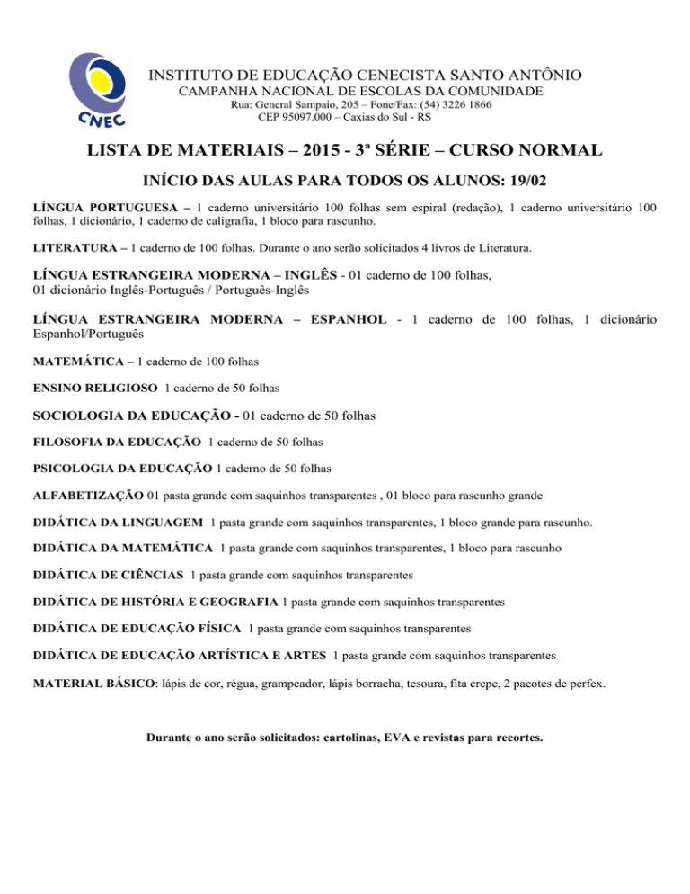 INSTITUTO DE EDUCAÇÃO CENECISTA SANTO ANTÔNIO CAMPANHA NACIONAL DE ESCOLAS DA COMUNIDADE Rua: General Sampaio, 205 – Fone/Fax: (54) 3226 1866 CEP 95097.000 – Caxias do Sul - RS LISTA DE MATERIAIS – 2015 - 3ª SÉRIE – CURSO NORMAL INÍCIO DAS AULAS PARA TODOS OS ALUNOS: 19/02 LÍNGUA PORTUGUESA – 1 caderno universitário 100 folhas sem espiral (redação), 1 caderno universitário 100 folhas, 1 dicionário, 1 caderno de caligrafia, 1 bloco para rascunho. LITERATURA – 1 caderno de 100 folhas. Durante o ano serão solicitados 4 livros de Literatura. LÍNGUA ESTRANGEIRA MODERNA – INGLÊS - 01 caderno de 100 folhas, 01 dicionário Inglês-Português / Português-Inglês LÍNGUA ESTRANGEIRA MODERNA – ESPANHOL - 1 caderno de 100 folhas, 1 dicionário Espanhol/Português MATEMÁTICA – 1 caderno de 100 folhas ENSINO RELIGIOSO 1 caderno de 50 folhas SOCIOLOGIA DA EDUCAÇÃO - 01 caderno de 50 folhas FILOSOFIA DA EDUCAÇÃO 1 caderno de 50 folhas PSICOLOGIA DA EDUCAÇÃO 1 caderno de 50 folhas ALFABETIZAÇÃO 01 pasta grande com saquinhos transparentes , 01 bloco para rascunho grande DIDÁTICA DA LINGUAGEM 1 pasta grande com saquinhos transparentes, 1 bloco grande para rascunho. DIDÁTICA DA MATEMÁTICA 1 pasta grande com saquinhos transparentes, 1 bloco para rascunho DIDÁTICA DE CIÊNCIAS 1 pasta grande com saquinhos transparentes DIDÁTICA DE HISTÓRIA E GEOGRAFIA 1 pasta grande com saquinhos transparentes DIDÁTICA DE EDUCAÇÃO FÍSICA 1 pasta grande com saquinhos transparentes DIDÁTICA DE EDUCAÇÃO ARTÍSTICA E ARTES 1 pasta grande com saquinhos transparentes MATERIAL BÁSICO: lápis de cor, régua, grampeador, lápis borracha, tesoura, fita crepe, 2 pacotes de perfex. Durante o ano serão solicitados: cartolinas, EVA e revistas para recortes.