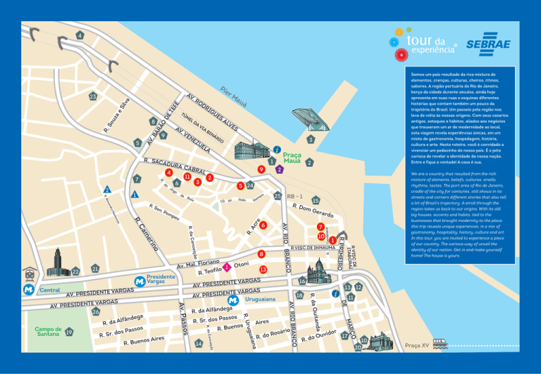 4 OD AV .V BI AL VE S RI O 3 LA CAB R AL 3 6 em 25 5 24 Bo la LD. do m Ho João RB - 1 dre Se 13 Central 10 1 R.VISC.DE INHAUMA We are a country that resulted from the rich mixture of elements, beliefs, cultures, smells, rhythms, tastes. The port area of Rio de Janeiro, cradle of the city for centuries, still shows in its streets and corners different stories that also tell a bit of Brazil’s trajectory. A stroll through the region takes us back to our origins. With its old big houses, accents and habits, tied to the businesses that brought modernity to the place, this trip reveals unique experiences, in a mix of gastronomy, hospitality, history, culture and art. In this tour, you are invited to experience a piece of our country. The carioca way of unveil the identity of our nation. Get in and make yourself home! The house is yours. 16 13 12 DE ÇO idor 17 Ouv R. do 11 MAR a uitand O AV. RIO BRANC o sári o R o R. d R. da Q 18 Aires iana ão 14 a rugu R. U os Av. Pass ega R. da Alfând Passos R. Sr. dos os R. Buen 7 R.VISC.DE ITABORAÍ Otoni TE VARGAS N E D I S E R P . AV NTE VARGAS AV. PRESIDE Uruguaiana onceiç R. da C TE VARGAS AV. PRESIDEN TE VARGAS N E ID S E R P . V A 26 ndega â f l A R. da os Campo de s Pass o d . r Santana 19 R. S os Aires R. Buen Floriano Av. Mal. ilo 1 f o e T R. rard o R. PRIMEIRO 8 o Presidente Vargas 6 CO AV. RIO BRAN nceiçã o in er o R. da C m Ca Ac re peu R. zie n cke Ma m Ge n. P om 21 15 R. Do Candelária xan Ale 22 2 R. R. da 9 2 Jo g 1 Praça Mauá 2 1 11 o R. á NÁ UE R. 2 A EZ 4 do VI EN R. SAC ADUR A 7 LD A Ma u R. TE AV .B AR ÃO NE 9 5 RI GU ES TÚ DE ae uz R. So 8 er AV .R FÉ Si lva 23 Pí Somos um país resultado da rica mistura de elementos, crenças, culturas, cheiros, ritmos, sabores. A região portuária do Rio de Janeiro, berço da cidade durante séculos, ainda hoje apresenta em suas ruas e esquinas diferentes histórias que contam também um pouco da trajetória do Brasil. Um passeio pela região nos leva de volta às nossas origens. Com seus casarios antigos, sotaques e hábitos, aliados aos negócios que trouxeram um ar de modernidade ao local, esta viagem revela experiências únicas, em um misto de gastronomia, hospedagem, história, cultura e arte. Neste roteiro, você é convidado a vivenciar um pedacinho do nosso país. É o jeito carioca de revelar a identidade da nossa nação. Entre e fique a vontade! A casa é sua. 10 20 Praça XV O Porto e seus Encantos Crepê do Bisavô, Cadeado do Amor e Boas Lembranças 1 6 Oficina de Degustação de Caipirinha 2 Feijoada Invertida 5 Tropical Submarine 1 Coleção Angu do Gomes 2 Cores e Tempero: Nhoque, Bacalhau e Especiarias Feijoada, Samba e Sal com Alecrim PoeMaria: Poemas, Vinho e Bolinho de Bacalhau 3 Café da Tarde à la Carioca Atrativos | Attractions 21 Palácio Itamaraty | Itamaraty Palace 1 Museu de Arte do Rio - MAR | Rio Museum of Art 22 Palácio Duque de Caxias | Duque de Caxias Palace Praça Mauá | Mauá Square 23 Moinho Fluminense | Fluminense Mill 2 24 Igreja São Francisco da Prainha | São Francisco da Prainha Church 3 Museu do Amanhã | Museum of Tomorrow 25 Edifício A Noite | A Noite Building 4 AquaRio - Aquário Marinho do Rio de Janeiro 26 Biblioteca Parque | Library Park 13 4 9 Cantinho da Selfie Café com Mãe Benta 1 10 Conexão Rio Pequena África 2 Prazeres Espanhóis com Sotaque Carioca Bolo de Banana na Caneca 7 Menú Degustação: Bacalhau e Vinho Caldinho de Feijão e Samba de Raiz 1 História em Detalhes Graciosos Bares & Restaurantes | Bars and Restaurants 1 2 8 Endereço | Adress : Rua Miguel Couto, 121 Tel.: (21) 2233-3515 E-mail: [email protected] Site: www.malaga.com.br Seg-Sex, 11h às 20h Mon-Fri, 11am to 8pm Yellow Submarine Endereço | Adress : Rua da Candelária, 85 Tel.: (21) 2253-6886 E-mail: [email protected] Site: www.restauranteyellowsubmarine.com.br Seg-Sex, 11:30h às 15:30h Mon-Fri, 11:30am to 3:30pm 9 Cais do Valongo | Valongo Wharf 6 Pedra do Sal 7 Jardim Suspenso do Valongo | Valongo Garden 8 Espaço Meu Porto Maravilha | My Porto Maravilha Exhibit Hall 9 Galpão da Cidadania | Citizenship Barn 10 Hotéis | Hotels 1 Pompeu Rio Hotel Endereço | Adress : Rua Camerino, 15 Tel. : (21) 2263-2435 E-mail: [email protected] www.rederiohoteis.com.br 2 Gamboa Rio Hotel Paço Imperial | Paço Imperial Cultural Center Espaço Cultural Correios | Post Office Cultural Center 12 Casa França Brasil | France Brazil House 13 Centro Cultural Banco do Brasil - CCBB | Banco do Brasil Cultural Center 14 Real Gabinete Português | Portuguese Royal Cabinet of Literature 15 Mosteiro de São Bento | São Bento Monastery 16 Igreja de Nossa Senhora da Candelária | Candelária Church 17 Igreja de Nossa Senhora do Monte Carmo da Antiga Sé | Nossa Senhora do Carmo da Antiga Sé Church 18 Igreja Nossa Senhora Mãe dos Homens | Nossa Senhora Mãe dos Homens Church 19 Campo de Santana | Praça da República | Attractions 20 Palácio Tiradentes | Tiradentes Palace 3 1 4 Chapelaria A Esmeralda Endereço | Adress : Av. Marechal Floriano, 32 Tel.: (21) 2516-4220 E-mail: [email protected] Site: www.enotecadoc.com.br Seg-Sex, 10h às 20h Mon-Fri, 10am to 8pm 5 Visitas Guiadas | Tours 1 Find Your Rio 6 Tel.: (21) 99639-7131 , (21) 98705-1980 E-mail: [email protected] Ponto de encontro | Meeting point: MAR | Rio Museum of Art Duração | Duration : 03 horas | Hours www.findyourrio.com 2 Florêncios Turismo Tel.: (21) 96486-0049 E-mail: [email protected] Ponto de encontro | Meeting point: Praça Mauá Duração | Duration : 03 horas | Hours Armazém Zero4 11 Endereço | Adress : Rua Argemiro Bulção, 35 Tel.: (21) 2283-2047 E-mail: [email protected] Diariamente, 17h às 1h Daily, 17pm to 1am 12 Sacabral Art Gallery Endereço | Adress : Rua Sacadura Cabral, 63 A Tel.: (21) 2233-6030 E-mail: [email protected] Diariamente, 11:30h às 15:30h Daily, 11:30am to 3:30pm Creperia Cliché Endereço | Adress : Rua Acre, 47 Bela Carioca Endereço | Adress : Rua da Candelária, 9