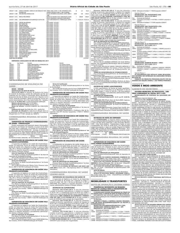 quinta-feira, 27 de abril de 2017 Diário Oficial da Cidade de São Paulo 29/03/2017 31.082 CIRÚRGICA FERNANDES- COMERCIO DE MAT.CIRÚRGICOS E HOSP. LÂMINA, VIDRO, 26 MM X 76 MM, EXTREMIDADE FOSCA, SOCIEDADE LTDA LAPIDADA, ESPESSURA 0,8 MM A 1,3 MM, 50 UNIDADES 29/03/2017 31.089 INJEX INDUSTRIAS CIRURGICAS LTDA AGULHA HIPODÉRMICA DESCARTAVEL ESTÉRIL 40MM X 12MM 06/03/2017 23.573 MARCELO PIRES HENRIQUE DESPESAS DE PEQUENO VULTO E MANUTENÇÃO DE BENS MÓVEIS, CONSERVAÇÃO E ADAPTAÇÃO DE BENS IMÓVEIS 22/03/2017 29.056 COOK EMPREENDIMENTOS EM ALIMENTAÇÃO COLETIVA LTDA. VALOR COMPLEMENTAR REF. À PRORROGAÇÃO CONTRATUAL 28/03/2017 30.445 CAROLINE LIMA MURAKAMI BOLSA SALÁRIO - GO R1/2017 28/03/2017 30.446 DEISY SEWRUK TRIZI BOLSA SALÁRIO - GO R1/2017 28/03/2017 30.448 FERNANDA BARBOSA BOLSA SALÁRIO - GO R1/2017 28/03/2017 30.449 HELENA GAETA BENDER BOLSA SALÁRIO - GO R1/2017 28/03/2017 30.450 JANAYNE CRISTINA PEREIRA DE OLIVEIRA BOLSA SALÁRIO - GO R1/2017 28/03/2017 30.451 JOSE HENRIQUE KLEIN DE OLIVEIRA BOLSA SALÁRIO - GO R1/2017 28/03/2017 30.452 LILA RAMOS CASTELO BRANCO BOLSA SALÁRIO - GO R1/2017 28/03/2017 30.454 LIVIA COMINATO BERGO BOLSA SALÁRIO - GO R1/2017 28/03/2017 30.455 MARIANA BARALDI MAFRA BOLSA SALÁRIO - GO R1/2017 28/03/2017 30.456 PRISCILA MEDEIROS GOMES DA SILVA BOLSA SALÁRIO - GO R1/2017 28/03/2017 30.457 RAISSA MARITAN SILVA SOUZA BOLSA SALÁRIO - GO R1/2017 28/03/2017 30.458 RAYSSA AZEVEDO HUMMEL MENDONÇA BOLSA SALÁRIO - GO R1/2017 28/03/2017 30.459 SARAH ZANOTTO SABBA GUIMARAES BOLSA SALÁRIO - GO R1/2017 28/03/2017 30.461 FLAVIA PAIVA PRUDENTE DE MORAES BOLSA SALÁRIO - NEO R3/2017 28/03/2017 30.462 GIOVANNA STEFANI JACKSON BOLSA SALÁRIO - NEO R3/2017 28/03/2017 30.473 MAIRA FERREIRA LAMEIRA FRANÇA BOLSA SALÁRIO - GO R1/2017 28/03/2017 30.476 KAREN LEMOS DOS SANTOS BOLSA SALÁRIO - NEO R3/2017 28/03/2017 30.478 KARYNA GENOVESE GALETTI BOLSA SALÁRIO - NEO R3/2017 28/03/2017 30.480 LETICIA DE ARAUJO FRANCO BOLSA SALÁRIO - NEO R3/2017 28/03/2017 30.481 LIVIA MARCELA GARCIA DE FREITAS SANTOS BOLSA SALÁRIO - NEO R3/2017 28/03/2017 30.485 RAFAEL MACIEL BRITO BOLSA SALÁRIO - NEO R3/2017 28/03/2017 30.490 MAYARA APARECIDA ROSÁRIO DE OLIVEIRA BOLSA SALÁRIO - NEO R3/2017 28/03/2017 30.491 GUILHERME POLIDO PEREIRA BOLSA SALÁRIO - MASTO R1/2017 28/03/2017 30.493 LUCAS DE ALMEIDA TOSI BOLSA SALÁRIO - ENDO R4/2017 28/03/2017 30.496 LUIZA QUEIROZ SENA BOLSA SALÁRIO - ENDO R4/2017 VALOR TOTAL DOS EMPENHOS 30 3,51 105,30 45.000 0,06 2.654,55 1 4.000,00 4.000,00 1 1.192.651,94 1.192.651,94 1 1 1 1 1 1 1 1 1 1 1 1 1 1 1 1 1 1 1 1 1 1 1 1 1 3.376,95 3.376,95 3.376,95 3.376,95 3.376,95 3.376,95 3.376,95 3.376,95 3.376,95 3.376,95 3.376,95 3.376,95 3.376,95 3.376,95 3.376,95 3.376,95 3.376,95 3.376,95 3.376,95 3.376,95 3.376,95 3.376,95 3.376,95 3.376,95 3.376,95 3.376,95 3.376,95 3.376,95 3.376,95 3.376,95 3.376,95 3.376,95 3.376,95 3.376,95 3.376,95 3.376,95 3.376,95 3.376,95 3.376,95 3.376,95 3.376,95 3.376,95 3.376,95 3.376,95 3.376,95 3.376,95 3.376,95 3.376,95 3.376,95 3.376,95 2.345.550,67 EMPENHOS CANCELADOS NO MÊS DE MARÇO DE 2017 Data Canc. Empenho Fornecedor 13/03/2017 11716 GASBALL ARMAZENADORA E DISTRIBUIDORA LTDA 28/03/2017 12119 ANDRESSA DE CASTRO SILVA 28/03/2017 12120 DANIELLE VERISSIMO IMPERADOR 28/03/2017 12121 ERIKA TIYOKO HORDIUCHE 28/03/2017 12122 GUILHERME NICOLAU CAMARA 28/03/2017 12123 LUCAS DE ALMEIDA TOSI 28/03/2017 12124 LUIZ HENRIQUE DE SIQUEIRA SPINGARN 28/03/2017 12125 MANOELA DOS SANTOS MEZZACAPPA 28/03/2017 12126 MARIANA FEITOSA ROSETTI 28/03/2017 12127 NARA DO CARMO MOREIRA VIEIRA 28/03/2017 12128 NAYANNE SILVA DA FONSECA VALOR TOTAL DOS EMPENHOS CANCELADOS COORDENAÇÃO DE VIGILÂNCIA EM SAÚDE GCCZ – SVCAD NOTIFICAÇÃO DE AUTO DE MULTA 2015-0.161.606-0 A Gerente, da Gerência do Centro de Controle de Zoonoses, usando das atribuições que lhe são conferidas por Lei, notifica o interessado abaixo identificado, da lavratura de Auto de Multa, de acordo com o disposto na Lei 13725, sendo-lhe facultado o direito de protocolar recurso por escrito nesta Gerência, sito à Rua Santa Eulália, 86 – Santana, no prazo de 10 (dez) dias a contar da presente publicação. Número do processo: 2015-0.161.606-0 Número do Auto de Multa: 64-002.231-6 Nome do infrator: CLÁUDIO ROBERTO DA CONCEIÇÃO TEIXEIRA Endereço do Local: Rua Índio Peri, 910 – Jardim Peri Descrição da infração:Em razão da (s) infração (ões) ao (s) dispositivo (s) legal (is) descrita (s) e indicado (s) no Auto de Infração Série G nº: 11421, lavrado aos 18/06/15. COORDENADORIA REGIONAL DE SAÚDE SUDESTE Descrição Gás Liquefeito de Petróleo Bolsa-Auxílio Residência Médica Bolsa-Auxílio Residência Médica Bolsa-Auxílio Residência Médica Bolsa-Auxílio Residência Médica Bolsa-Auxílio Residência Médica Bolsa-Auxílio Residência Médica Bolsa-Auxílio Residência Médica Bolsa-Auxílio Residência Médica Bolsa-Auxílio Residência Médica Bolsa-Auxílio Residência Médica 561.600,00 562,83 562,83 562,83 562,83 562,83 562,83 562,83 562,83 562,83 562,83 567.228,30 Termo de Inutilização Proc./Nome ou Razão Social/Endereço/Série-nº do Termo de Desinterdição 2017-0.062.079-3/Carlos José de Souza 52099148368 /Rua dos Ciclames, 167/F-nº 025792/ Inutilização de Produto. SUPERVISÃO DE VIGILÂNCIA EM SAÚDE VILA PRUDENTE/SAPOPEMBA A Supervisão de Vigilância em Saúde Vila Prudente/Sapopemba, da Supervisão Técnica de Saúde Vila Prudente/Sapopemba, de acordo com o disposto no artigo 1º, inciso IV, artigo 140, 145 e 149 da Lei Municipal 13.725 de 09/01/2004, torna públicos os seguintes despachos e procedimentos administrativos relativos a infração sanitária: Auto de Imposição de Penalidade Proc./Nome ou Razão Social/Endereço/Série-nº do Auto de Imposição de Penalidade/Penalidade 2017-0.028.804-7/Panificadora e Confeitaria Líder de Sapopemba Ltda EPP /Avenida Sapopemba, 7.740/H-nº 009052/ Advertência. SUPERVIS