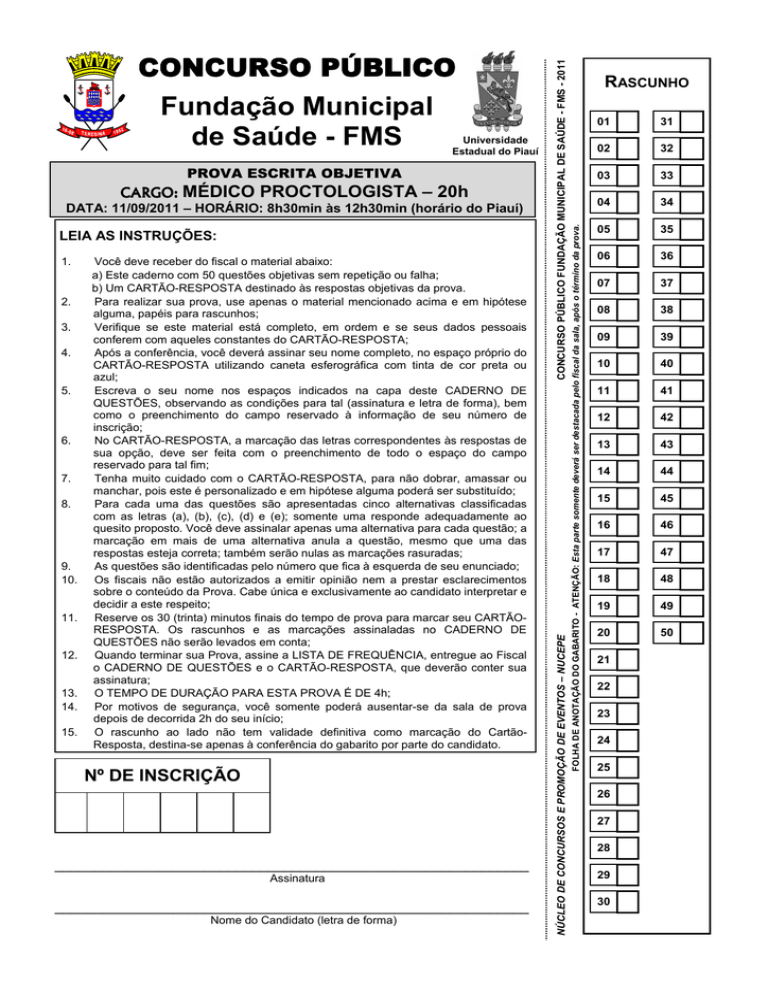 PROVA ESCRITA OBJETIVA CARGO: MÉDICO PROCTOLOGISTA – 20h DATA: 11/09/2011 – HORÁRIO: 8h30min às 12h30min (horário do Piauí) LEIA AS INSTRUÇÕES: 1. 2. 3. 4. 5. 6. 7. 8. 9. 10. 11. 12. 13. 14. 15. Você deve receber do fiscal o material abaixo: a) Este caderno com 50 questões objetivas sem repetição ou falha; b) Um CARTÃO-RESPOSTA destinado às respostas objetivas da prova. Para realizar sua prova, use apenas o material mencionado acima e em hipótese alguma, papéis para rascunhos; Verifique se este material está completo, em ordem e se seus dados pessoais conferem com aqueles constantes do CARTÃO-RESPOSTA; Após a conferência, você deverá assinar seu nome completo, no espaço próprio do CARTÃO-RESPOSTA utilizando caneta esferográfica com tinta de cor preta ou azul; Escreva o seu nome nos espaços indicados na capa deste CADERNO DE QUESTÕES, observando as condições para tal (assinatura e letra de forma), bem como o preenchimento do campo reservado à informação de seu número de inscrição; No CARTÃO-RESPOSTA, a marcação das letras correspondentes às respostas de sua opção, deve ser feita com o preenchimento de todo o espaço do campo reservado para tal fim; Tenha muito cuidado com o CARTÃO-RESPOSTA, para não dobrar, amassar ou manchar, pois este é personalizado e em hipótese alguma poderá ser substituído; Para cada uma das questões são apresentadas cinco alternativas classificadas com as letras (a), (b), (c), (d) e (e); somente uma responde adequadamente ao quesito proposto. Você deve assinalar apenas uma alternativa para cada questão; a marcação em mais de uma alternativa anula a questão, mesmo que uma das respostas esteja correta; também serão nulas as marcações rasuradas; As questões são identificadas pelo número que fica à esquerda de seu enunciado; Os fiscais não estão autorizados a emitir opinião nem a prestar esclarecimentos sobre o conteúdo da Prova. Cabe única e exclusivamente ao candidato interpretar e decidir a este respeito; Reserve os 30 (trinta) minutos finais do tempo de prova para marcar seu CARTÃORESPOSTA. Os rascunhos e as marcações assinaladas no CADERNO DE QUESTÕES não serão levados em conta; Quando terminar sua Prova, assine a LISTA DE FREQUÊNCIA, entregue ao Fiscal o CADERNO DE QUESTÕES e o CARTÃO-RESPOSTA, que deverão conter sua assinatura; O TEMPO DE DURAÇÃO PARA ESTA PROVA É DE 4h; Por motivos de segurança, você somente poderá ausentar-se da sala de prova depois de decorrida 2h do seu início; O rascunho ao lado não tem validade definitiva como marcação do CartãoResposta, destina-se apenas à conferência do gabarito por parte do candidato. Nº DE INSCRIÇÃO ____________________________________________________________ Assinatura ____________________________________________________________ Nome do Candidato (letra de forma) CONCURSO PÚBLICO FUNDAÇÃO MUNICIPAL DE SAÚDE - FMS - 2011 Universidade Estadual do Piauí RASCUNHO FOLHA DE ANOTAÇÃO DO GABARITO - ATENÇÃO: Esta parte somente deverá ser destacada pelo fiscal da sala, após o término da prova. Fundação Municipal de Saúde - FMS NÚCLEO DE CONCURSOS E PROMOÇÃO DE EVENTOS – NUCEPE CONCURSO PÚBLICO 01 31 02 32 03 33 04 34 05 35 06 36 07 37 08 38 09 39 10 40 11 41 12 42 13 43 14 44 15 45 16 46 17 47 18 48 19 49 20 50 21 22 23 24 25 26 27 28 29 30 N º D E I N S C R I Ç Ã O Concurso Público – Fundação Municipal de Saúde – CARGO: MÉDICO PROCTOLOGISTA – 20h 2 QUESTÕES DE LÍNGUA PORTUGUESA TEXTO I (Para as questões de 01 a 07). Decifrando códigos 01 Pessoas que já vivenciaram um terremoto costumam ter lembranças claras dessa 02 experiência: o solo vibra, treme, fica abaulado e se desloca; o ar se enche de estrondos; abrem-se 03 rachaduras; e vidros se estilhaçam; armários se abrem; livros, pratos e bugigangas caem das 04 prateleiras. Esses episódios são lembrados com notável clareza mesmo anos depois, porque nosso 05 cérebro evoluiu para fazer isto: extrair informação de eventos relevantes e tal conhecimento para 06 guiar nossa resposta a situações semelhantes no futuro. A capacidade de aprender com 07 experiências anteriores permite a todos os animais se adaptar a um mundo que é complexo e está 08 em constante mutação. 09 Por décadas, neurocientistas tentaram descobrir como o cérebro produz lembranças. 10 Agora, combinando um conjunto de novos experimentos a análises matemáticas poderosas e à 11 capacidade de gravar simultaneamente a atividade de 200 neurônios em camundongos despertos, 12 meus colegas e eu descobrimos o que acreditamos ser o mecanismo básico usado pelo cérebro 13 para extrair informação vital das experiências e transformá-las em lembranças. 14 As conclusões às quais chegamos se somam a trabalhos cada vez mais numerosos e 15 indicam que o fluxo linear de sinais de neurônio a neurônio não é suficiente para explicar como o 16 cérebro representa percepções e reminiscências. Essas representações demandam atividade 17 coordenada de grandes populações de neurônios. (...) (Revista Mente Cérebro – Duetto Editorial - Número 27 – Por Joe Z. Tsien, p. 30) 01. Considerando-se as informações apresentadas no texto, é CORRETO afirmar que: a) as ligações existentes entre os neurônios, por si só, tornam as lembranças possíveis no cérebro humano; b) os estudiosos, finalmente, acreditam ter desvendado os mecanismos cerebrais responsáveis pela formação das lembranças na mente humana; c) a dificuldade encontrada pelos cientistas em relação a descobertas relacionadas às lembranças deve-se à constante mutação do mundo; d) em suas pesquisas, os cientistas realizaram cálculos matemáticos que, por si sós, lhes permitiram extrair as informações necessárias para que fosse revelada a maneira como se formam as lembranças no cérebro humano; e) em suas pesquisas, os cientistas descobriram, somente por meio da observação da atividade de 2