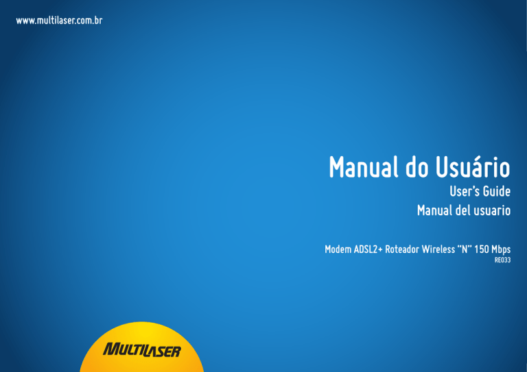 www.multilaser.com.br Manual do Usuário User’s Guide Manual del usuario Modem ADSL2+ Roteador Wireless “N” 150 Mbps RE033 DECLARAÇÃO FCC Este equipamento foi testado e considerado cumprir com os limites de um aparelho digital da Classe B, de acordo com a parte 15 das regras FCC. Esses limites são elaborados para prover proteção razoável contra interferência prejudicial numa instalação residencial. Este equipamento gera, usa e pode irradiar energia de freqüência de rádio (RF) e, se não instalado e usado de acordo com as instruções, pode causar interferência prejudicial às comunicações de rádio. Entretanto, não há garantia de que essa interferência não ocorra numa instalação determinada. Se este equipamento causar interferência prejudicial à recepção de rádio ou televisão, o que pode ser determinado desligando e ligando o equipamento, o usuário é compelido a tentar corrigir a interferência por uma ou mais das seguintes medidas: • Reorientar ou realocar a antena de recepção. • Aumentar a separação entre o equipamento e o receptor. • Conectar o equipamento a uma tomada de um circuito diferente daquele Não qual o receptor está conectado. • Consultar o revendedor ou um técnico de rádio/TV experiente em suporte. Este aparelho cumpre com a parte 15 das regras FCC. O funcionamento está sujeito às duas seguintes condições: 1) Este aparelho não deve causar interferência prejudicial. 2) Este aparelho tem de aceitar qualquer interferência recebida, inclusive interferência que possa causar funcionamento indesejado. Quaisquer mudanças ou modificações não expressamente aprovadas pela parte responsável pelo cumprimento pode anular a autoridade do usuário a operar o equipamento. Observação: O fabricante não é responsável por qualquer interferência em rádio ou TV causada por modificações não autorizadas neste equipamento. Tais modificações podem anular a autoridade do usuário em operar o equipamento. Declaração de exposição de radiação RF do FCC: Este equipamento cumpre com os limites de exposição de radiação da FCC RF dispostos para um ambiente não controlado. Este aparelho e sua antena não podem ser alocados ou operados em conjunção com qualquer outra antena ou transmissor. “Para cumprir com os requisitos de exposição FCC RF, essa garantia é aplicável apenas a configurações móveis. As antenas usadas para este transmissor têm de ser instaladas de maneira a propiciar uma distância de separação de pelo menos 20 cm de todas as pessoas e não pode ser alocada ou operada em conjunção com qualquer outra antena ou transmissor." Alerta CE Mark (Certificação Européia) Este é um produto classe B. Em um ambiente doméstico, este produto pode causar interferência de rádio, caso em que poderá ser necessário que o usuário tome medidas adequadas. Restrições Nacionais Este aparelho é destinado ao uso doméstico e de escritórios em todos os países da UE (e outros países que seguem a diretiva UE 1999/5/EC) sem qualquer limitação, exceto para os países abaixo mencionados: País Restrição Bulgária Nenhuma Razão/observação Necessária autorização geral para uso externo e serviço público. Uso de Radiolocação Militar. A reorganização da faixa Uso externo limitado a 10 de 2.4 GHz está em andamento em anos recentes para França mW e.i.r.p. dentro da faixa permitir o atual afrouxamento da regulamentação. de banda 2454-2483.5 MHz Plena implementação planejada para 2012 Se usado fora das próprias premissas, é requerida Itália Nenhuma autorização geral. É requerida autorização geral para rede e provimento de Luxemburgo Nenhuma serviço (não para o espectro) Essa subseção não se aplica à área geográfica num raio Noruega Implementado de 20km do centro de Ny-Ålesund Federação Russa Nenhuma Apenas para aplicações internas Observação: Não utilize esse produto externamente na França. CONTEÚDO Capítulo 1 Introdução .......................................................................................................2 1.1 Visão geral do produto....................................................................................2 1.2 Características Principais .............................................................................2 1.3 Convenções......................................................................................................3 Capítulo 2 Instalação de Hardware ...............................................................................4 2.1 Painel Dianteiro................................................................................................4 2.2 Painel Traseiro .................................................................................................5 2.3 Ambiente de Instalação ..................................................................................6 2.4 Conectando o Roteador .................................................................................6 Capítulo 3 Guia de Instalação Rápida ..........................................................................8 3.1 Configurar o PC ...............................................................................................8 3.2 Login ............................................................................................................... 11 Capítulo 4 4.1 Configuração de Software ...................................................................... 15 Status.............................................................................................................. 15 4.1.1 Informação de Dispositivo................................................................................ 15 4.1.2 Log de Sistema .................................................................................................. 16 4.1.3 Estatísticas ......................................................................................................... 