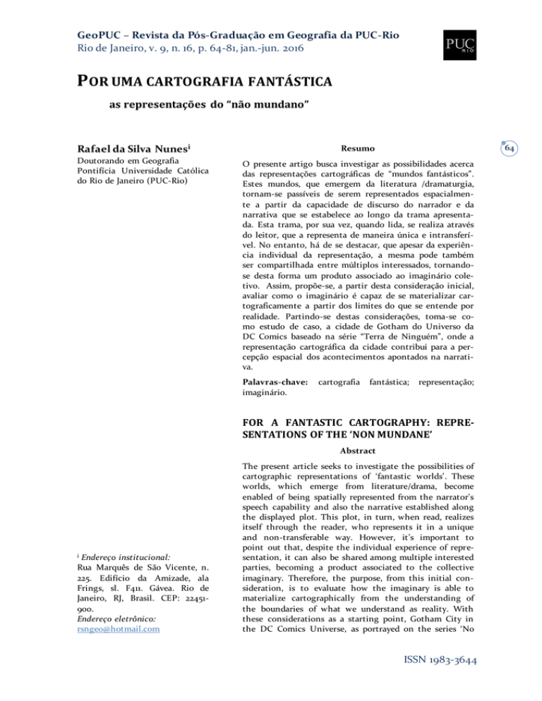 GeoPUC – Revista da Pós-Graduação em Geografia da PUC-Rio Rio de Janeiro, v. 9, n. 16, p. 64-81, jan.-jun. 2016 POR UMA CARTOGRAFIA FANTÁSTICA as representações do “não mundano” Rafael da Silva Nunesi Doutorando em Geografia Pontifícia Universidade Católica do Rio de Janeiro (PUC-Rio) 64 Resumo O presente artigo busca investigar as possibilidades acerca das representações cartográficas de “mundos fantásticos”. Estes mundos, que emergem da literatura /dramaturgia, tornam-se passíveis de serem representados espacialmente a partir da capacidade de discurso do narrador e da narrativa que se estabelece ao longo da trama apresentada. Esta trama, por sua vez, quando lida, se realiza através do leitor, que a representa de maneira única e intransferível. No entanto, há de se destacar, que apesar da experiência individual da representação, a mesma pode também ser compartilhada entre múltiplos interessados, tornandose desta forma um produto associado ao imaginário coletivo. Assim, propõe-se, a partir desta consideração inicial, avaliar como o imaginário é capaz de se materializar cartograficamente a partir dos limites do que se entende por realidade. Partindo-se destas considerações, toma-se como estudo de caso, a cidade de Gotham do Universo da DC Comics baseado na série “Terra de Ninguém”, onde a representação cartográfica da cidade contribui para a percepção espacial dos acontecimentos apontados na narrativa. Palavras-chave: imaginário. cartografia fantástica; representação; FOR A FANTASTIC CARTOGRAPHY: REPRESENTATIONS OF THE ‘NON MUNDANE’ Abstract i Endereço institucional: Rua Marquês de São Vicente, n. 225. Edifício da Amizade, ala Frings, sl. F411. Gávea. Rio de Janeiro, RJ, Brasil. CEP: 22451900. Endereço eletrônico: [email protected] The present article seeks to investigate the possibilities of cartographic representations of ‘fantastic worlds’. These worlds, which emerge from literature/drama, become enabled of being spatially represented from the narrator's speech capability and also the narrative established along the displayed plot. This plot, in turn, when read, realizes itself through the reader, who represents it in a unique and non-transferable way. However, it’s important to point out that, despite the individual experience of representation, it can also be shared among multiple interested parties, becoming a product associated to the collective imaginary. Therefore, the purpose, from this initial consideration, is to evaluate how the imaginary is able to materialize cartographically from the understanding of the boundaries of what we understand as reality. With these considerations as a starting point, Gotham City in the DC Comics Universe, as portrayed on the series ‘No ISSN 1983-3644 Por uma cartografia fantástica Rafael da S. Nunes Man's Land’, becomes the case study, where the cartographic representation of the city contributes to spatial perception of the events indicated in the narrative. Keywords: fantastic cartography; representation; imagination. 65 Além das representações objetivas Quando nos deparamos com uma representação (qualquer que ela seja) devemos entendê-la como um espectro do que é, ou seja, como uma imagem errática e “mal acabada” daquilo que ela em essência é. Ser, portanto, é único e incapaz de ser representado em sua totalidade. Assim, qualquer que seja o objeto representado, por mais complexa (e “completa”) que seja esta tentativa de representação, jamais conseguirá dar conta da totalidade do que se entende pelo objeto real. Isto ocorre simplesmente porque a representação não é (e não consegue ser) aquilo que é. Makowiecky (2003, p. 4) , ao discutir a multiplicidade de percepções que a representação assume, aponta que independente do momento histórico-científico em que se observa o que é a representação (ausência ou presença) deve-se entender a mesma como um “processo pelo qual institui-se um representante que, em certo contexto limitado, tomará o lugar de quem representa”. Este contexto limitado significa justamente a não totalidade daquilo que em essência a representação tenta ser. Entretanto, a mesma não perde sua validade de tentar ser (representação). Assim, por mais imperfeitas que as mesmas possam ser (ainda que não sejam reconhecidas por diferentes sujeitos) elas possuem sua importância por, em essência, representar. Daí, depreende-se que qualquer representação torna-se válida. Lucas (1995, p. 13), discute que para a filosofia o conceito de representação é múltiplo e varia bastante de acordo com cada corrente filosófica adotada. No entanto, elas resumem-se, em um quadro geral, a dois aspectos: o da objetividade e o da subjetividade. De acordo com o autor, Do ponto de vista da subjetividade a representação está ligada a maneira pela qual o conteúdo dos objetos pensados são representados ao espírito, neste sentido, a noção de representação está ligada a certos processos cognitivos relacionados com, a percepção, a imaginação, o julgamento etc. Na perspectiva da objetividade a representação está relacionada sobretudo à GeoPUC, Rio de Janeiro, v. 9, n. 16, p. 64-81, jan.-jun. 2016 Por uma cartografia fantástica Rafael da S. Nunes capacidade das nossas mentes em tornar presente um objeto do pensamento por intermédio de símbolos. (LUCAS, 1995, p. 13) Quando se pensa sobre a cartografia per se, nos aproximamos da ideia da perspectiva objetiva da representação, ou seja, entende-se a adoção de uma série de símbolos e referências (vinculadas aos diversos elementos cartográficos) para que se torne possível estabelecer uma relação direta entre representante (mapa) e representado (mundo). Por exemplo, pode-se estabelecer aqui o que comumente entende-se como convenções cartográficas, pois esta ajuda, através da adoção de símbolos básicos a estabelecer a conexão entre o representante