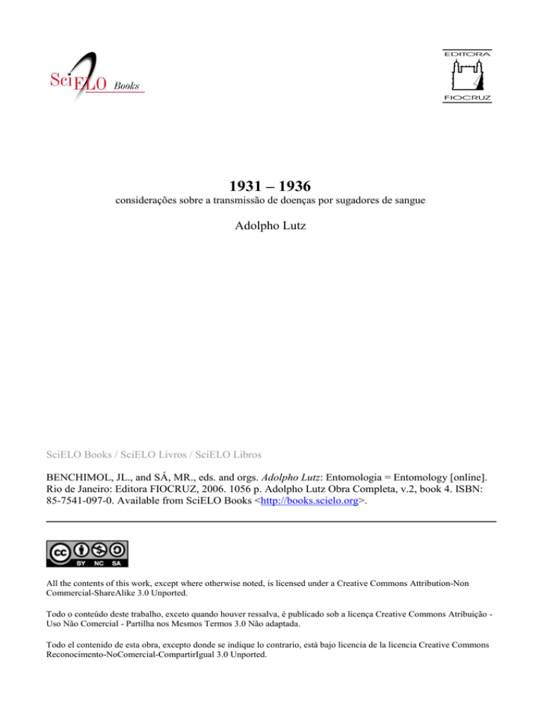 1931 – 1936 considerações sobre a transmissão de doenças por sugadores de sangue Adolpho Lutz SciELO Books / SciELO Livros / SciELO Libros BENCHIMOL, JL., and SÁ, MR., eds. and orgs. Adolpho Lutz: Entomologia = Entomology [online]. Rio de Janeiro: Editora FIOCRUZ, 2006. 1056 p. Adolpho Lutz Obra Completa, v.2, book 4. ISBN: 85-7541-097-0. Available from SciELO Books <http://books.scielo.org>. All the contents of this work, except where otherwise noted, is licensed under a Creative Commons Attribution-Non Commercial-ShareAlike 3.0 Unported. Todo o conteúdo deste trabalho, exceto quando houver ressalva, é publicado sob a licença Creative Commons Atribuição Uso Não Comercial - Partilha nos Mesmos Termos 3.0 Não adaptada. Todo el contenido de esta obra, excepto donde se indique lo contrario, está bajo licencia de la licencia Creative Commons Reconocimento-NoComercial-CompartirIgual 3.0 Unported. voltar ao sumário ENTOMOLOGIA 861 Considerações sobre a transmissão de doenças por sugadores de sangue * As considerações que seguem visam apenas chamar a atenção sobre a importância dos hematófagos na disseminação de doenças. O cunho pessoal desaparece em trabalhos deste gênero, ante o grande acervo de fatos que vêm sendo verificados durante quatro decênios pelos diversos cientistas de muitos países. Por isso, não pretendemos ser originais nem apresentar compilação completa. Tivemos mesmo de limitar-nos as doenças do homem e dos animais domésticos. Se em algumas ocasiões fugimos a esta determinação é para apresentar fatos de interesse doutrinário ou material adequado ao estudo. Incluímos também alguns parasitos cuja transmissão não se conhece, mas que, pelo exemplo de outras espécies congêneres, infere-se a necessidade de um hospedeiro hematófago intermediário e poderão constituir assunto de pesquisas. Entre os transmissores e os chamados reservatórios de vírus citaremos apenas aqueles demonstrados como responsáveis de fato pelas epidemias e epizootias, já que a mera constatação em laboratório de animais sensíveis e de hematófagos capazes de transmitir tal ou qual doença não indica forçosamente a sua participação efetiva nas epidemias respectivas. Não queremos confundir todos os animais sensíveis com o reservatório de vírus, nem todos os transmissores de laboratório com os naturais. A primeira parte, histórica, tem o fim de apresentar o raciocínio e modo de trabalhar que levaram à constatação dos fatos fundamentais desse novo ramo de epidemiologia. As três restantes formam como que uma compilação ordenada e comentada, a nosso modo de ver, das doenças e transmissores, que cremos suficiente para demonstrar a importância do papel dos hematófagos, como nos propusemos. Parte histórica Febre do Texas. Deve-se aos americanos Theobald Smith e F. L Kilborne a primeira demonstração completa de que há doenças que se propagam apenas por intermédio de um artrópode. A Febre do Texas apresentava-se sob o curioso aspecto * Trabalho de Adolpho Lutz, do Instituto Oswaldo Cruz, feito em colaboração com Gustavo Mendes de Oliveira Castro, então vinculado ao Instituto de Biologia Animal, publicado em 25.7.1936 em A Folha Medica, v.17, n.21, p.320-8. Circulou como folheto impresso no Rio de Janeiro, em Est. Graphico Canton & Reile, 1936 (25p.). Esse “Numero especial de doenças tropicaes e infectuosas” do periódico então dirigido por J. P. Fontenelle, trazia, além do artigo ora reeditado, diversos artigos em homenagem a Carlos Chagas (morto em 1934), e trabalhos de seus filhos Evandro Chagas e Carlos Chagas Filho. A colaboração entre Lutz e Oliveira Castro, que ingressaria no Instituto Oswaldo Cruz em 1938, começou em 1935 e rendera já a publicação de três trabalhos sobre mutucas, reeditados em livro anterior a este da Obra Completa do cientista (v.2, livro 2: Entomologia – Tabanídeos). [N.E.] voltar ao sumário 862 ADOLPHO LUTZ — OBRA COMPLETA z Vol. 2 — Livro 4 seguinte: o gado proveniente dos estados do Norte, chegando às fazendas do Sul, adoecia com Febre do Texas, doença esta jamais observada em animais criados no Sul. A exportação do gado do Sul, de aparência perfeitamente sadia, para os matadouros do Norte, trazia em conseqüência uma epizootia entre as reses do Norte que estivessem com ele misturadas durante cerca de um mês, ou apenas em pastos, cerca de um mês depois por onde tivessem estagiado as do Sul. Durante o inverno, não havia Febre do Texas e acreditavam os fazendeiros ser a doença causada pelos carrapatos. Depois de uma tentativa frustrada, em 1888, de encontrar o germe causador dessa doença, decidiram T. Smith e Kilborne estudar o fenômeno no campo, isto é, repetir as mesmas condições apresentadas pela natureza. No verão de 1889, dando atenção à crença popular, mandaram vir sete reses do Sul carregadas de carrapatos, com aspecto, porém, perfeitamente sadio. No primeiro campo colocaram quatro destas com seis provenientes do Norte. No segundo campo, bem isolado, puseram as três restantes, das quais colheram todos os carrapatos, com quatro reses do Norte. Cerca de um mês após, apareceram os primeiros carrapatos nas reses do Norte do campo nº 1, que adoeceram em seguida, morrendo todas. No campo nº 2, onde não havia carrapatos, as reses do Norte continuavam sadias. Quatro meses depois, as reses do campo nº 2 ainda se conservavam sadias. Num terceiro campo, então, onde nunca estivera rês sulina, disseminaram grande número de carrapatos recebidos do Sul, e neste mesmo campo colocaram reses do Norte que, em poucas semanas, adoeceram de febre do Texas, uma das quais morreu. Nesta ocasião, examinando o sangue das reses doentes, descobriram nas hemácias corpúsculos piriformes, o protozoário causador da doença, como demonstraram depois. Tendo Cooper Curtice verificado que os carrapatos em questão passavam toda a sua vida, de larva a adulto, num mesmo animal, como pod