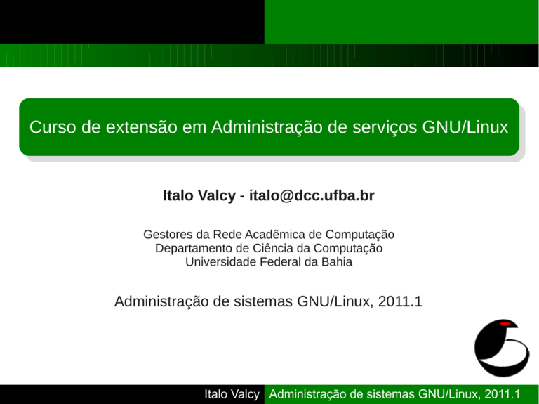 Curso de extensão em Administração de serviços GNU/Linux Italo Valcy - [email protected] Gestores da Rede Acadêmica de Computação Departamento de Ciência da Computação Universidade Federal da Bahia Administração de sistemas GNU/Linux, 2011.1 Italo Valcy Administração de sistemas GNU/Linux, 2011.1 Licença de uso e distribuição Todo o material aqui disponível pode, posteriormente, ser utilizado sobre os termos da: Creative Commons License: Atribuição - Uso não comercial - Permanência da Licença http://creativecommons.org/licenses/by-nc-sa/3.0/ Italo Valcy Administração de sistemas GNU/Linux, 2011.1 Assuntos abordados Funcionamento básico do DNS DNS no GNU/Linux Ferramentas clientes para GNU/Linux Italo Valcy Administração de sistemas GNU/Linux, 2011.1 Assuntos abordados Funcionamento básico do DNS DNS no GNU/Linux Ferramentas clientes para GNU/Linux Italo Valcy Administração de sistemas GNU/Linux, 2011.1 Domain Name System - DNS Resolvedor de nomes DNS significa Domain Name System (sistema de nomes de domínio). O DNS converte os nomes de máquinas para endereços IPs que todas as máquinas da Internet possuem. Ele faz o mapeamento do nome para o endereço e do endereço para o nome e algumas outras coisas. Exemplo de mapeamento DNS: www.dcc.ufba.br => 200.17.147.8 Italo Valcy Administração de sistemas GNU/Linux, 2011.1 Domain Name System - DNS Resolvedor de nomes O DNS foi criado com o objetivo de tornar as coisas mais fáceis para o usuário, permitindo assim, a identificação de computadores na Internet ou redes locais através de nomes (é como se tivéssemos apenas que decorar o nome da pessoa ao invés de um número de telefone). A parte responsável por traduzir os nomes como www.nome.com.br em um endereço IP é chamada de resolvedor de nomes. Italo Valcy Administração de sistemas GNU/Linux, 2011.1 Domain Name System - DNS Resolvedor de nomes O resolvedor de nomes pode ser um banco de dados local (controlado por um arquivo ou programa) que converte automaticamente os nomes em endereços IP ou através de servidores DNS que fazem a busca em um banco de dados na Internet e retornam o endereço IP do computador desejado. Um servidor DNS mais difundido na Internet é o bind. Italo Valcy Administração de sistemas GNU/Linux, 2011.1 Domain Name System - DNS O que é um nome? Um domínio é uma família ou grupo de nomes. Um domínio pode ser colocado em um subdomínio. Um domínio principal é um domínio que não é um sub-domínio. Os domínios principais são especificados na RFC-920. Italo Valcy Administração de sistemas GNU/Linux, 2011.1 Domain Name System - DNS O que é um nome? Alguns exemplos de domínios principais comuns são: COM - Organizações Comerciais EDU - Organizações Educacionais GOV - Organizações Governamentais MIL - Organizações Militares ORG - Outras Organizações NET - Organizações relacionadas com a Internet Identificador do País (br, cn, fr) - São duas letras que representam um país em particular. Italo Valcy Administração de sistemas GNU/Linux, 2011.1 Domain Name System - DNS O que é um nome? Cada um dos domínios principais tem sub-domínios. Os domínios principais baseados no nome do país são frequentemente divididos em sub-domínios baseado nos domínios .com, .edu, .gov, .mil e .org. Por exemplo: com.au e gov.au (comércio e governo na Austrália) Isto não é uma regra geral, as organizações de domínio atuais dependem da autoridade na escolha de nomes de cada domínio. Quando o endereço não especifica o domínio principal, como o endereço www.ufba.br, isto quer dizer que é uma organização acadêmica. Italo Valcy Administração de sistemas GNU/Linux, 2011.1 Domain Name System - DNS O que é um nome? O próximo nível da divisão representa o nome da organização. Subdomínios futuros variam em natureza. Freqüentemente o próximo nível do subdomínio é baseado na estrutura departamental da organização mas ela pode ser baseada em qualquer critério considerado razoável e significantes pelos administradores de rede para a organização. Italo Valcy Administração de sistemas GNU/Linux, 2011.1 Domain Name System - DNS O que é um nome? Porção mais à esquerda: hostname Porção mais à direta: domínio Nome completo: Nome do Domínio Completamente Qualificado (FQDN – Fully Qualified Domain Name) hostname domain name homes dcc.ufba.br homes.dcc.ufba.br Fully Qualified Domain Name Italo Valcy Administração de sistemas GNU/Linux, 2011.1 Domain Name System - DNS Hierarquia do DNS Estrutura hierárica Maior banco de dados distribuído do mundo root-level top-level second-level ... Italo Valcy Administração de sistemas GNU/Linux, 2011.1 Domain Name System - DNS Hierarquia do DNS Exemplo: usando o www.debian.org.br, temos: computador br - País onde o computador se encontra org - Domínio principal debian - Nome de Domínio www - Nome do computador Italo Valcy Administração de sistemas GNU/Linux, 2011.1 Domain Name System - DNS Hierarquia do DNS A localização do computador www.debian.org.br através de servidores DNS na Internet obedece exatamente a seqüência de procura mostrada. Os administradores do domínio debian.org.br podem cadastrar quantos sub-domínios e computadores quiserem (como www.nonus.debian.org.br ou cvs.debian.org.br) são exemplos válidos. Italo Valcy Administração de sistemas GNU/Linux, 2011.1 Domain Name System - DNS Funcionamento básico O usuário tenta acessar o site www.dcc.ufba.br O resolver detecta a necessidade de tradução do nome acima para o IP. O resolver inicia a pesquisa DNS. A mensagem enviada pelo resolver contém: O nome a ser resolvido (www.dcc.ufba.br) O tipo de pesquisa a ser realizado (MX,A,etc.) Uma classe associada com o nome DNS (IN) Italo Valcy Administração de sistemas GNU/Linux, 2011.1 Domain Name System - DNS Tipos de registros DNS Tipos de registros DNS A e AAAA CNAME MX NS PTR SOA TXT SOA Italo Valcy Administração de siste