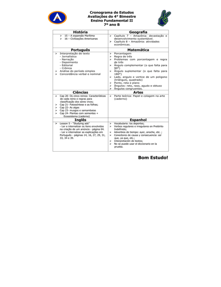 Cronograma de Estudos Avaliações do 4° Bimestre Ensino Fundamental II 7º ano B História Geografia 15 – A expansão Marítima 16 – Civilizações Americanas Capítulo 7 – Amazônia: devastação e desenvolvimento sustentável. Capítulo 8 – Amazônia: atividades econômicas. Português Interpretação de texto - Jornalístico - Narração - Depoimento - Editorial - Crônica Análise do período simples Concordância verbal e nominal Matemática Porcentagem Regra de três Problemas com porcentagem e regra de três Ângulo complementar (o que falta para 90°) Ângulo suplementar (o que falta para 180°) Lado, angulo e vertice de um poligono (triângulo, quadrado) Ponto, reta e plano Ângulos: reto, raso, agudo e obtuso Ângulos congruentes. Ciências Cap 20- Os cinco reinos: Características de cada reino e regras para classificação dos seres vivos; Cap 21- Fotossíntese e as folhas; Cap 22- As algas Cap 23- musgos e samambaias Cap 24- Plantas com sementes + Ecossistema (caderno) Artes Inglês Lesson 5 - "Studying ads" - Ler e internalizar os itens envolvidos na criação de um anúncio - página 04. - Ler e internalizar as explicações em Português - páginas 14, 16, 27, 29, 31, 33, 34 e 39. Parte teórica: Papel e colagem na arte (caderno) Espanhol Vocabulario: los deportes; Verbos regulares e irregulares en Pretérito Indefinido; Adverbios de tiempo: ayer, anoche, etc. ; Conectores de causa y consecuencia: así que, ya que, etc.; Interpretación de textos; No se puede usar el diccionario en la prueba. Bom Estudo! Cronograma de Estudos Avaliações do 4° Bimestre Ensino Fundamental II 7º ano B História Geografia 15 – A expansão Marítima 16 – Civilizações Americanas Capítulo 7 – Amazônia: devastação e desenvolvimento sustentável. Capítulo 8 – Amazônia: atividades econômicas. Português Interpretação de texto - Jornalístico - Narração - Depoimento - Editorial - Crônica Análise do período simples Concordância verbal e nominal Matemática Porcentagem Regra de três Problemas com porcentagem e regra de três Ângulo complementar (o que falta para 90°) Ângulo suplementar (o que falta para 180°) Lado, angulo e vertice de um poligono (triângulo, quadrado) Ponto, reta e plano Ângulos: reto, raso, agudo e obtuso Ângulos congruentes. Ciências Cap 20- Os cinco reinos: Características de cada reino e regras para classificação dos seres vivos; Cap 21- Fotossíntese e as folhas; Cap 22- As algas Cap 23- musgos e samambaias Cap 24- Plantas com sementes + Ecossistema (caderno) Artes Parte teórica: Papel e colagem na arte (caderno) Vocabulario: los deportes; Verbos regulares e irregulares en Pretérito Indefinido; Adverbios de tiempo: ayer, anoche, etc. ; Conectores de causa y consecuencia: así que, ya que, etc.; Interpretación de textos; No se puede usar el diccionario en la prueba. Inglês Lesson 5 - "Studying ads" - Ler e internalizar os itens envolvidos na criação de um anúncio - página 04. - Ler e internalizar as explicações em Português - páginas 14, 16, 27, 29, 31, 33, 34 e 39. Espanhol Bom Estudo!
