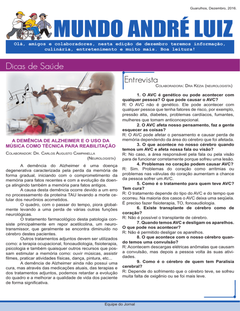 Guarulhos, Dezembro, 2016. MUNDO ANDRÉ LUIZ Olá amigos e colaboradores, nestadeedição teremos dicas, Olá, amigos e colaboradores, nesta edição dezembro teremos informação, culinária, e muito mais. Boa leitura! culinária,entretenimento diversão e muito mais. Boa leitura! Dicas de Saúde Entrevista Colaboradora: Dra Kézia (neurologista) A DEMÊNCIA DE ALZHEIMER E O USO DA MÚSICA COMO TÉCNICA PARA REABILITAÇÃO Colaborador: Dr. Carlos Augusto Campanella (Neurologista) A demência do Alzheimer é uma doença degenerativa caracterizada pela perda da memória de forma gradual, iniciando com o comprometimento da memória para fatos recentes e com a evolução da doença atingindo também a memória para fatos antigos. A causa desta demência ocorre devido a um erro no processamento da proteína TAU levando a morte celular dos neurônios acometidos. O quadro, com o passar do tempo, piora globalmente levando a uma perda de várias outras funções neurológicas. O tratamento farmacológico desta patologia consiste principalmente em repor acetilcolina, um neurotransmissor, que geralmente se encontra diminuído no cérebro destes pacientes. Outros tratamentos adjuntos devem ser utilizados como: a terapia ocupacional, fonoaudiologia, fisioterapia, psicologia e também quaisquer outros recursos que possam estimular a memória como: ouvir músicas, assistir filmes, praticar atividades físicas, dança, pintura, etc... A demência de Alzheimer ainda não possui uma cura, mas através das medicações atuais, das terapias e dos tratamentos adjuntos, podemos retardar a evolução do quadro e a melhorar a qualidade de vida dos paciente de forma significativa. 1. O AVC é genético ou pode acontecer com qualquer pessoa? O que pode causar o AVC? R: O AVC não é genético. Ele pode acontecer com qualquer pessoa que tenha fatores de risco, por exemplo, pressão alta, diabetes, problemas cardíacos, fumantes, mulheres que tomam anticoncepcional. 2. O AVC afeta nosso pensamento, faz a gente esquecer as coisas? R: O AVC pode afetar o pensamento e causar perda de memória dependendo da área do cérebro que foi afetada. 3. O que acontece no nosso cérebro quando temos um AVC e afeta nossa fala ou visão? R: No caso, a área responsável pela fala ou pela visão para de funcionar corretamente porque sofreu uma lesão. 4. Problemas no coração podem causar AVC? R: Sim. Problemas do coração como arritmias ou problemas nas válvulas do coração aumentam a chance da pessoa sofrer um AVC. 5. Como é o tratamento para quem teve AVC? Tem cura? R: O tratamento depende do tipo do AVC e do tempo que ocorreu. Na maioria dos casos o AVC deixa uma seqüela. É preciso fazer fisioterapia, TO, fonoaudiologia. 6. Existe transplante de cérebro como de coração? R: Não é possível o transplante de cérebro. 7. Quando temos AVC e desligam os aparelhos. O que pode nos acontecer? R: Não é permitido desligar os aparelhos. 8. O que acontece com o nosso cérebro quando temos uma convulsão? R: Acontecem descargas elétricas anômalas que causam a convulsão, mas depois a pessoa volta às suas atividades. 9. Como é o cérebro de quem tem Paralisia cerebral? R: Depende do sofrimento que o cérebro teve, se sofreu muita falta de oxigênio ou se foi mais leve. Equipe do Jornal Entrevista 10. O que acontece com o cérebro das pessoas que tem Alzheimer? R: A doença de Alzheimer é uma doença degenerativa. O cérebro vai atrofiando. 11. Por que as pessoas quando estão em coma ouvem, mas não conseguem falar? R: Isso também depende da profundidade do coma. Nos estados de coma mais profundos a pessoa não ouve porque o cérebro não está funcionando. 12. Que parte do nosso cérebro nos permite ler e escrever? R: A parte do cérebro responsável pela leitura é uma região do lobo temporal esquerdo, e para a escrita a principal é o córtex motor. estavam doentes lá no hospital, fui conversar, levar uma palavra amiga. Irineu: No plano espiritual temos um sentimento de liberdade, sinto quando estamos em oração. Rodrigo: Eu já vi meu corpo flutuando enquanto eu dormia. Ana Rita: No plano terreno dormimos para acordar e trabalhar no plano espiritual, nossa caminhada pelos jardins do plano espiritual é leve. Bueno: Já tive a experiência de ver meu espírito saindo do meu corpo, quando isto me aconteceu era criança, me vi na fase adulta. Janderson: Será que a morte não é aqui na Terra mesmo?! Cinema É UMA EMOCIONANTE HISTÓRIA SOBRE ALZHEIMER. A OBRA TAMBÉM FOI ADAPTADA PARA O CINEMA. Literatura O ASSUNTO SOBRE NEUROLOGIA DESPERTOU O INTERESSE EM NOSSOS ASSISTIDOS: Cético, defensor da lógica científica e neurocirurgião há mais de 25 anos, o Dr. Eben Alexander passou por uma experiência de quase morte – EQM, que ele mesmo considerava impossível. Vítima de uma meningite bacteriana grave, ficou em coma por sete dias. Sem consciência da própria identidade, fez descobertas transformadoras sobre a existência da vida após a morte e a profunda relação que todos nós temos com Deus. Quando os médicos já pensavam em suspender seu tratamento, o inesperado aconteceu: seus olhos se abriram. Analisando as evidências à luz dos conhecimentos científicos, o Dr. Eben decidiu compartilhar essa incrível história para mostrar que ciência e espiritualidade podem – e devem – andar juntas. Reflexão Sobre o Livro Wilson Louback: Ele não morreu, mas seu pensamento teve um contato com a morte e isso mudou a maneira dele enxergar a vida. Quando eu estava em coma minha mãe e meu pai vieram me visitar. Fátima II: A gente viaja, o corpo fica parado no lugar, mas a gente vê muitas pessoas diferentes, quando chegam os vivos e falam com a gente escutamos e nos emocionamos. Élcio: As pessoas pensam que a vida e a morte estão na mente. Quando ocorre uma visita de um parente desencarnado, as pessoas debocham, acham que é imaginação. Kátia Capdeville: Eu tive duas EQMs, então acredito que existe vida apó