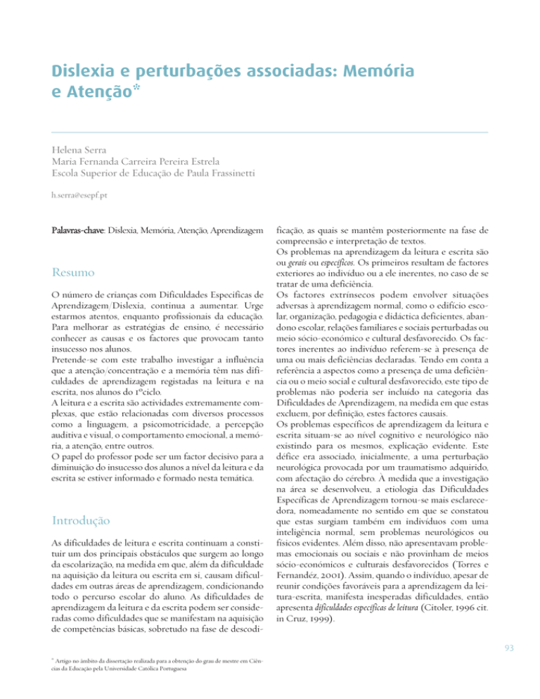 Dislexia e perturbações associadas: Memória e Atenção* Helena Serra Maria Fernanda Carreira Pereira Estrela Escola Superior de Educação de Paula Frassinetti [email protected] Palavras-chave: Dislexia, Memória, Atenção, Aprendizagem Resumo O número de crianças com Dificuldades Especificas de Aprendizagem/Dislexia, continua a aumentar. Urge estarmos atentos, enquanto profissionais da educação. Para melhorar as estratégias de ensino, é necessário conhecer as causas e os factores que provocam tanto insucesso nos alunos. Pretende-se com este trabalho investigar a influência que a atenção/concentração e a memória têm nas dificuldades de aprendizagem registadas na leitura e na escrita, nos alunos do 1ºciclo. A leitura e a escrita são actividades extremamente complexas, que estão relacionadas com diversos processos como a linguagem, a psicomotricidade, a percepção auditiva e visual, o comportamento emocional, a memória, a atenção, entre outros. O papel do professor pode ser um factor decisivo para a diminuição do insucesso dos alunos a nível da leitura e da escrita se estiver informado e formado nesta temática. Introdução As dificuldades de leitura e escrita continuam a constituir um dos principais obstáculos que surgem ao longo da escolarização, na medida em que, além da dificuldade na aquisição da leitura ou escrita em si, causam dificuldades em outras áreas de aprendizagem, condicionando todo o percurso escolar do aluno. As dificuldades de aprendizagem da leitura e da escrita podem ser consideradas como dificuldades que se manifestam na aquisição de competências básicas, sobretudo na fase de descodi- ficação, as quais se mantêm posteriormente na fase de compreensão e interpretação de textos. Os problemas na aprendizagem da leitura e escrita são ou gerais ou específicos. Os primeiros resultam de factores exteriores ao indivíduo ou a ele inerentes, no caso de se tratar de uma deficiência. Os factores extrínsecos podem envolver situações adversas à aprendizagem normal, como o edifício escolar, organização, pedagogia e didáctica deficientes, abandono escolar, relações familiares e sociais perturbadas ou meio sócio-económico e cultural desfavorecido. Os factores inerentes ao indivíduo referem-se à presença de uma ou mais deficiências declaradas. Tendo em conta a referência a aspectos como a presença de uma deficiência ou o meio social e cultural desfavorecido, este tipo de problemas não poderia ser incluído na categoria das Dificuldades de Aprendizagem, na medida em que estas excluem, por definição, estes factores causais. Os problemas específicos de aprendizagem da leitura e escrita situam-se ao nível cognitivo e neurológico não existindo para os mesmos, explicação evidente. Este défice era associado, inicialmente, a uma perturbação neurológica provocada por um traumatismo adquirido, com afectação do cérebro. À medida que a investigação na área se desenvolveu, a etiologia das Dificuldades Específicas de Aprendizagem tornou-se mais esclarecedora, nomeadamente no sentido em que se constatou que estas surgiam também em indivíduos com uma inteligência normal, sem problemas neurológicos ou físicos evidentes. Além disso, não apresentavam problemas emocionais ou sociais e não provinham de meios sócio-económicos e culturais desfavorecidos (Torres e Fernandéz, 2001). Assim, quando o indivíduo, apesar de reunir condições favoráveis para a aprendizagem da leitura-escrita, manifesta inesperadas dificuldades, então apresenta dificuldades específicas de leitura (Citoler, 1996 cit. in Cruz, 1999). 93 * Artigo no âmbito da dissertação realizada para a obtenção do grau de mestre em Ciências da Educação pela Universidade Católica Portuguesa 1. Dificuldades de Aprendizagem: Perspectiva Histórica A evolução da sociedade ao longo dos tempos, o modo como se foi perspectivando a si própria como comunidade, os valores que a moveram nas diferentes épocas, as capacidades e atitudes que foi valorizando ou desvalorizando em diferentes momentos históricos, reflectem a maior ou menor compreensão atribuída aos indivíduos menos capacitados ou incapacitados. O homem, desde sempre, tem-se mostrado preocupado com as diferenças individuais embora tenha prevalecido o método de ensino tradicional, que utiliza as mesmas estratégias para todos, como se aprendessem da mesma maneira. O interesse pelas possíveis causas e consequências das diferenças individuais no funcionamento mental remonta às «antigas civilizações, como a grega» (Mann, citado por Cruz, 1999:20). Ao longo dos anos a sociedade atendeu de um modo diversificado indivíduos que apresentavam deficiências, ou eram diferentes dos outros. Na maioria dos países este processo foi-se fazendo com desvios, retrocessos, saltos bruscos, fenómenos de moda, entre outros, a saber: · Na Antiguidade Clássica, em cidades como Esparta, eram assassinados à nascença; · Na Idade Média eram exorcizados e abandonados nas florestas, por se pensar estarem possuídos pelo demónio. É de salientar, contudo, o trabalho de Ponce de Léon (1510-1584), que num mosteiro beneditino espanhol, ensinou um grupo de surdos a linguagem escrita associando-a a objectos. Inspirado no trabalho deste monge Juan Pablo Monet (1579-1633) realizou os primeiros ensaios para educação de surdos e mudos. Na opinião de Fernandes (2002), realizavam-se então as primeiras experiências educativas e pedagógicas no sentido de ensinar os deficientes sensoriais – cegos e surdos. 94 · Nos séculos xvii e xviii os indivíduos deficientes eram internados em asilos, hospícios ou prisões. Os jovens cresciam junto com idosos e marginais, não lhes sendo prestado qualquer atendimento especial. Fernandes (idem), refere que no início do século xvii, em Portugal, a Rainha Santa Isabel I, considerava que os deficientes, coxos, velhos e cegos deveriam aprender a fazer algo, tendo