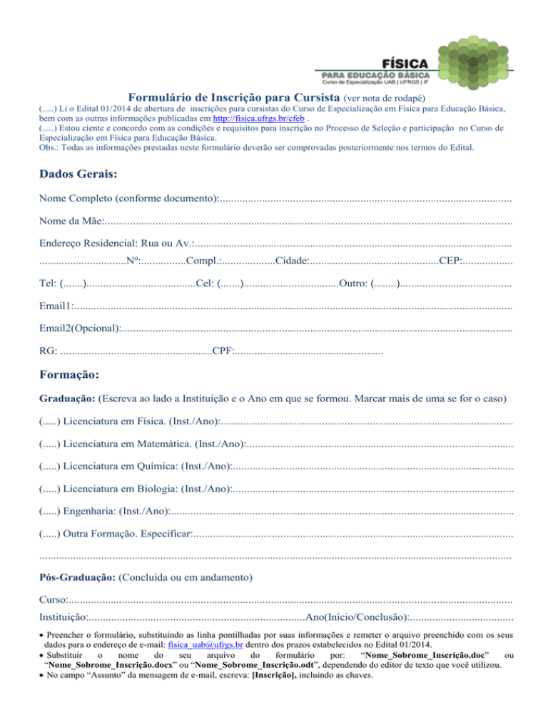 Formulário de Inscrição para Cursista (ver nota de rodapé) (.....) Li o Edital 01/2014 de abertura de inscrições para cursistas do Curso de Especialização em Física para Educação Básica, bem com as outras informações publicadas em http://fisica.ufrgs.br/cfeb . (.....) Estou ciente e concordo com as condições e requisitos para inscrição no Processo de Seleção e participação no Curso de Especialização em Física para Educação Básica. Obs.: Todas as informações prestadas neste formulário deverão ser comprovadas posteriormente nos termos do Edital. Dados Gerais: Nome Completo (conforme documento):........................................................................................................ Nome da Mãe:................................................................................................................................................. Endereço Residencial: Rua ou Av.:................................................................................................................. ...............................No:................Compl.:...................Cidade:..............................................CEP:.................. Tel: (.......).......................................Cel: (.......)..................................Outro: (........)........................................ Email1:............................................................................................................................................................ Email2(Opcional):........................................................................................................................................... RG: ......................................................CPF:..................................................... Formação: Graduação: (Escreva ao lado a Instituição e o Ano em que se formou. Marcar mais de uma se for o caso) (.....) Licenciatura em Física. (Inst./Ano):........................................................................................................ (.....) Licenciatura em Matemática. (Inst./Ano):............................................................................................... (.....) Licenciatura em Química: (Inst./Ano):.................................................................................................... (.....) Licenciatura em Biologia: (Inst./Ano):.................................................................................................... (.....) Engenharia: (Inst./Ano):.......................................................................................................................... (.....) Outra Formação. Especificar:.................................................................................................................. ........................................................................................................................................................................ Pós-Graduação: (Concluída ou em andamento) Curso:.............................................................................................................................................................. Instituição:.............................................................................Ano(Início/Conclusão):..................................... Preencher o formulário, substituindo as linha pontilhadas por suas informações e remeter o arquivo preenchido com os seus dados para o endereço de e-mail: [email protected] dentro dos prazos estabelecidos no Edital 01/2014. Substituir o nome do seu arquivo do formulário por: “Nome_Sobrome_Inscrição.doc” ou “Nome_Sobrome_Inscrição.docx” ou “Nome_Sobrome_Inscrição.odt”, dependendo do editor de texto que você utilizou. No campo “Assunto” da mensagem de e-mail, escreva: [Inscrição], incluindo as chaves. Escola(s) em que trabalha: (......) Não atuo em nenhuma escola atualmente. Comentário:.................................................................................................................................................... ........................................................................................................................................................................ Escola 1: Nome da escola:.............................................................................................................................................. Endereço da escola: Rua ou Av.:..................................................................................................................... ........................................................................................................................................................................ No:....................Bairro:..............................................Cidade:..........................................CEP:........................ Tel: (.......).......................................Cel: (.......)...................................Outro: (........)....................................... Email1:............................................................................................................................................................ Email2(Opcional):........................................................................................................................................... Tipo de Escola: (.....) publica municipal (.....) pública estadual Concursado: (....) sim (.....) não (.....) publica federal (.....) privada Contratado desde:.............................. Disciplinas e séries em que atua na escola: (....) Física; (....) Ensino Fundamental (9º Ano) (....) Ensino Médio (....) Ensino Técnico (....) Outra (repita se necessário). Especificar: ................................................................................................ Número total de alunos em todas as turmas (atualmente): ........................ Número de horas em sala de aula (a