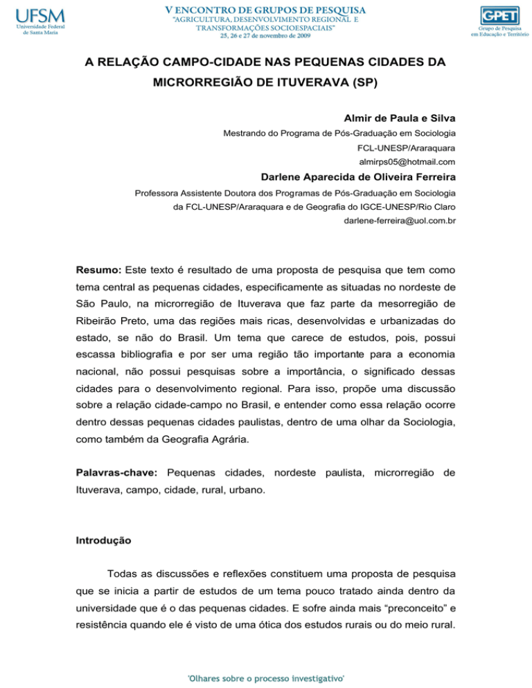 A RELAÇÃO CAMPO-CIDADE NAS PEQUENAS CIDADES DA MICRORREGIÃO DE ITUVERAVA (SP) Almir de Paula e Silva Mestrando do Programa de Pós-Graduação em Sociologia FCL-UNESP/Araraquara [email protected] Darlene Aparecida de Oliveira Ferreira Professora Assistente Doutora dos Programas de Pós-Graduação em Sociologia da FCL-UNESP/Araraquara e de Geografia do IGCE-UNESP/Rio Claro [email protected] Resumo: Este texto é resultado de uma proposta de pesquisa que tem como tema central as pequenas cidades, especificamente as situadas no nordeste de São Paulo, na microrregião de Ituverava que faz parte da mesorregião de Ribeirão Preto, uma das regiões mais ricas, desenvolvidas e urbanizadas do estado, se não do Brasil. Um tema que carece de estudos, pois, possui escassa bibliografia e por ser uma região tão importante para a economia nacional, não possui pesquisas sobre a importância, o significado dessas cidades para o desenvolvimento regional. Para isso, propõe uma discussão sobre a relação cidade-campo no Brasil, e entender como essa relação ocorre dentro dessas pequenas cidades paulistas, dentro de uma olhar da Sociologia, como também da Geografia Agrária. Palavras-chave: Pequenas cidades, nordeste paulista, microrregião de Ituverava, campo, cidade, rural, urbano. Introdução Todas as discussões e reflexões constituem uma proposta de pesquisa que se inicia a partir de estudos de um tema pouco tratado ainda dentro da universidade que é o das pequenas cidades. E sofre ainda mais “preconceito” e resistência quando ele é visto de uma ótica dos estudos rurais ou do meio rural. 'Olhares sobre o processo investigativo' São vários os obstáculos enfrentados quando escolhemos esse objeto. Até hoje, há uma produção acadêmica direcionada em pesquisas e estudos referentes às metrópoles, grandes e médias cidades e pouquíssimos trabalhos sobre pequenas cidades, não existindo assim uma bibliografia suficientemente extensa a respeito. O tema necessita de estudos tanto teóricos como empíricos. Outro problema enfrentado é conceituar o que é uma cidade e como classificar uma cidade como pequena. Isso envolve vários aspectos e não somente o demográfico, pois o patamar de população em torno de 20 mil habitantes, que define em muitos estados como sendo uma cidade pequena, pode não servir de parâmetro para outro estado. Em alguns, por exemplo, uma cidade de até 50 mil habitantes pode ser considerada pequena. Entender a atual relação-campo e como a pequena cidade se relaciona com o rural ou se na verdade ela é o próprio espaço que pode ser considerado rural. Tudo isso reforça a importância do estudo e interpretação dessas cidades, seus papéis e significados e também é relevante para a compreensão das particularidades históricas de cada uma no contexto regional. A presente pesquisa tomará como referências principais em se tratando da temática das pequenas cidades a produção desenvolvida por Wanderley (2005), Oliveira e Soares (2003), Bernadelli (2005), Bacelar (2005), Côrrea (2001) e (2004), Cintra e Endlich (2006). Buscaremos a partir desses autores uma definição da pequena cidade. Ressaltando que todos esses trabalhos se referem basicamente aos estados de Minas Gerais, Goiás, com exceção de Cintra e Endlich (pequenas cidades paranaenses), Bernardelli (região de Catanduva) e também não citado entre os autores acima os artigos de Silva, sobre pequenas cidades da região de Presidente Prudente. O texto divide-se em quatro partes. A inicial, percorre o caminho da “sociologia rural” até a atualidade e discute se a sociologia atual responde a questões como as transformações ocorridas no chamado “mundo rural”. A segunda parte visualiza esse “mundo rural” brasileiro como um campo de estudo interdisciplinar, onde nas últimas décadas toda a produção buscou referenciais em disciplinas como a geografia, a economia, a sociologia, a antropologia e a história. Apresenta também as diferentes correntes de pensamento que abordam o rural e o urbano no Brasil e as definições normativas sobre o rural e o urbano. A terceira parte busca definir o que é a 'Olhares sobre o processo investigativo' pequena cidade e por último a apresentação da microrregião paulista a ser estudada, a de Ituverava, composta pelos municípios de Ituverava, Guará, Buritizal, Miguelópolis e Igarapava e a com a utilização dos censos do IBGE e pesquisa de campo, demonstrar se essa microrregião paulista estaria tão urbanizada como mostra as taxas de urbanização do IBGE, se pode ser considerada ou não uma região rural e como fica a questão das políticas públicas para o rural diante destes dados estatísticos oficiais. O RURAL COMO OBJETO DE ESTUDO DA SOCIOLOGIA O desafio que se coloca para os pesquisadores das ciências sociais, especificamente da sociologia quando se trata do conhecimento acerca do mundo rural é o da pertinência e permanência de uma “sociologia rural”. Podemos dizer que não existe uma linhagem, uma tradição ou mesmo uma escola brasileira de “sociologia rural”. Um alerta que se faz necessário no presente texto, é que o objetivo das reflexões aqui contidas não é aprofundar o debate sobre novas concepções teórico-metodológicas do que seria uma “nova sociologia rural” ou uma “sociologia da agricultura”, mas apenas fazer um breve retrospecto da “sociologia rural”, suas contribuições teóricas para o estudo do campo e seus dilemas atuais, quando suas “tradições teóricas” parecem não dar conta das mudanças ocorridas no mundo rural brasileiro. As correntes de pensamento do início do século XX preocupadas em entender o rural, nasceram nos Estados Unidos. Inicialmente as reflexões evidenciam uma visão onde os espaços rurais e urbanos são vistos como realidades específicas e opostas. É a teoria dicotômica, que passa a ser questionada por outra corrente que procurava avançar nos estud