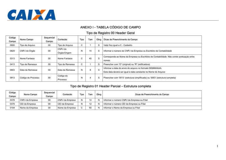 ANEXO I - TABELA CÓDIGO DE CAMPO Tipo de Registro 00 Header Geral Código Campo Nome Campo Sequencial Campo Conteúdo Tipo de Arquivo Tipo Tam Obrg C 1 S Valor fixo igual a C - Cadastro N 14 S Informar o número do CNPJ da Empresa ou Escritório de Contabilidade 0900 Tipo de Arquivo 00 0829 CNPJ do Órgão 00 0313 Nome Fantasia 00 Nome Fantasia C 40 S 0413 Tipo de Remessa 00 Tipo de Remessa C 1 S 0903 Data da Remessa 00 Data da Remessa N 8 S 0913 Código do Processo 00 N 4 S CNPJ do Órgão/Origem Código do Processo Dicas de Preenchimento do Campo Corresponde ao Nome da Empresa ou Escritório de Contabilidade. Não conter pontuação entre nomes. Preencher com “O” (original) ou “R” (retificadora) Informar a data do envio do arquivo no formato DDMMAAAA. Esta data deverá ser igual à data constante no Nome do Arquivo Preencher com ‘0013’ (estrutura simplificada) ou ‘0003’ (estrutura completa) Tipo de Registro 01 Header Parcial – Estrutura completa Código Campo Nome Campo Sequencial Campo Conteúdo Tipo Tam Obrg Dicas de Preenchimento do Campo 0378 CNPJ da Empresa 00 CNPJ da Empresa N 14 N Informar o número CNPJ da Empresa ou Filial 0379 CEI da Empresa 00 CEI da Empresa N 12 N Informar o número CEI da Empresa ou Filial 0104 Nome da Empresa 00 Nome da Empresa C 50 N Informar o Nome da Empresa ou Filial 1 Tipo de Registro 02- Detalhe Código Campo Nome Campo Sequencial Campo Conteúdo Tipo Tam Obrg Dicas de Preenchimento do Campo 0902 Tipo de Operação 00 Tipo de Operação C 1 S Informar I - Inclusão 0418 NIS do atendente 00 NIS do atendente N 11 N Informar o NIS do responsável pelo cadastramento ou 0419 CPF do atendente 00 CPF do atendente N 11 N Informar o CPF do responsável pelo cadastramento. 0422 Controle da empresa 00 Controle da empresa C 58 N 0195 Nome da Pessoa 00 Nome da Pessoa C 70 S 0197 Data de Nascimento 00 Data de Nascimento N 8 S 0200 Nome da Mãe 00 Nome da Mãe C 70 S 0199 Nome do Pai 00 Nome do Pai C 70 S 0390 Município Nasc (IBGE) 00 Código UF/Município (IBGE) N 2/5 N 0201 Sexo 00 Sexo C 1 N Campo para utilização em controle específico da empresa. Caso haja necessidade de um campo para livre utilização no momento do cadastramento. Não poderá estar em branco; Não poderá conter Nome Impróprio. Formato DDMMAAAA. Se não possuir a informação enviar a expressão IGNORADA Não poderá conter Nome impróprio. Se não possuir a informação enviar a expressão IGNORADO Não poderá conter Nome impróprio. Preenchimento obrigatório para Brasileiro nato. Código UF+ Código Município (IBGE). Não pode haver caracteres especiais. O campo não é obrigatório no arquivo, contudo se informado, deve ser preenchimento com “F” – feminino ou “M” – masculino. O campo não é obrigatório no arquivo, contudo se informado, deve ser preenchimento com “01” Branca; 0206 Código Raça Cor 00 Código Raça Cor N 2 N “02” Negra; “03” Parda; “04” Amarela; “05” Indígena 2 Código Campo Nome Campo Sequencial Campo Conteúdo Tipo Tam Obrg Dicas de Preenchimento do Campo O campo não é obrigatório no arquivo, contudo se informado, deve ser preenchimento com: “00” Não Informado; “01” Analfabeto; “02” Até 4ª Série Incompleta do Ensino Fundamental; “03” Com 4ª Série Completa do Ensino Fundamental; “04” De 5ª a 8ª Série Incompleta do Ensino Fundamental; 0008 Nível Instrução 00 Nível Instrução N 2 N “05” Ensino Fundamental Completo; “06” Ensino Médio Incompleto; “07” Ensino Médio Completo; “08” Superior Incompleto; “09” Superior Completo; “10” Especialização/Pós-Graduação; “11” Mestrado; “12” Doutorado O campo não é obrigatório no arquivo, contudo se informado, deve ser preenchimento com: “01” Solteiro(a); “02” Casado(a); “03” Divorciado(a); 0389 Estado Civil 00 Estado Civil N 2 N “04” Separado(a) judicialmente; “05” Viúvo; “06” Com União Estável; “07” Casado - Comunhão Total de Bens; “08” Casado - Sem Comunhão de Bens; “09” Casado - Comunhão Parcial Bens 3 Código Campo Nome Campo Sequencial Campo Conteúdo Tipo Ta m Obrg Dicas de Preenchimento do Campo • Quando a Nacionalidade for informada, obrigatoriamente deverá ser informado o detalhamento da Nacionalidade. 00 0386 Nacionalidade N 4 S • Campo composto por 4 bytes, portanto para nacionalidades como a brasileira (10) preencher com zeros a esquerda. EX: 0010 Nacionalidade • 01 Detalhamento Nacionalidade N 1 S Os códigos de nacionalidade constam no anexo II. 1 para brasileiro nato, 2 para brasileiro naturalizado, 3 para brasileiro nascido no exterior e 0 (zero) para estrangeiro. • Preenchimento obrigatório para estrangeiro ou Brasileiro nascido no exterior; • Informar código do País de Origem conforme tabela Anexo II. 0387 País de Origem 00 País de Origem N 4 N 0370 CPF 00 CPF N 11 S 00 Número do Título de Eleitor N 13 N 01 Zona do Título de Eleitor N 4 N Preenchimento obrigatório se sequencial 00 tiver preenchido. 02 Seção do Título de Eleitor N 4 N Preenchimento obrigatório se sequencial 00 tiver preenchido 00 Número da Identidade C 20 N 01 Complemento da Identidade C 20 N 02 UF de Emissão da Identidade C 2 N Preenchimento obrigatório se sequencial 00 tiver preenchido 03 Data de Emissão Identidade N 8 N Preenchimento obrigatório se sequencial 00 tiver preenchido. Formato DDMMAAAA. 04 Órgão Emissor da Identidade N 2 N Preenchimento obrigatório se sequencial 00 tiver preenchido, conforme anexo V 00 Número da CTPS N 7 S Preenchimento obrigatório. 01 Série da CTPS N 5 S Preenchimento obrigatório. 02 UF de Emissão CTPS C 2 S Preenchimento obrigatório. 03 Data de Emissão CTPS N 8 S Formato DDMMAAAA. 0371 0372 0373 Título de Eleitor Carteira de Identidade CTPS Preenchimento obrigatório. Campo será validado junto à Receita Federal O campo não é obrigatório no arquivo, contudo se informado. Caso seja enviado, todos os de