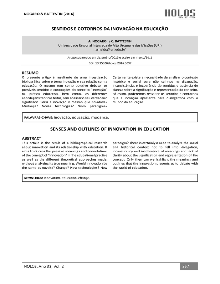 NOGARO & BATTESTIN (2016) SENTIDOS E COTORNOS DA INOVAÇÃO NA EDUCAÇÃO A. NOGARO* e C. BATTESTIN Universidade Regional Integrada do Alto Uruguai e das Missões (URI) [email protected]* Artigo submetido em dezembro/2015 e aceito em março/2016 DOI: 10.15628/holos.2016.3097 RESUMO O presente artigo é resultante de uma investigação bibliográfica sobre o tema inovação e sua relação com a educação. O mesmo tem como objetivo debater os possíveis sentidos e conotações do conceito “inovação” na prática educativa, bem como, as diferentes abordagens teóricas feitas, sem analisar o seu verdadeiro significado. Seria a inovação o mesmo que novidade? Mudança? Novas tecnologias? Novo paradigma? Certamente existe a necessidade de analisar o contexto histórico e social para não cairmos na divagação, inconsistência, e incoerência de sentidos e ausência de clareza sobre a significação e representação do conceito. Só assim, poderemos ressaltar os sentidos e contornos que a inovação apresenta para dialogarmos com o mundo da educação. PALAVRAS-CHAVE: inovação, educação, mudança. SENSES AND OUTLINES OF INNOVATION IN EDUCATION ABSTRACT This article is the result of a bibliographical research about innovation and its relationship with education. It aims to discuss the possible meanings and connotations of the concept of “innovation” in the educational practice as well as the different theoretical approaches made, without analyzing its true meaning. Would innovation be the same as novelty? Change? New technologies? New paradigm? There is certainly a need to analyze the social and historical context not to fall into divagation, inconsistency and incoherence of meanings and lack of clarity about the signification and representation of the concept. Only then can we highlight the meanings and outlines that the innovation presents so to debate with the world of education. KEYWORDS: innovation, education, change. HOLOS, Ano 32, Vol. 2 357 NOGARO & BATTESTIN (2016) 1 APRESENTAÇÃO A gênese do texto traz o questionamento a respeito do que se tem entendido sobre inovação, ao longo do mesmo apresenta-se compreensões de autores sobre o tema em pauta, problematizando-as. Por fim, apontam-se considerações e ideias que caracterizam uma educação, escola ou prática educativa inovadora, para que sirva de referência a quem desejar caminhar nesta direção. Por que tratar da inovação na educação? Por que apesar de passadas algumas décadas que marcaram o seu aparecimento como discurso, ela continua ocupando o centro na discussão educacional. O que queremos dizer quando nos referimos à inovação? O que é inovar a educação? Uma prática inovadora? E uma prática educativa inovadora? Principiamos a escrita deste texto com a elaboração de um estado do conhecimento para averiguar o que há de produzido em termos de livros ou artigos científicos sobre o assunto “inovação na educação” e “educação inovadora”. Deparamo-nos com uma pluralidade de visões e entendimentos sobre o mesmo, o que não nos desencoraja de reunirmos aqui alguns deles e construirmos o nosso. Ousamos também transformar este texto em um espaço para promover a possibilidade do pensar e do fazer reflexivos, em que as “inovações” tenham a oportunidade de apresentar-se, contradizer-se e transformar-se. Ao tratarmos da inovação na educação vamos nos esforçar para expor nossos argumentos com clareza para que não sejamos mal interpretados ou taxados como intransigentes, retrógrados ou contrários à inovação, por pretender um discurso crítico sobre este tema. Ao longo do texto nos posicionaremos de maneira efetiva sobre o tema, mas é na segunda parte do mesmo que apontaremos alternativas possíveis para uma prática educativa inovadora, não como receita, mas como marco teórico-conceitual que possa subsidiar e dar luz ao caminho da inovação. Querer adivinhar ou pensar o futuro é possível como exercício mental de ficção ou divagação, no entanto, quando se trata de abordar questões concretas que afetam o cotidiano como a inovação pedagógica, exige que tenhamos os dois pés no chão. Logo, falaremos do futuro a partir do presente ou das possibilidades que vislumbramos. Não nos é possível pensar em algo surreal transpondo-nos ao vivido em que nos encontramos, não ao menos enquanto falamos de educação, ela é sempre situada, sua realidade nos acorda e nos interpela. Desta forma, não há impedimento que desejemos ou imaginemos possibilidades, sonhemos, mas não podemos esquecer que elas sempre carregam as marcas do presente, estão profundamente arraigadas à nossa condição e ao nosso contexto. Na imaginação ou em filmes de ficção podemos regredir ou avançar no tempo, mas aquilo que estamos tratando exige a máxima lucidez. Como horizonte a utopia pode ser vislumbrada, o delírio não nos cabe. A inovação abre espaço para a imaginação, para o pensamento criativo, para certa sanidade insana de querer transpor limites, ela não pactua com a venda de ilusões ou previsões descabidas. 2 INOVAÇÃO: SENTIDOS POSSÍVEIS Constatamos que o conceito “inovação” é usado com diferentes sentidos e em alguns casos sem uma preocupação em precisá-lo. Não poucos textos apresentam a palavra “inovação” quando HOLOS, Ano 32, Vol. 2 358 NOGARO & BATTESTIN (2016) desejam adjetivar práticas ou processos educacionais com roupagens ou até conteúdos que se oponham a posições conservadoras. Em outros casos faz-se uso da “inovação” mais como estratégia para chamar a atenção, como marketing, para vender uma ideia ou produto, destacar uma instituição, do que existência de efetiva mudança ou diferença. Aqui alertamos para uma estratégia que “vende” muito bem, chama atenção até aos menos atentos, e que tem sido muito empregada, o uso da expressão: “trata-se de algo inovador!” É sobre ela que precisamos lançar o olho crític