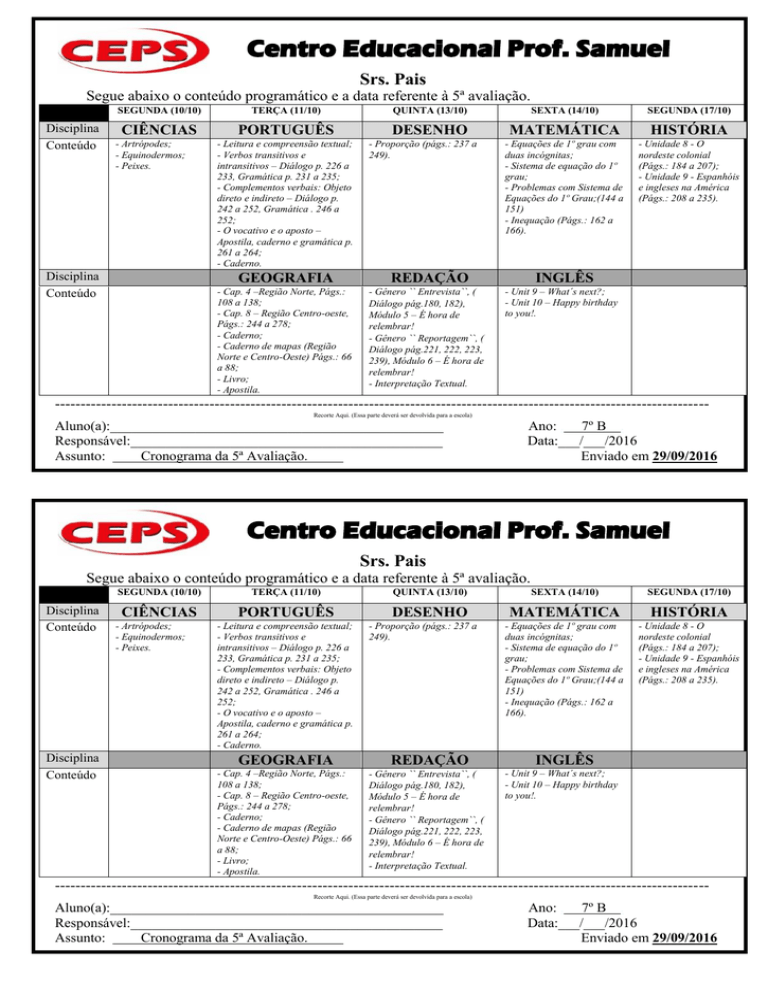 Centro Educacional Prof. Samuel Srs. Pais Segue abaixo o conteúdo programático e a data referente à 5ª avaliação. SEGUNDA (10/10) Disciplina Conteúdo CIÊNCIAS - Artrópodes; - Equinodermos; - Peixes. Disciplina Conteúdo TERÇA (11/10) PORTUGUÊS - Leitura e compreensão textual; - Verbos transitivos e intransitivos – Diálogo p. 226 a 233, Gramática p. 231 a 235; - Complementos verbais: Objeto direto e indireto – Diálogo p. 242 a 252, Gramática . 246 a 252; - O vocativo e o aposto – Apostila, caderno e gramática p. 261 a 264; - Caderno. GEOGRAFIA - Cap. 4 –Região Norte, Págs.: 108 a 138; - Cap. 8 – Região Centro-oeste, Págs.: 244 a 278; - Caderno; - Caderno de mapas (Região Norte e Centro-Oeste) Págs.: 66 a 88; - Livro; - Apostila. QUINTA (13/10) DESENHO - Proporção (págs.: 237 a 249). SEXTA (14/10) MATEMÁTICA HISTÓRIA - Equações de 1º grau com duas incógnitas; - Sistema de equação do 1º grau; - Problemas com Sistema de Equações do 1º Grau;(144 a 151) - Inequação (Págs.: 162 a 166). - Unidade 8 - O nordeste colonial (Págs.: 184 a 207); - Unidade 9 - Espanhóis e ingleses na América (Págs.: 208 a 235). REDAÇÃO - Gênero `` Entrevista``, ( Diálogo pág.180, 182), Módulo 5 – É hora de relembrar! - Gênero `` Reportagem``, ( Diálogo pág.221, 222, 223, 239), Módulo 6 – É hora de relembrar! - Interpretação Textual. SEGUNDA (17/10) INGLÊS - Unit 9 – What´s next?; - Unit 10 – Happy birthday to you!. ------------------------------------------------------------------------------------------------------------------------------Recorte Aqui. (Essa parte deverá ser devolvida para a escola) Aluno(a):_______________________________________________ Responsável:____________________________________________ Assunto: . Cronograma da 5ª Avaliação. Ano: . 7º B . Data:___/___/2016 Enviado em 29/09/2016 Centro Educacional Prof. Samuel Srs. Pais Segue abaixo o conteúdo programático e a data referente à 5ª avaliação. SEGUNDA (10/10) Disciplina Conteúdo Disciplina Conteúdo CIÊNCIAS - Artrópodes; - Equinodermos; - Peixes. TERÇA (11/10) PORTUGUÊS - Leitura e compreensão textual; - Verbos transitivos e intransitivos – Diálogo p. 226 a 233, Gramática p. 231 a 235; - Complementos verbais: Objeto direto e indireto – Diálogo p. 242 a 252, Gramática . 246 a 252; - O vocativo e o aposto – Apostila, caderno e gramática p. 261 a 264; - Caderno. GEOGRAFIA - Cap. 4 –Região Norte, Págs.: 108 a 138; - Cap. 8 – Região Centro-oeste, Págs.: 244 a 278; - Caderno; - Caderno de mapas (Região Norte e Centro-Oeste) Págs.: 66 a 88; - Livro; - Apostila. QUINTA (13/10) DESENHO - Proporção (págs.: 237 a 249). REDAÇÃO - Gênero `` Entrevista``, ( Diálogo pág.180, 182), Módulo 5 – É hora de relembrar! - Gênero `` Reportagem``, ( Diálogo pág.221, 222, 223, 239), Módulo 6 – É hora de relembrar! - Interpretação Textual. SEXTA (14/10) SEGUNDA (17/10) MATEMÁTICA HISTÓRIA - Equações de 1º grau com duas incógnitas; - Sistema de equação do 1º grau; - Problemas com Sistema de Equações do 1º Grau;(144 a 151) - Inequação (Págs.: 162 a 166). - Unidade 8 - O nordeste colonial (Págs.: 184 a 207); - Unidade 9 - Espanhóis e ingleses na América (Págs.: 208 a 235). INGLÊS - Unit 9 – What´s next?; - Unit 10 – Happy birthday to you!. ------------------------------------------------------------------------------------------------------------------------------Recorte Aqui. (Essa parte deverá ser devolvida para a escola) Aluno(a):_______________________________________________ Responsável:____________________________________________ Assunto: . Cronograma da 5ª Avaliação. Ano: . 7º B . Data:___/___/2016 Enviado em 29/09/2016