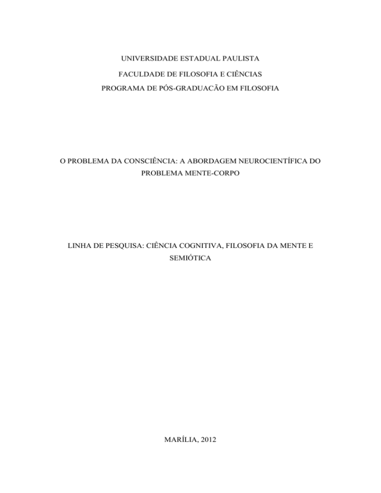 UNIVERSIDADE ESTADUAL PAULISTA FACULDADE DE FILOSOFIA E CIÊNCIAS PROGRAMA DE PÓS-GRADUACÃO EM FILOSOFIA O PROBLEMA DA CONSCIÊNCIA: A ABORDAGEM NEUROCIENTÍFICA DO PROBLEMA MENTE-CORPO LINHA DE PESQUISA: CIÊNCIA COGNITIVA, FILOSOFIA DA MENTE E SEMIÓTICA MARÍLIA, 2012 DIOGO FERNANDO MASSMANN O PROBLEMA DA CONSCIÊNCIA: A ABORDAGEM NEUROCIENTÍFICA DO PROBLEMA MENTE-CORPO Universidade Estadual Paulista Júlio Mesquita Filho Dissertação submetida à defesa de mestrado no Programa de Pós-Graduação em Filosofia da Unesp, na Área de Epistemologia, Lógica e Filosofia da Mente e na linha de pesquisa: Ciências Cognitivas, Filosofia da Mente e Semiótica. Orientador Professor Dr. Alfredo Pereira Jr. Co-orientadora professora Dra. Mariana Claudia Broens MARÍLIA, 2012 2 M418p Massmann, Diogo Fernando. O problema da consciência: a abordgem neurocientífica do problema-corpo / Diogo Fernando Massmann. – Marília, 2012. 109 f. ; 30 cm. Dissertação (Mestrado em Filosofia) – Universidade Estadual Paulista, Faculdade de Filosofia e Ciências, 2012. Bibliografia: f. 106-109 Orientador: Alfredo Pereira Jr Co-Orientadora: Mariana C. Broens 1. Psicologia. 2. Consciência. 3. Neurociências. 4. Materialismo. I. Autor. II. Título. CDD 126 3 O Problema da Consciência: a abordagem neurocientífica do problema mente-corpo 4 Aos meus pais e a minha irmã. 5 AGRADECIMENTOS Acho que agradecer significa reconhecer e relembrar: reconhecer quem lhe ajudou e cooperou com você e relembrar dos momentos mais importantes do seu passado. Agradeço, primeiramente, aos meus pais (Pedro E. Massmann e Maria I. Mallmann Massmann) e a minha irmã (Vanessa Laís Mallmann Massmann) pelo apoio incondicional aos meus estudos desde o início da minha vida acadêmica superando as dificuldades e abrindo mão de muitos objetivos seus. Não posso deixar de lembrar os meus demais familiares: tios e tias, primos e primas, avôs e avós. Gostaria de agradecer aos meus orientadores e amigos: Alfredo Pereira Jr e Mariana Claudia Broens, e a minha professora e amiga Maria Eunice Quilici Gonzalez, pelo ensino e incentivo, pela confiança e paciência que depositaram em mim e tiveram comigo nestes anos aqui em Marília. Vocês ensinaram-me muito, não apenas em filosofia e em ciências em geral, mas também em como ser uma pessoa melhor. Gostaria de agradecer a todos os professores do Programa de Pós-Graduação em Filosofia que me deram aulas e me ensinaram muito do pouco que sei. Também gostaria de agradecer a CAPES pelo financiamento a minha pesquisa durante o meu mestrado. É importante lembrar também da UNESP e do Programa de Pós-Graduação (Mestrado) em Filosofia que mostraram ser um espaço adequado de estudo e pesquisa. Agradeço a todos os funcionários da UNESP: do Programa de PósGraduação em Filosofia (em especial, Paulo Sérgio Teles e Cíntia Lima Raphael), do Departamento de Filosofia (em especial, Edna Bonini) e da Biblioteca Central da UNESP-Marília. Lembro também dos meus colegas de mestrado com quem partilhei muitos momentos importantes e com quem pude compartilhar muitos pensamentos: Juliana Moroni, Samuel Leite, Alexandre Ferraz, Danilo Ramos, Gustavo Vargas, Giovanni Guidi, Ana Claudia Golzio e Kleydison Oliveira. Lembro também dos professores e 6 amigos Leonardo F. Almada, Ramon Andrade e Antonio Trajano M. de Arruda que também participaram da minha banca de qualificação, da minha defesa de mestrado e colaboraram muito para o aperfeiçoamento do meu trabalho. Quero agradecer aos amigos: Amanda Botelho de Morais (que sempre me ouviu e me apoiou), Cristina Soares, Lilian Demori, Larissa Lee Karyia, Thaisa Reino, Marianna Loureiro, Caroline Santos, Renata Alonge, Renata Silva, Bruna Lemes, Talita Beltrão, João Morais, Thomas Machado, Bruno Cardozo de Melo, Wendel e outros. Lembro também dos amigos do “Pensionato Universitário”: Bruno Shimada, Fernando Santella e Joyce Santella, Cristiano Silva, Paulo Martins e Luana Bazzi, Ricardo, Brasilina Matera, Carlos Matera (in memorium) e toda família Matera. Quero agradecer aos amigos e companheiros de futebol da Unesp: professor e amigo Marcos Alves e Floriano. Aos meus amigos do Rio Grande do Sul: Cássio Kraemer, Guilherme Ullmann, Fernando Ullmann, Nilo Simionato e Carlos E. Grun. Eu penso que nós não conquistamos nada sozinhos, pois vivemos cercados de pessoas que colaboram conosco para que acreditemos nos nossos sonhos e conquistemos nossos objetivos. Familiares, professores, colegas e amigos são elementos cruciais na jornada que é a nossa vida. Sem eles, nós não superaríamos nossas dificuldades e não ultrapassaríamos nossas limitações. Muitas pessoas que nos marcam nós deixamos para trás, pois seguimos caminhos diferentes. Mas ainda outras pessoas virão e também marcarão nossas vidas e esperamos que sejam tão importantes quanto as que passaram. Agradeço a todos. 7 Somos criaturas da matéria. E deveríamos aprender a conviver com esse fato. Paul M. Churchland Por nos acharmos inteligentes, embora talvez sem muita razão, tendemos a ver a inteligência como uma conseqüência inevitável da evolução. Mas isso é questionável. Não está claro que a inteligência possui grande valor de sobrevivência. As bactérias se defendem muito bem sem inteligência e sobreviverão a nós se a nossa suposta inteligência provocar nosso extermínio em uma guerra nuclear. Stephen Hawking 8 RESUMO Este trabalho tem o objetivo de tematizar o problema mente-cérebro (o tradicional problema mente-corpo) e o problema da consciência quando abordados pela neurociência. Para realizar tal objetivo, primeiramente, procuramos formular os dois problemas partindo do problema mente-corpo tradicional segundo a perspectiva cartesiana. A partir disso, buscamos mostrar como que o problema mente-corpo tradicional deu origem ao problema mente-cérebro contemporâneo, bem como, o modo como o problema mente-cérebro contemporâneo se liga ao problem