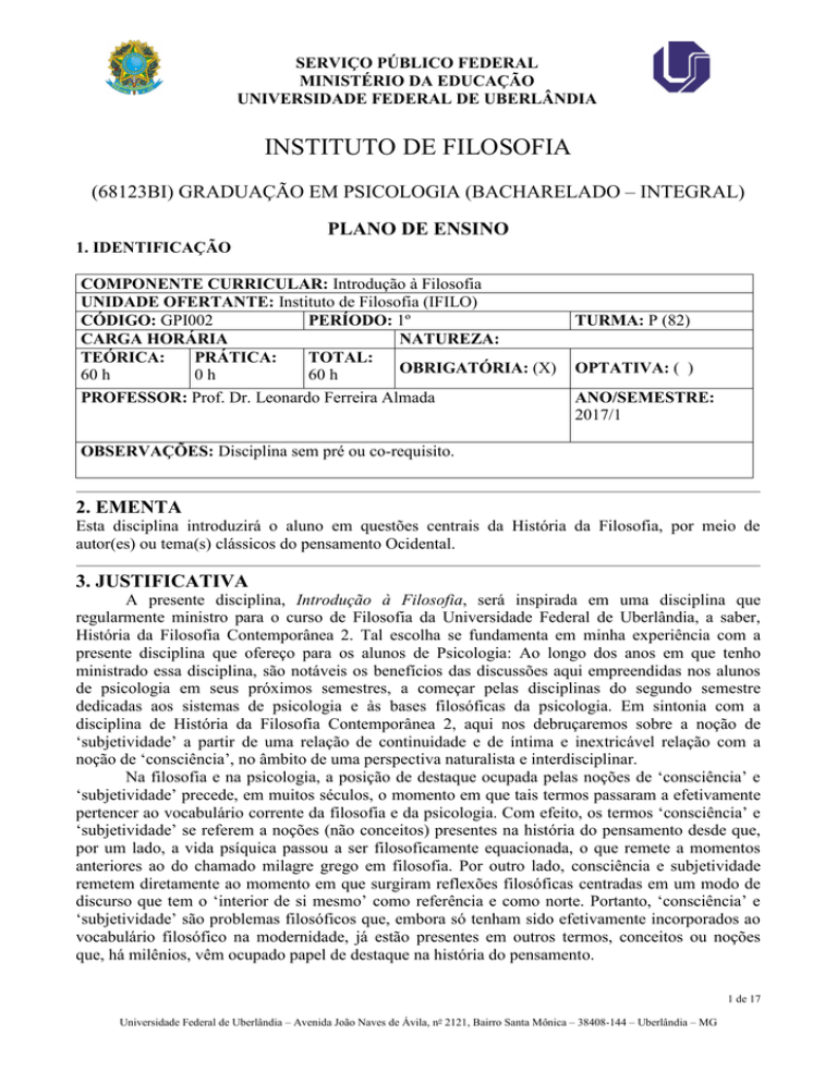 SERVIÇO PÚBLICO FEDERAL MINISTÉRIO DA EDUCAÇÃO UNIVERSIDADE FEDERAL DE UBERLÂNDIA INSTITUTO DE FILOSOFIA (68123BI) GRADUAÇÃO EM PSICOLOGIA (BACHARELADO – INTEGRAL) PLANO DE ENSINO 1. IDENTIFICAÇÃO COMPONENTE CURRICULAR: Introdução à Filosofia UNIDADE OFERTANTE: Instituto de Filosofia (IFILO) CÓDIGO: GPI002 PERÍODO: 1º CARGA HORÁRIA NATUREZA: TEÓRICA: PRÁTICA: TOTAL: OBRIGATÓRIA: (X) 60 h 0h 60 h PROFESSOR: Prof. Dr. Leonardo Ferreira Almada TURMA: P (82) OPTATIVA: ( ) ANO/SEMESTRE: 2017/1 OBSERVAÇÕES: Disciplina sem pré ou co-requisito. 2. EMENTA Esta disciplina introduzirá o aluno em questões centrais da História da Filosofia, por meio de autor(es) ou tema(s) clássicos do pensamento Ocidental. 3. JUSTIFICATIVA A presente disciplina, Introdução à Filosofia, será inspirada em uma disciplina que regularmente ministro para o curso de Filosofia da Universidade Federal de Uberlândia, a saber, História da Filosofia Contemporânea 2. Tal escolha se fundamenta em minha experiência com a presente disciplina que ofereço para os alunos de Psicologia: Ao longo dos anos em que tenho ministrado essa disciplina, são notáveis os benefícios das discussões aqui empreendidas nos alunos de psicologia em seus próximos semestres, a começar pelas disciplinas do segundo semestre dedicadas aos sistemas de psicologia e às bases filosóficas da psicologia. Em sintonia com a disciplina de História da Filosofia Contemporânea 2, aqui nos debruçaremos sobre a noção de ‘subjetividade’ a partir de uma relação de continuidade e de íntima e inextricável relação com a noção de ‘consciência’, no âmbito de uma perspectiva naturalista e interdisciplinar. Na filosofia e na psicologia, a posição de destaque ocupada pelas noções de ‘consciência’ e ‘subjetividade’ precede, em muitos séculos, o momento em que tais termos passaram a efetivamente pertencer ao vocabulário corrente da filosofia e da psicologia. Com efeito, os termos ‘consciência’ e ‘subjetividade’ se referem a noções (não conceitos) presentes na história do pensamento desde que, por um lado, a vida psíquica passou a ser filosoficamente equacionada, o que remete a momentos anteriores ao do chamado milagre grego em filosofia. Por outro lado, consciência e subjetividade remetem diretamente ao momento em que surgiram reflexões filosóficas centradas em um modo de discurso que tem o ‘interior de si mesmo’ como referência e como norte. Portanto, ‘consciência’ e ‘subjetividade’ são problemas filosóficos que, embora só tenham sido efetivamente incorporados ao vocabulário filosófico na modernidade, já estão presentes em outros termos, conceitos ou noções que, há milênios, vêm ocupado papel de destaque na história do pensamento. 1 de 17 Universidade Federal de Uberlândia – Avenida João Naves de Ávila, no 2121, Bairro Santa Mônica – 38408-144 – Uberlândia – MG SERVIÇO PÚBLICO FEDERAL MINISTÉRIO DA EDUCAÇÃO UNIVERSIDADE FEDERAL DE UBERLÂNDIA Com efeito, dado a polissemia que tem caracterizado a presença destes termos no âmbito da filosofia contemporânea, a possibilidade de íntima relação entre os dois conceitos dependerá da definição operacional a que recorremos na manipulação desses termos. Este é o caso da definição operacional sobre a qual me estabeleço, em consequência da qual não é possível que pensemos a subjetividade senão como propriedade da consciência, assim como não é possível, da mesma forma, e por outro lado, pensar a consciência senão a partir da consideração da subjetividade como uma de suas mais distintivas propriedades. Ao longo da presente disciplina de Introdução à Filosofia, as definições operacionais que destinarei a esses termos nos conduzirão a equacionar a noção de ‘subjetividade’ a partir de uma relação de continuidade e de íntima e inextricável relação com a noção de ‘consciência’. Assim como ocorre com o termo ‘consciência’, o termo ‘subjetividade’ também só foi incorporado ao vocabulário filosófico a partir da modernidade, e também adquiriu, na contemporaneidade, um papel ainda mais vigoroso, quando passaram a ocupar novos e diversos outros espaços de discussão a partir do século XX. Dada a amplitude e a extensão desses novos e diversos espaços de discussão, é verdade que uma discussão genérica sobre a ‘subjetividade’ na contemporaneidade não poderia ser suficientemente contemplada no interior de uma única disciplina: não seria razoável subdividir essa disciplina nas diversas áreas da filosofia e da psicologia que trabalham — de uma forma ou de outra, e segundo conceituações muito distintas — com a expressão ‘subjetividade’. As mesmas lacunas se verificariam se procedêssemos a uma discussão sobre a ‘consciência’ a partir de uma noção mais ampla e, portanto, mais vaga: com efeito, não seria razoável tratar dos diversos autores, áreas da filosofia e da psicologia filosofia da mente, e os mais variados tratamentos conceituais geradas pela natureza polissêmica da expressão ‘consciência’. Esse quadro geral exige um esforço significativo por parte de filósofos, psicólogos e de outros profissionais da mente: com efeito, uma discussão filosófica que envolva a conceituação de ‘consciência’ e ‘subjetividade’ dificilmente ultrapassará a esfera da vagueza e da ausência de carga comunicativa sem prévias e sólidas definições operacionais das noções de ‘consciência’ e de ‘subjetividade’ sobre as quais estamos debruçados. Ainda que eu reconheça que o ofício de oferecer definições operacionais para termos envoltos em uma tão sofisticada, tão complexa e tão vasta rede de definições conceituais não seja propriamente simples, esse é um dos intuitos que — implícita ou explicitamente, direta ou indiretamente — norteará essa presente disciplina de História da Filosofia 