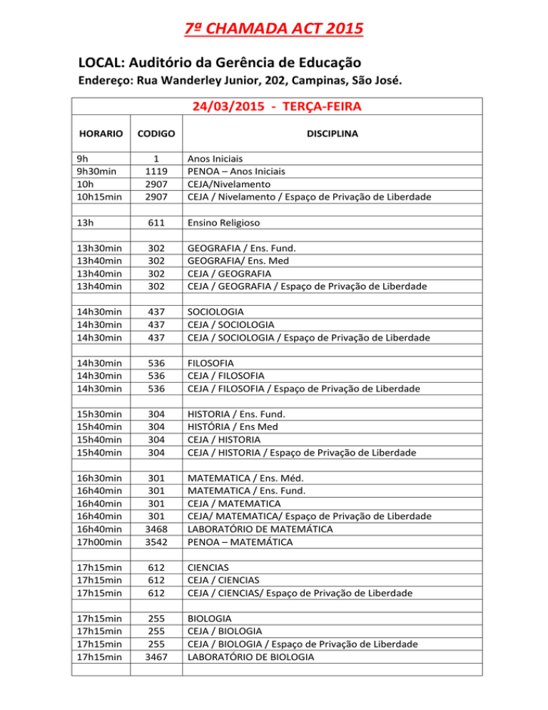 7ª CHAMADA ACT 2015 LOCAL: Auditório da Gerência de Educação Endereço: Rua Wanderley Junior, 202, Campinas, São José. 24/03/2015 - TERÇA-FEIRA HORARIO CODIGO DISCIPLINA 9h 9h30min 10h 10h15min 1 1119 2907 2907 Anos Iniciais PENOA – Anos Iniciais CEJA/Nivelamento CEJA / Nivelamento / Espaço de Privação de Liberdade 13h 611 Ensino Religioso 13h30min 13h40min 13h40min 13h40min 302 302 302 302 GEOGRAFIA / Ens. Fund. GEOGRAFIA/ Ens. Med CEJA / GEOGRAFIA CEJA / GEOGRAFIA / Espaço de Privação de Liberdade 14h30min 14h30min 14h30min 437 437 437 SOCIOLOGIA CEJA / SOCIOLOGIA CEJA / SOCIOLOGIA / Espaço de Privação de Liberdade 14h30min 14h30min 14h30min 536 536 536 FILOSOFIA CEJA / FILOSOFIA CEJA / FILOSOFIA / Espaço de Privação de Liberdade 15h30min 15h40min 15h40min 15h40min 304 304 304 304 HISTORIA / Ens. Fund. HISTÓRIA / Ens Med CEJA / HISTORIA CEJA / HISTORIA / Espaço de Privação de Liberdade 16h30min 16h40min 16h40min 16h40min 16h40min 17h00min 301 301 301 301 3468 3542 MATEMATICA / Ens. Méd. MATEMATICA / Ens. Fund. CEJA / MATEMATICA CEJA/ MATEMATICA/ Espaço de Privação de Liberdade LABORATÓRIO DE MATEMÁTICA PENOA – MATEMÁTICA 17h15min 17h15min 17h15min 612 612 612 CIENCIAS CEJA / CIENCIAS CEJA / CIENCIAS/ Espaço de Privação de Liberdade 17h15min 17h15min 17h15min 17h15min 255 255 255 3467 BIOLOGIA CEJA / BIOLOGIA CEJA / BIOLOGIA / Espaço de Privação de Liberdade LABORATÓRIO DE BIOLOGIA 25/03/2015 - QUARTA-FEIRA HORÁRIO 13h 13h 13h 13h 13h 13h CÓDIGO 3315 3314 3463 3464 DISCIPLINA PROJETO – Mais Educação PROJETO – Escola Aberta PROFESSOR ORIENTADOR DE LEITURA PROFESSOR ORIENTADOR DE CONVIVÊNCIA Projetos EMI / Esporte /Artes Projeto Ambial 13h15min Disciplinas do CEDUP 13h30min Disciplinas do Magistério 13h30min 3307 TECNOLOGIA EDUCACIONAL 14h00min 14h00min 14h00min 14h00min 14h00min 2474 2472 1302 1155 1881 SAEDE ED. ESPECIAL – PROF BILINGUE PROFESSOR INSTRUTOR DE LIBRAS PROFESSOR INTERPRETE DE LIBRAS Atendimento domiciliar 14h30min 1344 Segundo Professor 26/03/2015 - QUINTA-FEIRA HORÁRIO CÓDIGO DISCIPLINA 13h30min 13h45min 13h45min 202 202 202 PORTUGUÊS / Ens. Fund. CEJA / PORTUGUÊS CEJA / PORTUGUÊS / Espaço de Privação de Liberdade 13h45min 13h45min 13h45min 401 401 401 LÍNGUA PORTUGUESA / Ens. Médio CEJA / LÍNGUA PORTUGUESA CEJA / LÍNGUA PORTUGUESA / Espaço de Privação de Liberdade 13h45min 3541 PENOA - PORTUGUÊS 14h30min 14h45min 14h45min 14h45min 319 319 319 319 INGLES/ ENS. FUND. INGLES/ ENS. MED CEJA / INGLES CEJA / INGLES / Espaço de Privação de Liberdade 15h30min 15h30min 15h30min 15h30min 320 320 320 320 ESPANHOL / ENS. FUND ESPANHOL / ENS. MED CEJA / ESPANHOL CEJA / ESPANHOL / Espaço de Privação de Liberdade 16h 16h 16h 307 307 307 EDUCAÇÃO FÍSICA CEJA / EDUCAÇÃO FÍSICA CEJA / EDUCAÇÃO FÍSICA / Espaço de Privação de Liberdade 17h 17h 17h 17h 513 513 513 3465 QUIMICA CEJA / QUMICA CEJA/ QUMICA / Espaço de Privação de Liberdade LABORATÓRIO DE QUÍMICA 17h15min 17h15min 17h15min 17h15min 475 475 475 3466 FÍSICA CEJA / FÍSICA CEJA/ FÍSICA / Espaço de Privação de Liberdade LABORATÓRIO DE FÍSICA 17h30min 17h30min 628 628 CEJA / ARTE / Espaço de Privação de Liberdade ARTE Observação: A chamada pública será feita de acordo com o edital 02/2015, ao término de cada disciplina caso NÃO seja preenchida todas as vagas.
