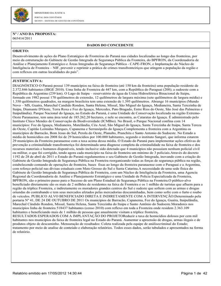 MINISTERIO DA JUSTICA PORTAL DOS CONVÊNIOS SICONV - SISTEMA DE GESTÃO DE CONVÊNIOS Nº / ANO DA PROPOSTA: 065414/2011 DADOS DO CONCEDENTE OBJETO: Desenvolvimento de ações do Plano Estratégico de Fronteiras do Paraná nas cidades localizadas ao longo das fronteiras, por meio da estruturação do Gabinete de Gestão Integrada de Segurança Pública da Fronteira, do BPFRON, da Coordenadoria de Análise e Planejamento Estratégico e Áreas Integradas de Segurança Pública - CAPE-FRON, e Implantação do Núcleo de Inteligência de Fronteira – NIF, prevenir e reprimir a prática de crimes transfronteiriços que atingem a população da região e com reflexos em outras localidades do país”. JUSTIFICATIVA: DIAGNÓSTICO O Paraná possui 139 municípios na faixa de fronteira (até 150 km da fronteira) uma população residente de 2.372.846 habitantes (IBGE 2010). Uma linha de Fronteira de 447 km, com a República do Paraguai (208); a sudoeste com a República da Argentina (239 km). O Lago de Itaipu – reservatório de água da Usina Hidroelétrica Binacional de Itaipu, formado em 1982 possui 170 quilômetros de extensão, 12 quilômetros de largura máxima (sete quilômetros de largura média) e 1.350 quilômetros quadrados, na margem brasileira tem uma extensão de 1.395 quilômetros. Abrange 16 municípios (Mundo Novo – MS, Guaíra, Marechal Candido Rondon, Santa Helena, Missal, São Miguel do Iguaçu, Medianeira, Santa Terezinha de Itaipu, Diamante D'Oeste, Terra Roxa e Foz do Iguaçu, Mercedes, Pato Bragado, Entre Rios do Oeste, São José das Palmeiras e Itaipulândia). Parque Nacional do Iguaçu, no Estado do Paraná, é uma Unidade de Conservação localizada na região ExtremoOeste Paranaense, tem uma área total de 185.262,20 hectares, e nele se encontra, as Cataratas do Iguaçu. É administrado pelo Instituto Chico Mendes de Conservação da Biodiversidade (ICMBio). No Brasil, o Parque Nacional confina com 14 municípios: Foz do Iguaçu, Medianeira, Matelândia, Céu Azul, São Miguel do Iguaçu, Santa Terezinha de Itaipu, Santa Tereza do Oeste, Capitão Leônidas Marques, Capanema e Serranópolis do Iguaçu.Complementa a fronteira com a Argentina os municípios de Barracão, Bom Jesus do Sul, Perola do Oeste, Planalto, Pranchita e Santo Antonio do Sudoeste. No Estado a média de homicídios em 2008 foi de 29 homicídios por 100.000 habitantes, segundo o instituto Sangari, que informa estarem 29 municípios da Fronteira paranaense com a taxa acima dessa média. O Estado do Paraná para implementar ações efetivas de prevenção a criminalidade transfronteriça foi determinada uma diagnose completa da criminalidade na faixa de fronteira e dos recursos materiais e humanos disponíveis, tendo inclusive sido detctado que 4 municípios não possuíam nenhum policial civil ou militar, o que foi corrigido, tendo agora cada município na faixa de fronteira um mínimo de 3 policiais.Através do decreto 1192 de 28 de abril de 2011 o Estado do Paraná regulamentou o seu Gabinete de Gestão Integrada, inovando com a criação do Gabinete de Gestão Integrada de Segurança Pública na Fronteira reorganizando todas as forças de segurança pública na região, estabelecendo comando de operações de fronteira, bases fixas ao longo da fronteira paranaense com o Paraguai e a Argentina, com reforço policial nas divisas estaduais com Mato Grosso do Sul e Santa Catarina.A necessidade de uma sede física do Gabinete de Gestão Integrada de Segurança Pública de Fronteira, com um Núcleo de Inteligência da Fronteira, uma Agencia Regional da Coordenadoria de Análise e Planejamento Estratégico e uma Unidade de Policia Especializada da Fronteira, BPFRON, são o primeiro passo para o Sucesso de um Plano Estadual de Segurança Pública na Fronteira.O público-alvo beneficiado diretamente são os mais de 2 milhões de residentes na faixa de Fronteira e os 1 milhão de turistas que afluem para a região da tríplice Fronteira, e indiretamente os moradores grandes centros do Sul e sudeste que sofrem com as armas e drogas oriundas do contrabando e tem seus mercados afetados pelas mercadorias descaminhadas, bem como sofre com o furto e roubo de veículos. PUBLICO ALVO BENEFICIADO DIRETA E INDIRETAMENTE COM A INTERVENÇÃO:Determinado pela portaria Nº 41, DE 24 DE OUTUBRO DE 2011 Os municípios de Barracão, Capanema, Foz do Iguaçu, Guaíra, Itaipulândia, Marechal Cândido Rondon, Missal, Santa Helena, Santa Terezinha do Itaipu e Santo Antônio do Sudoeste.Moradores nos municípios linha de fronteira 518437 habitantes (censo 2010) com reflexo em toda a Fronteira onde residem 2.363.109 habitantes e beneficiando mais de 1 milhão de pessoas que anualmente visitam a tríplice fronteira, RESULTADOS ESPERADOS COM A IMPLANTAÇÃO DO PROJETOReduzir a taxa de homicídios dolosos por cem mil habitantes nos municípios da faixa de fronteira legal no Estado do Paraná. Aumentar a apreensão de drogas, armas ilegais e de produtos objeto de descaminho. Mensuração de resultados: Coleta realizada pela equipe de análisecriminal do Estado; tratamento por meio de analise de conteúdo e elaboração relatórios. Todos esses dados, serão tabulados e apresentados na forma de relatório. Relatório emitido em 17/05/2012 14:30:44 Página 1 de 42 FUNDAMENTO LEGAL: Lei 8.666/93, LC 101/00, Decreto 6.170/07, Lei 11.530/07 e Portaria MPOG 127/08. CONCEDENTE: 30000 CIDADE: NOME DO ÓRGÃO/ÓRGÃO SUBORDINADO OU UG: MINISTERIO DA JUSTICA UF: CÓDIGO DO MUNICÍPIO: CEP: CPF DO RESPONSÁVEL PELO CONCEDENTE: 05250753809 NOME DO RESPONSÁVEL: REGINA MARIA FILOMENA DE LUCA MIKI ENDEREÇO DO RESPONSÁVEL PELO CONCEDENTE: MINISTÉRIO DA JUSTIÇA - ED. SEDE 4º ANDAR C.E.P DO RESPONSÁVEL PELO CONCEDENTE: 70064-900 Relatório emitido em 17/05/2012 14:30:44 Página 2 de 42 2 - DADOS DO PROPONENTE PROPONENTE: 76416932000181 RAZÃO SOCIAL DO PROPONENTE: SECRETARIA DE ESTADO DA SEGURANCA PUBLICA ENDEREÇO JURÍDICO DO PROPONENTE: 