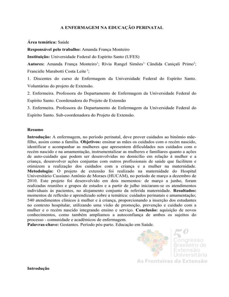 A ENFERMAGEM NA EDUCAÇÃO PERINATAL Área temática: Saúde Responsável pelo trabalho: Amanda França Monteiro Instituição: Universidade Federal do Espírito Santo (UFES) Autores: Amanda França Monteiro1; Rívia Rangel Simões1; Cândida Caniçali Primo2; Franciéle Marabotti Costa Leite 3; 1. Discentes do curso de Enfermagem da Universidade Federal do Espírito Santo. Voluntárias do projeto de Extensão. 2. Enfermeira. Professora do Departamento de Enfermagem da Universidade Federal do Espírito Santo. Coordenadora do Projeto de Extensão 3. Enfermeira. Professora do Departamento de Enfermagem da Universidade Federal do Espírito Santo. Sub-coordenadora do Projeto de Extensão. Resumo Introdução: A enfermagem, no período perinatal, deve prover cuidados ao binômio mãefilho, assim como a família. Objetivos: ensinar as mães os cuidados com o recém nascido, identificar e acompanhar as mulheres que apresentem dificuldades nos cuidados com o recém nascido e na amamentação, instrumentalizar as mulheres e familiares quanto a ações de auto-cuidado que podem ser desenvolvidas no domicílio em relação à mulher e a criança, desenvolver ações conjuntas com outros profissionais de saúde que facilitem e otimizem a realização dos cuidados com a criança e a mulher na maternidade. Metodologia: O projeto de extensão foi realizado na maternidade do Hospital Universitário Cassiano Antônio de Moraes (HUCAM), no período de março a dezembro de 2010. Este projeto foi desenvolvido em dois momentos: de março a junho, foram realizadas reuniões e grupos de estudos e a partir de julho iniciaram-se os atendimentos individuais às pacientes, no alojamento conjunto da referida maternidade. Resultados: momentos de reflexão e aprendizado sobre a temática: cuidados perinatais e amamentação; 540 atendimentos clínicos à mulher e à criança, proporcionando a inserção dos estudantes no contexto hospitalar, utilizando uma visão de promoção, prevenção e cuidado com a mulher e o recém nascido integrando ensino e serviço. Conclusão: aquisição de novos conhecimentos, como também ampliamos a autoconfiança de ambos os sujeitos do processo - comunidade e acadêmicos de enfermagem. Palavras-chave: Gestantes. Período pós-parto. Educação em Saúde. Introdução A carência de informações, ou informações inadequadas sobre o parto, o medo do desconhecido, bem como os cuidados a serem prestados ao recém-nascido nos primeiros dias são fatores mais comuns de tensão para puérperas, o que influenciam negativamente durante todo o processo gestacional. Dessa forma, é de competência da equipe de saúde acolher a gestante e a família, desde o primeiro contato com o serviço de saúde¹. No período perinatal, a enfermagem deve ficar atenta para também, interpretar a percepção que a gestante tem com relação a sua experiência da maternidade no contexto mais amplo (ambiente, família, mudanças físicas, psicológicas e sociais) por ser essa uma experiência única. O profissional, enfermeiro, não deve impor seus conhecimentos e desconsiderar a realidade do cliente; caso isto aconteça, as orientações dadas poderão não ser adotadas por incompatibilidade com essa realidade. Conhecer as necessidades de aprendizagem das gestantes no período perinatal é considerar a importância da cliente na determinação de seu autocuidado². Entendendo essas necessidades, o projeto teve como objetivos: ensinar as mães os cuidados com o recém nascido, identificar e acompanhar as mulheres que apresentem dificuldades nos cuidados com o recém nascido e na amamentação, instrumentalizar as mulheres e familiares quanto a ações de auto-cuidado que podem ser desenvolvidas no domicílio em relação à mulher e a criança, desenvolver ações conjuntas com outros profissionais de saúde que facilitem e otimizem a realização dos cuidados com a criança e a mulher na maternidade. Material e Metodologia O projeto de extensão foi realizado na maternidade do Hospital Universitário Cassiano Antônio de Moraes (HUCAM), localizado no município de Vitória, Espírito Santo, que é referência no atendimento à gestação de alto risco. O período de realização foi de março a dezembro de 2010. A fim de capacitar a todos os participantes, organizar e planejar as ações a serem desenvolvidas, inicialmente, no período de março a junho, foram realizadas reuniões e grupos de estudos com as seguintes temáticas: amamentação e cuidados perinatais à mulher e à criança. Para apresentação dos temas foram feitas leitura e discussão de artigos e dissertações para embasamento teórico do projeto e organização dos instrumentos metodológicos que foram utilizados para registro dos atendimentos na maternidade, totalizando oito encontros. A partir de julho iniciaram-se os atendimentos individuais às pacientes, através de visita sistemática dos acadêmicos de enfermagem ao alojamento conjunto da maternidade do HUCAM, destaca-se que todas as visitas dos acadêmicos foram supervisionadas pelo coordenador do projeto. Durante esses atendimentos foram realizadas as orientações às gestantes e/ou puérperas, acerca dos cuidados com o recém nascido e amamentação, além da identificado as dificuldades na amamentação. Ressalta-se a relevância de tais atividades terem sido desenvolvidas conjuntamente com outros profissionais de saúde o que facilitou a realização dos cuidados com a criança e a mulher na maternidade. Para o desenvolvimento deste projeto houve a participação da seguinte equipe: enfermeiros-professores da instituição de ensino, enfermeiros da instituição hospitalar e acadêmicos de enfermagem. Vale pontuar que todas as atividades desenvolvidas foram registradas em um instrumento metodológico elaborado pela equipe participante. Resultados e Discussões O grupo de estudo proporcionou aos estudantes momentos de reflexão e aprendizado sobre a temática: cuidados perina