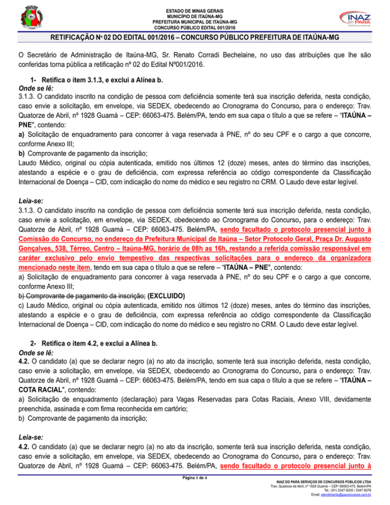 ESTADO DE MINAS GERAIS MUNICÍPIO DE ITAÚNA-MG PREFEITURA MUNICIPAL DE ITAÚNA-MG CONCURSO PÚBLICO EDITAL 001/2016 RETIFICAÇÃO Nº 02 DO EDITAL 001/2016 – CONCURSO PÚBLICO PREFEITURA DE ITAÚNA-MG O Secretário de Administração de Itaúna-MG, Sr. Renato Corradi Bechelaine, no uso das atribuições que lhe são conferidas torna pública a retificação nº 02 do Edital Nº001/2016. 1- Retifica o item 3.1.3, e exclui a Alínea b. Onde se lê: 3.1.3. O candidato inscrito na condição de pessoa com deficiência somente terá sua inscrição deferida, nesta condição, caso envie a solicitação, em envelope, via SEDEX, obedecendo ao Cronograma do Concurso, para o endereço: Trav. Quatorze de Abril, nº 1928 Guamá – CEP: 66063-475. Belém/PA, tendo em sua capa o título a que se refere – “ITAÚNA – PNE", contendo: a) Solicitação de enquadramento para concorrer à vaga reservada à PNE, nº do seu CPF e o cargo a que concorre, conforme Anexo III; b) Comprovante de pagamento da inscrição; Laudo Médico, original ou cópia autenticada, emitido nos últimos 12 (doze) meses, antes do término das inscrições, atestando a espécie e o grau de deficiência, com expressa referência ao código correspondente da Classificação Internacional de Doença – CID, com indicação do nome do médico e seu registro no CRM. O Laudo deve estar legível. Leia-se: 3.1.3. O candidato inscrito na condição de pessoa com deficiência somente terá sua inscrição deferida, nesta condição, caso envie a solicitação, em envelope, via SEDEX, obedecendo ao Cronograma do Concurso, para o endereço: Trav. Quatorze de Abril, nº 1928 Guamá – CEP: 66063-475. Belém/PA, sendo facultado o protocolo presencial junto à Comissão do Concurso, no endereço da Prefeitura Municipal de Itaúna – Setor Protocolo Geral, Praça Dr. Augusto Gonçalves, 538, Térreo, Centro – Itaúna-MG, horário de 08h as 16h, restando a referida comissão responsável em caráter exclusivo pelo envio tempestivo das respectivas solicitações para o endereço da organizadora mencionado neste item, tendo em sua capa o título a que se refere – “ITAÚNA – PNE", contendo: a) Solicitação de enquadramento para concorrer à vaga reservada à PNE, nº do seu CPF e o cargo a que concorre, conforme Anexo III; b) Comprovante de pagamento da inscrição; (EXCLUIDO) c) Laudo Médico, original ou cópia autenticada, emitido nos últimos 12 (doze) meses, antes do término das inscrições, atestando a espécie e o grau de deficiência, com expressa referência ao código correspondente da Classificação Internacional de Doença – CID, com indicação do nome do médico e seu registro no CRM. O Laudo deve estar legível. 2- Retifica o item 4.2, e exclui a Alínea b. Onde se lê: 4.2. O candidato (a) que se declarar negro (a) no ato da inscrição, somente terá sua inscrição deferida, nesta condição, caso envie a solicitação, em envelope, via SEDEX, obedecendo ao Cronograma do Concurso, para o endereço: Trav. Quatorze de Abril, nº 1928 Guamá – CEP: 66063-475. Belém/PA, tendo em sua capa o título a que se refere – “ITAÚNA – COTA RACIAL", contendo: a) Solicitação de enquadramento (declaração) para Vagas Reservadas para Cotas Raciais, Anexo VIII, devidamente preenchida, assinada e com firma reconhecida em cartório; b) Comprovante de pagamento da inscrição; Leia-se: 4.2. O candidato (a) que se declarar negro (a) no ato da inscrição, somente terá sua inscrição deferida, nesta condição, caso envie a solicitação, em envelope, via SEDEX, obedecendo ao Cronograma do Concurso, para o endereço: Trav. Quatorze de Abril, nº 1928 Guamá – CEP: 66063-475. Belém/PA, sendo facultado o protocolo presencial junto à Página 1 de 4 INAZ DO PARÁ SERVIÇOS DE CONCURSOS PÚBLICOS LTDA Trav. Quatorze de Abril, nº 1928 Guamá – CEP: 66063-475. Belém/PA Tel.: (91) 3347-5205 / 3347-8376 Email: [email protected] ESTADO DE MINAS GERAIS MUNICÍPIO DE ITAÚNA-MG PREFEITURA MUNICIPAL DE ITAÚNA-MG CONCURSO PÚBLICO EDITAL 001/2016 Comissão do Concurso, no endereço da Prefeitura Municipal de Itaúna – Setor Protocolo Geral, Praça Dr. Augusto Gonçalves, 538, Térreo, Centro – Itaúna-MG, horário de 08h as 16h, restando a referida comissão responsável em caráter exclusivo pelo envio tempestivo das respectivas solicitações para o endereço da organizadora mencionado neste item, tendo em sua capa o título a que se refere – “ITAÚNA – COTA RACIAL", contendo: a) Solicitação de enquadramento (declaração) para Vagas Reservadas para Cotas Raciais, Anexo VIII, devidamente preenchida, assinada e com firma reconhecida em cartório; b) Comprovante de pagamento da inscrição; (EXCLUIDO) 3- Retifica o item 8.2.3 Onde se lê: 8.2.3. Enviar envelope, via SEDEX, obedecendo ao Cronograma do Concurso, para o endereço Trav. Quatorze de Abril, nº 1928 Guamá – CEP: 66063-475. Belém/PA, tendo em sua capa o título a que se refere – “ITAÚNA – ISENÇÃO”, contendo: a) Formulário de Solicitação de Isenção para pessoas Hipossuficientes, Anexo IV, preenchido e assinado, informando o número de Identificação Social (NIS), atribuído pelo CadÚnico; e b) Declaração de que é membro de família de baixa renda, nos termos do Decreto Federal nº 6.135, de 26 de junho de 2007. Leia-se: 8.2.3. Enviar envelope, via SEDEX, obedecendo ao Cronograma do Concurso, para o endereço Trav. Quatorze de Abril, nº 1928 Guamá – CEP: 66063-475. Belém/PA, sendo facultado o protocolo presencial junto à Comissão do Concurso, no endereço da Prefeitura Municipal de Itaúna – Setor Protocolo Geral, Praça Dr. Augusto Gonçalves, 538, Térreo, Centro – Itaúna-MG, horário de 08h as 16h, restando a referida comissão responsável em caráter exclusivo pelo envio tempestivo das respectivas solicitações para o endereço da organizadora mencionado neste item, tendo em sua capa o título a que se refere