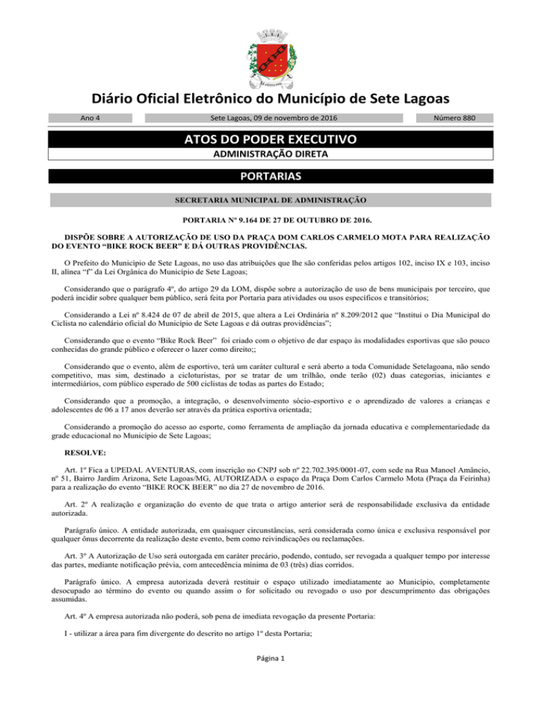 Diário Oficial Eletrônico do Município de Sete Lagoas Ano 4 Sete Lagoas, 09 de novembro de 2016 Número 880 ATOS DO PODER EXECUTIVO ADMINISTRAÇÃO DIRETA PORTARIAS SECRETARIA MUNICIPAL DE ADMINISTRAÇÃO PORTARIA Nº 9.164 DE 27 DE OUTUBRO DE 2016. DISPÕE SOBRE A AUTORIZAÇÃO DE USO DA PRAÇA DOM CARLOS CARMELO MOTA PARA REALIZAÇÃO DO EVENTO “BIKE ROCK BEER” E DÁ OUTRAS PROVIDÊNCIAS. O Prefeito do Município de Sete Lagoas, no uso das atribuições que lhe são conferidas pelos artigos 102, inciso IX e 103, inciso II, alínea “f” da Lei Orgânica do Município de Sete Lagoas; Considerando que o parágrafo 4º, do artigo 29 da LOM, dispõe sobre a autorização de uso de bens municipais por terceiro, que poderá incidir sobre qualquer bem público, será feita por Portaria para atividades ou usos específicos e transitórios; Considerando a Lei nº 8.424 de 07 de abril de 2015, que altera a Lei Ordinária nº 8.209/2012 que “Institui o Dia Municipal do Ciclista no calendário oficial do Município de Sete Lagoas e dá outras providências”; Considerando que o evento “Bike Rock Beer” foi criado com o objetivo de dar espaço às modalidades esportivas que são pouco conhecidas do grande público e oferecer o lazer como direito;; Considerando que o evento, além de esportivo, terá um caráter cultural e será aberto a toda Comunidade Setelagoana, não sendo competitivo, mas sim, destinado a cicloturistas, por se tratar de um trilhão, onde terão (02) duas categorias, iniciantes e intermediários, com público esperado de 500 ciclistas de todas as partes do Estado; Considerando que a promoção, a integração, o desenvolvimento sócio-esportivo e o aprendizado de valores a crianças e adolescentes de 06 a 17 anos deverão ser através da prática esportiva orientada; Considerando a promoção do acesso ao esporte, como ferramenta de ampliação da jornada educativa e complementariedade da grade educacional no Município de Sete Lagoas; RESOLVE: Art. 1º Fica a UPEDAL AVENTURAS, com inscrição no CNPJ sob nº 22.702.395/0001-07, com sede na Rua Manoel Amâncio, nº 51, Bairro Jardim Arizona, Sete Lagoas/MG, AUTORIZADA o espaço da Praça Dom Carlos Carmelo Mota (Praça da Feirinha) para a realização do evento “BIKE ROCK BEER” no dia 27 de novembro de 2016. Art. 2º A realização e organização do evento de que trata o artigo anterior será de responsabilidade exclusiva da entidade autorizada. Parágrafo único. A entidade autorizada, em quaisquer circunstâncias, será considerada como única e exclusiva responsável por qualquer ônus decorrente da realização deste evento, bem como reivindicações ou reclamações. Art. 3º A Autorização de Uso será outorgada em caráter precário, podendo, contudo, ser revogada a qualquer tempo por interesse das partes, mediante notificação prévia, com antecedência mínima de 03 (três) dias corridos. Parágrafo único. A empresa autorizada deverá restituir o espaço utilizado imediatamente ao Município, completamente desocupado ao término do evento ou quando assim o for solicitado ou revogado o uso por descumprimento das obrigações assumidas. Art. 4º A empresa autorizada não poderá, sob pena de imediata revogação da presente Portaria: I - utilizar a área para fim divergente do descrito no artigo 1º desta Portaria; Página 1 Diário Oficial Eletrônico do Município de Sete Lagoas Ano 4 Sete Lagoas, 09 de novembro de 2016 Número 880 II - transferir a presente autorização a terceiros, bem como a sua cessão total ou parcial; III - executar obras de benfeitorias no imóvel sem a autorização do Município; IV - instalar ou utilizar no local equipamentos proibidos por Lei. Art. 5º Esta Portaria entra em vigor na data de sua publicação. Prefeitura Municipal de Sete Lagoas, 27 de outubro de 2016. MARCIO REINALDO DIAS MOREIRA Prefeito Municipal FRANCIS HENRIQUE DA SILVA Secretário Municipal de Administração GERALDO CÉSAR MACIEL Secretário Municipal de Esportes e Lazer SECRETARIA MUNICIPAL DE SAÚDE PORTARIA Nº 29/2016. INSTITUI A COMISSÃO PERMANENTE MUNICIPAL DE NEFROLOGIA. O Secretario Municipal de Saúde e Gestor do SUS de Sete Lagoas/MG, no uso de suas atribuições; Considerando a necessidade de acompanhar os três níveis de atenção ao paciente portador de Doença Renal Crônica (do paciente adulto ao paciente idoso); RESOLVE: Art. 1º Fica instituída a Comissão Permanente Municipal de Nefrologia, com as seguintes competências: I. avaliar, realizar e promover sugestões para o tratamento de Doença Renal Crônica; II. trabalhar a prevenção junto a Atenção Primária; III. trabalhar o acompanhamento do paciente portador de Doença Renal Crônica nas Redes Assistenciais; IV. promover educação continuada para o tratamento e prevenção aos portadores de Doença Renal Crônica para a equipe multiprofissional; V. acompanhar a evolução terapêutica dos casos em tratamento para o paciente adulto e idoso portador de Hipertensão Arterial Sistêmica (HAS), Diabetes Mellitus (DM) e Doença Renal Crônica (DRC) nos termos do Protocolo de Nefrologia da Secretaria Municipal de Saúde de Sete Lagoas; VI. acompanhar o transporte interno e fora do domicílio para os pacientes em Terapia Renal Substitutiva (TRS); VII. preparar os processos de pacientes portadores de Doença Renal Crônica (DRC) para Terapia Renal Substitutiva (TRS). Art. 2º Esta Portaria entra em vigor na data de sua publicação, revogando-se as disposições em contrário. Sete Lagoas/MG, 03 de novembro de 2016. CLÁUDIO RIBEIRO FIGUEIREDO Secretário Municipal de Saúde e Gestor do SUS Municipal Página 2 Diário Oficial Eletrônico do Município de Sete Lagoas Ano 4 Sete Lagoas, 09 de novembro de 2016 Número 880 PORTARIA Nº 30/2016. NOMEIA A COMISSÃO PERMANENTE MUNICIPAL DE NEFROLOGIA. O Secretario Municipal de Saúde e Gestor do SUS de Sete Lagoas/MG, no uso de suas atribuições; Considerando a necessidade de acomp