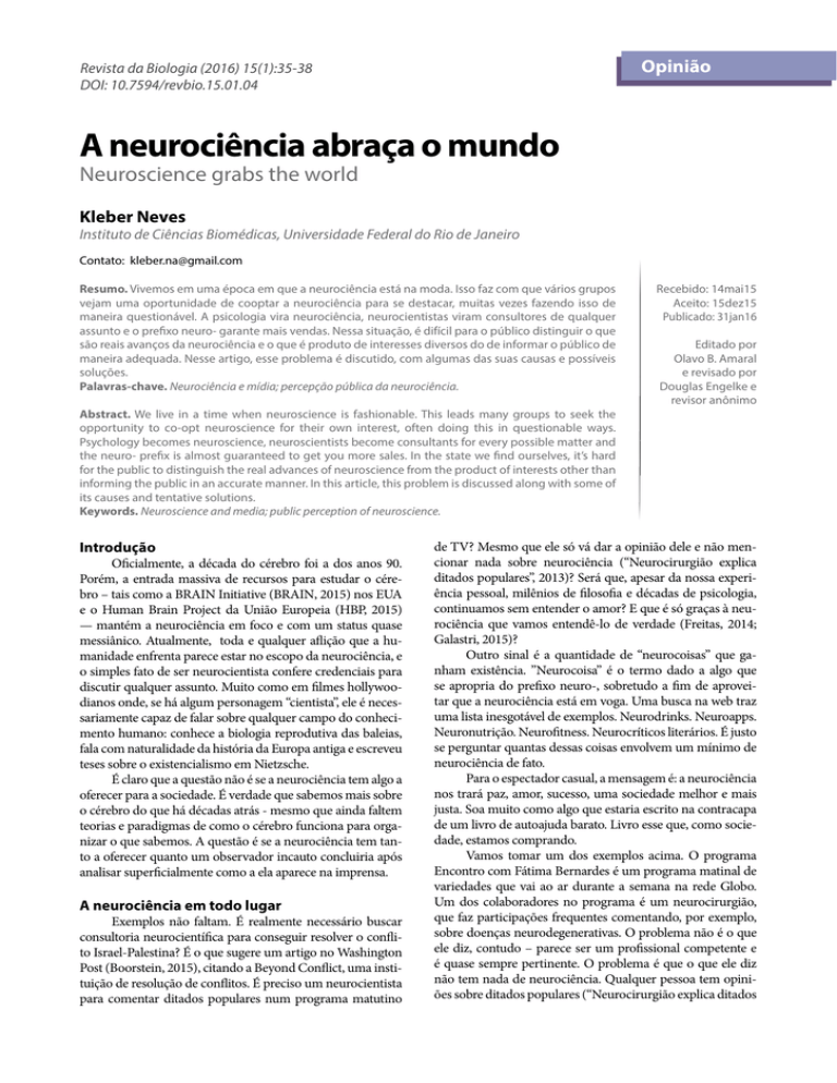 Revista da Biologia (2016) 15(1):35-38 DOI: 10.7594/revbio.15.01.04 Opinião A neurociência abraça o mundo Neuroscience grabs the world Kleber Neves Instituto de Ciências Biomédicas, Universidade Federal do Rio de Janeiro Contato: [email protected] Resumo. Vivemos em uma época em que a neurociência está na moda. Isso faz com que vários grupos vejam uma oportunidade de cooptar a neurociência para se destacar, muitas vezes fazendo isso de maneira questionável. A psicologia vira neurociência, neurocientistas viram consultores de qualquer assunto e o prefixo neuro- garante mais vendas. Nessa situação, é difícil para o público distinguir o que são reais avanços da neurociência e o que é produto de interesses diversos do de informar o público de maneira adequada. Nesse artigo, esse problema é discutido, com algumas das suas causas e possíveis soluções. Palavras-chave. Neurociência e mídia; percepção pública da neurociência. Abstract. We live in a time when neuroscience is fashionable. This leads many groups to seek the opportunity to co-opt neuroscience for their own interest, often doing this in questionable ways. Psychology becomes neuroscience, neuroscientists become consultants for every possible matter and the neuro- prefix is almost guaranteed to get you more sales. In the state we find ourselves, it’s hard for the public to distinguish the real advances of neuroscience from the product of interests other than informing the public in an accurate manner. In this article, this problem is discussed along with some of its causes and tentative solutions. Keywords. Neuroscience and media; public perception of neuroscience. Introdução Oficialmente, a década do cérebro foi a dos anos 90. Porém, a entrada massiva de recursos para estudar o cérebro – tais como a BRAIN Initiative (BRAIN, 2015) nos EUA e o Human Brain Project da União Europeia (HBP, 2015) — mantém a neurociência em foco e com um status quase messiânico. Atualmente, toda e qualquer aflição que a humanidade enfrenta parece estar no escopo da neurociência, e o simples fato de ser neurocientista confere credenciais para discutir qualquer assunto. Muito como em filmes hollywoodianos onde, se há algum personagem “cientista”, ele é necessariamente capaz de falar sobre qualquer campo do conhecimento humano: conhece a biologia reprodutiva das baleias, fala com naturalidade da história da Europa antiga e escreveu teses sobre o existencialismo em Nietzsche. É claro que a questão não é se a neurociência tem algo a oferecer para a sociedade. É verdade que sabemos mais sobre o cérebro do que há décadas atrás - mesmo que ainda faltem teorias e paradigmas de como o cérebro funciona para organizar o que sabemos. A questão é se a neurociência tem tanto a oferecer quanto um observador incauto concluiria após analisar superficialmente como a ela aparece na imprensa. A neurociência em todo lugar Exemplos não faltam. É realmente necessário buscar consultoria neurocientífica para conseguir resolver o conflito Israel-Palestina? É o que sugere um artigo no Washington Post (Boorstein, 2015), citando a Beyond Conflict, uma instituição de resolução de conflitos. É preciso um neurocientista para comentar ditados populares num programa matutino Recebido: 14mai15 Aceito: 15dez15 Publicado: 31jan16 Editado por Olavo B. Amaral e revisado por Douglas Engelke e revisor anônimo de TV? Mesmo que ele só vá dar a opinião dele e não mencionar nada sobre neurociência (“Neurocirurgião explica ditados populares”, 2013)? Será que, apesar da nossa experiência pessoal, milênios de filosofia e décadas de psicologia, continuamos sem entender o amor? E que é só graças à neurociência que vamos entendê-lo de verdade (Freitas, 2014; Galastri, 2015)? Outro sinal é a quantidade de “neurocoisas” que ganham existência. ”Neurocoisa” é o termo dado a algo que se apropria do prefixo neuro-, sobretudo a fim de aproveitar que a neurociência está em voga. Uma busca na web traz uma lista inesgotável de exemplos. Neurodrinks. Neuroapps. Neuronutrição. Neurofitness. Neurocríticos literários. É justo se perguntar quantas dessas coisas envolvem um mínimo de neurociência de fato. Para o espectador casual, a mensagem é: a neurociência nos trará paz, amor, sucesso, uma sociedade melhor e mais justa. Soa muito como algo que estaria escrito na contracapa de um livro de autoajuda barato. Livro esse que, como sociedade, estamos comprando. Vamos tomar um dos exemplos acima. O programa Encontro com Fátima Bernardes é um programa matinal de variedades que vai ao ar durante a semana na rede Globo. Um dos colaboradores no programa é um neurocirurgião, que faz participações frequentes comentando, por exemplo, sobre doenças neurodegenerativas. O problema não é o que ele diz, contudo – parece ser um profissional competente e é quase sempre pertinente. O problema é que o que ele diz não tem nada de neurociência. Qualquer pessoa tem opiniões sobre ditados populares (“Neurocirurgião explica ditados Neves: A neurociência abraça o mundo populares”, 2013). Qual o objetivo da produção do programa ao colocar especificamente um neurocirurgião para comentá-los? Ele poderia adicionar o ponto de vista neurocientífico sobre os ditados. Entretanto, não é o que se apresenta, ele apenas faz comentários que não passam pela neurociência em nenhum momento. Acabamos com uma situação em que a opinião de alguém é valorizada simplesmente pelo fato deste alguém ser neurocientista – mesmo quando a opinião não é embasada na neurociência. Isso não é muito diferente de ter uma celebridade dando seu selo de aprovação para um tratamento médico: é um caso clássico da falácia do apelo à autoridade. Outro exemplo é o caso do amor. Não é de hoje que se diz que a neurociência explica o amor, isso é antigo: a ocitocina foi por algum tempo tida como a molécula do a