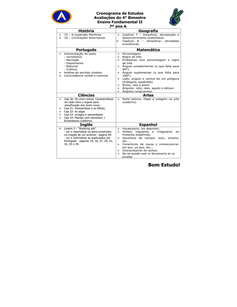 Cronograma de Estudos Avaliações do 4° Bimestre Ensino Fundamental II 7º ano A Geografia História 15 – A expansão Marítima 16 – Civilizações Americanas Português Interpretação de texto - Jornalístico - Narração - Depoimento - Editorial - Crônica Análise do período simples Concordância verbal e nominal Matemática Ciências Cap 20- Os cinco reinos: Características de cada reino e regras para classificação dos seres vivos; Cap 21- Fotossíntese e as folhas; Cap 22- As algas Cap 23- musgos e samambaias Cap 24- Plantas com sementes + Ecossistema (caderno) - Ler e internalizar os itens envolvidos na criação de um anúncio - página 04. - Ler e internalizar as explicações em Português - páginas 14, 16, 27, 29, 31, 33, 34 e 39. Porcentagem Regra de três Problemas com porcentagem e regra de três Ângulo complementar (o que falta para 90°) Ângulo suplementar (o que falta para 180°) Lado, angulo e vertice de um poligono (triângulo, quadrado) Ponto, reta e plano Ângulos: reto, raso, agudo e obtuso Ângulos congruentes. Artes Parte teórica: Papel e colagem na arte (caderno) Vocabulario: los deportes; Verbos regulares e irregulares en Pretérito Indefinido; Adverbios de tiempo: ayer, anoche, etc. ; Conectores de causa y consecuencia: así que, ya que, etc.; Interpretación de textos; No se puede usar el diccionario en la prueba. Inglês Lesson 5 - "Studying ads" Capítulo 7 – Amazônia: devastação e desenvolvimento sustentável. Capítulo 8 – Amazônia: atividades econômicas. Espanhol Bom Estudo! Cronograma de Estudos Avaliações do 4° Bimestre Ensino Fundamental II 7º ano A Geografia História 15 – A expansão Marítima 16 – Civilizações Americanas Português Interpretação de texto - Jornalístico - Narração - Depoimento - Editorial - Crônica Análise do período simples Concordância verbal e nominal Matemática Ciências Cap 20- Os cinco reinos: Características de cada reino e regras para classificação dos seres vivos; Cap 21- Fotossíntese e as folhas; Cap 22- As algas Cap 23- musgos e samambaias Cap 24- Plantas com sementes + Ecossistema (caderno) - Ler e internalizar os itens envolvidos na criação de um anúncio - página 04. - Ler e internalizar as explicações em Português - páginas 14, 16, 27, 29, 31, 33, 34 e 39. Porcentagem Regra de três Problemas com porcentagem e regra de três Ângulo complementar (o que falta para 90°) Ângulo suplementar (o que falta para 180°) Lado, angulo e vertice de um poligono (triângulo, quadrado) Ponto, reta e plano Ângulos: reto, raso, agudo e obtuso Ângulos congruentes. Artes Parte teórica: Papel e colagem na arte (caderno) Vocabulario: los deportes; Verbos regulares e irregulares en Pretérito Indefinido; Adverbios de tiempo: ayer, anoche, etc. ; Conectores de causa y consecuencia: así que, ya que, etc.; Interpretación de textos; No se puede usar el diccionario en la prueba. Inglês Lesson 5 - "Studying ads" Capítulo 7 – Amazônia: devastação e desenvolvimento sustentável. Capítulo 8 – Amazônia: atividades econômicas. Espanhol Bom Estudo!