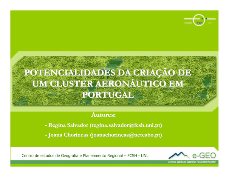 POTENCIALIDADES DA CRIAÇÃO DE UM CLUSTER AERONÁUTICO EM PORTUGAL Autores: - Regina Salvador ([email protected]) - Joana Chorincas ([email protected]) Centro de estudos de Geografia e Planeamento Regional – FCSH - UNL Introdução • Esta comunicação resulta de um projecto europeu interuniversitário (Universidade Autonoma de Madrid, Universidade Bordeaux, Universidade Toulouse, Universidade de Sevilha, Universidade Nova Lisboa), apoiado pelo Interreg III-B Sudoe. • Objectivo: caracterização do sector aeronáutico em Portugal (baseada na inquirição aos principais actores empresariais e institucionais) e reflectir sobre as suas potencialidades de desenvolvimento. Centro de estudos de Geografia e Planeamento Regional – FCSH - UNL Regiões abrangidas pelo estudo Centro de estudos de Geografia e Planeamento Regional – FCSH - UNL O Sector Aeronáutico: Tendências Recentes • De uma aventura de pioneiros sonhadores, a aviação converteu-se num sector industrial estratégico. As duas Grandes Guerras transformaram-na num objectivo prioritário das políticas dos Estados. Carácter de “Bem Público”. • 5 Características do Sector: –– Próximo Próximo da da Defesa; Defesa; –– Forma Forma Jurídica Jurídica das das Empresas-Matriz; Empresas-Matriz; –– Características Características da da Organização Organização Industrial; Industrial; –– Importância Importância da da C&T; C&T; –– Papel Papel dos dos Territórios Territórios ee seus seus agentes agentes na na criação, criação, consolidação consolidação ou ou reestruturação reestruturação da da indústria indústria aeronáutica. aeronáutica. Centro de estudos de Geografia e Planeamento Regional – FCSH - UNL O Sector Aeronáutico: Tendências Recentes • EADS → A primeira empresa verdadeiramente europeia? • A EADS (Airbus) desenha as características básicas do protótipo. Depois, atribui os diferentes conjuntos integrados às unidades produtivas com maior vantagem comparativa - todas as componentes estão ao serviço do produto final. • Entregas na maioria dos modelos e ampliação da gama A330-340, com as versões A340-500 e 600. O A380 completa uma gama em condições de competir com a Boeing em todos os segmentos de mercado. • Inflexão em 2003 - a posição de líder do mercado parece conquistada pela Airbus, pelo menos para os próximos anos. Centro de estudos de Geografia e Planeamento Regional – FCSH - UNL O Sector Aeronáutico: Tendências Recentes • Supremacia da indústria europeia, sem distinção de segmentos de actividades. • Nos próximos 20 anos, a Airbus deverá consolidar a sua posição. • Estima-se que a procura de novos aviões de passageiros, com mais de 100 100 lugares lugares seja de 16.600, o que representa uma média de 830 entregas anuais - triplicação do tráfego de passageiros. Volume de negócios Aeronáutica Civil Mil milhões de € 2003 EUA 36.5 Europa 47.6 Canadá 12.5 Japão 5 Fonte: Relatório Final do Projecto Centro de estudos de Geografia e Planeamento Regional – FCSH - UNL O Sector Aeronáutico: Tendências Recentes •• •• O O desenho desenho do do equipamento equipamento interior interior faz-se faz-se em em Martorell Martorell ee aa adaptação adaptação para para oo uso uso realiza-se realiza-se em em Hamburgo. Hamburgo. Divisão do trabalho na produção do A380 Vía terrestre Vía aérea Vía marítima As As secções secções de de fuselagem fuselagem fabricam-se fabricam-se em em França França ee na na Alemanha. Alemanha. As As asas asas constroem-se constroem-se no no Reino Reino Unido Unido ee oo estabilizador estabilizador horizontal horizontal em em Espanha. Espanha. Broughton Velámenes Saint-Nazaire Tramos de equipos y ensamblaje del fuselaje Hambourg Montage fuselaje trasero. Trozos delantero y cetral Meaulte Punta delantera. Cajas tren principal Nantes Cuerpo central Toulouse Ensamblaje fnal Electrónica de a bordo Mástiles de los motores Puerto Real Partes de trozos posteriors Estabilizadores horizontals Carena ventral Centro de estudos de Geografia e Planeamento Regional – FCSH - UNL Stade Dérive Sector e Território • O estudo comprova a existência de especificidades territoriais em volta do cluster aeronáutico. Assiste-se à sequência esperada de aglomeração, especialização e especificidade territorial. • Governância territorial - Combina sempre elementos de estabilidade e de instabilidade. Todos os protagonistas são “situados”. • Protagonistas-chave - macroprotagonistas económicos (grandes grupos) ou institucionais (Estado, União Europeia, sindicatos profissionais). • Protagonistas industriais - unidades produtivas que se inscrevem numa lógica de produção aeronáutica nos 5 territórios estudados (Toulouse, Bordéus, Madrid, Sevilha e Portugal). Centro de estudos de Geografia e Planeamento Regional – FCSH - UNL Sector e Território • É decisiva a capacidade dos protagonistas locais (empresas e instituições) para produzir recursos específicos locais, garantindo a permanência do poder de atracção territorial. Territórios envolvidos na produção do A380 Centro de estudos de Geografia e Planeamento Regional – FCSH - UNL O Sector Aeronáutico em Portugal • Portugal apresenta um peso dos sectores de alta tecnologia no VAB que ronda os 35% (contra os valores médios de 49% na UE e de 52% na OCDE). PIB e Nível de Desenvolvimento Tecnológico 160 EUA 140 Noruega Dinamarca 120 Canadá Bélgica • É o 2.º país europeu (depois da Finlândia) com um maior aumento da importância relativa das indústrias de alta e média intensidade tecnológica, no período entre meados da década de noventa e os primeiros anos do século XXI. PIB per capita ppc - 2000 (% média UE) Austrália 100 Itália Finlândia 80 Alemanha Japão Holanda França Reino Unido Suécia Nova Zelândia Espanha Portugal Grécia Coreia 60 Hungria 40 México 20 20 40 60 80 % Sectores 