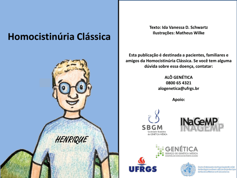 Homocistinúria Clássica Texto: Ida Vanessa D. Schwartz Ilustrações: Matheus Wilke Esta publicação é destinada a pacientes, familiares e amigos da Homocistinúria Clássica. Se você tem alguma dúvida sobre essa doença, contatar: ALÔ GENÉTICA 0800 65 4321 [email protected] Apoio: HENRIQUE Classificação da Informação: Uso Irrestrito Olá amigos, meu nome é Henrique. Eu tenho Homocistinúria Clássica e gosto muito da cor azul. Gostaria de contar para vocês, neste livrinho, a minha história e a história dos meus sonhos. Para mim, o azul significa o céu e o mar, as montanhas, e os meus sonhos. Talvez por isso eu adore observar os pássaros... HENRIQUE 1 Classificação da Informação: Uso Irrestrito 2 Eu nasci em uma família muito legal. Nasci muito bem, com muita saúde, logo tive alta do hospital, fui amamentado e caminhei bem cedo. Quando eu tinha quase dois anos, entretanto, eu tive um problema: de uma hora para outra, uma das veias do meu cérebro entupiu! Vocês acreditam? Meus pais me contaram isto. Por causa disso, eu desmaiei, tive uma convulsão e fui levado para o hospital. Uma veia do meu cérebro entupiu! Meu cérebro 3 Classificação da Informação: Uso Irrestrito 4 Minha família ficou muito nervosa, mas a equipe de saúde nos atendeu muito bem e logo eu fiquei bom. Enquanto eu estava me recuperando, uma médica geneticista veio me atender. E uma médica dos olhos também... Ela disse que eu também tinha um problema chamado “luxação de cristalino”... Eu não entendia nada naquela época, era muito pequenino, mas achei estranho. O nome geneticista também é muito estranho... Meus pais, quando eu fiquei mais velho, explicaram que o médico geneticista cuida das pessoas que têm doenças raras. O cristalino é a lente que fica dentro dos nossos olhos... ela tem de ficar “de pé, retinha” dentro do nosso olho, quando ela não está nessa posição, ela está luxada... É raro crianças terem veias do cérebro entupidas e a lente do olho fora do lugar, por isso ela veio me ver, eu acho. Cristalino 5 Classificação da Informação: Uso Irrestrito 6 Fizeram então exames de sangue em mim... Logo descobriram que eu tinha uma doença rara, genética, chamada Homocistinúria Clássica. As pessoas que tem Homocistinúria Clássica produzem pouca quantidade no seu corpo de uma substância chamada Cistationina beta-sintase (o mais fácil é chama-la CBS). Quando a CBS não funciona direito, a homocisteína fica alta no sangue. A homocisteína, em quantidade alta, funciona como um veneno para o nosso corpo: ela faz com que veias do coração, do cérebro ou das pernas, por exemplo, entupam; faz com que a lente dos olhos não fique no lugar certo (por isso eu uso óculos e tive de fazer uma cirurgia nos olhos); faz com que eu tenha tendência à osteoporose (“ossos fracos”)... HENRIQUE olhos Veias homocisteína Ossos 7 Classificação da Informação: Uso Irrestrito 8 Mas a Homocistinúria Clássica é tratável...Tem várias vitaminas (que eu tomo) que fazem a homocisteína ficar baixa... Algumas pessoas com Homocistinúria Clássica conseguem baixar a homocisteína somente com o uso de vitaminas (não é o meu caso). Eu preciso, também, fazer dieta, tomar um leite especial e um remédio especial também... Eu estou acostumado com a dieta, mas tenho de me cuidar muito para nunca fugir dela... O meu tratamento é por toda a vida... Desde que eu comecei a me tratar, não tive outros problemas e pretendo continuar não tendo nada... Sei que isto depende de eu seguir o meu tratamento, de consultar os médicos que cuidam de mim, de consultar a nutricionista, de fazer exames para ver como anda a quantidade de homocisteína no meu sangue... E de ter sonhos... Como a homocisteína é produzida a partir de aminoácidos, que são substâncias que fazem parte de proteínas (proteínas são encontradas na carne, por exemplo), a minha dieta é semelhante à vegetariana... Muito saudável!!! 9 Classificação da Informação: Uso Irrestrito 10 Quais são meu sonhos? Bem, eu estou estudando para entrar na faculdade. Mas o meu maior sonho mesmo é que as pessoas saibam mais e pesquisem mais sobre a Homocistinúria Clássica... Quem sabe um dia não haverá cura para o meu problema? Às vezes fico pensando... será que a Homocistinúria Clássica é rara mesmo, ou será que tem um montão de pessoas como eu, no mundo? Só que, diferente de mim, elas simplesmente não sabem que têm Homocistinúria...Isto é perigoso: se a gente não sabe que tem Homocistinúria, a gente não recebe o tratamento correto... HENRIQUE Classificação da Informação: Uso Irrestrito 11 12 Sinais sugestivos de Homocistinúria Clássica: Níveis muito altos de homocisteína no sangue. Deslocamento da lente do olho. A lente do olho chamase cristalino. Você quer fazer parte da nossa família e ajudar a fazer com que meus sonhos se tornem realidade? Caso positivo, lembre que alguns problemas sugerem fortemente que uma pessoa, seja ela criança, adolescente ou adulto, tenha Homocistinúria Clássica (veja página ao lado). Tais pessoas devem ser avaliadas por profissional especializado, a fim de que tenham o seu diagnóstico confirmado o mais rapidamente possível e recebam o tratamento adequado. 13 Entupimento de veias, em qualquer lugar do corpo, especialmente em crianças e adolescentes. O nome médico para entupimento de veias é “trombose”. Teste do pezinho alterado, mostrando aumento de metionina no sangue Presença de pessoas na família com Homocistinúria Clássica, especialmente irmãos. Um casal que tem um filho (menino ou menina) com Homocistinúria tem 25% de chance de ter outro filho (menino ou menina) com o mesmo problema. Por isso, é muito importante a realização de aconselhamento genético! Classificação da Informação: Uso Irrestrito 14