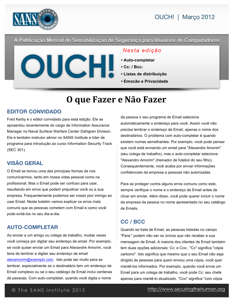 1 2 OUCH! | Março 2012 Nesta edição • Auto-completar • Cc: / Bcc: • Listas de distribuição • Emocão e Privacidade O que Fazer e Não Fazer EDITOR CONVIDADO Fred Kerby é o editor convidado para esta edição. Ele se aposentou recentemente do cargo de Information Assurance Manager no Naval Surface Warfare Center Dahlgren Division. Ele é também instrutor sênior no SANS Institute e líder de programa para introdução ao curso Information Security Track (SEC 301). da pessoa o seu programa de Email seleciona automaticamente o endereço para você. Assim você não precisa lembrar o endereço de Email, apenas o nome dos destinatários. O problema com auto-completar é quando existem nomes semelhantes. Por exemplo, você pode pensar que você está enviando um email para "Alexandre Amorim" (seu colega de trabalho), mas o auto-completar seleciona VISÃO GERAL "Alexandro Amorim" (treinador de futebol do seu filho). O Email se tornou uma das principais formas de nos confidenciais da empresa a pessoas não autorizadas. comunicarmos, tanto em nossa vidas pessoal como na profissional. Mas o Email pode ser confuso para usar, Consequentemente, você acaba por enviar informações Para se proteger contra alguns erros comuns como este, resultando em erros que podem prejudicar você ou a sua sempre verifique o nome e o endereço de Email antes de empresa. Frequentemente podemos ser nosso pior inimigo ao clicar em enviar. Além disso, você pode querer incluir o nome usar Email. Neste boletim vamos explicar os erros mais da empresa da pessoa no nome apresentado no seu catálogo comuns que as pessoas cometem com Email e como você de Emails. pode evitá-los no seu dia-a-dia. AUTO-COMPLETAR CC / BCC Quando se trata de Email, as pessoas listadas no campo Ao enviar a um amigo ou colega de trabalho, muitas vezes "Para:" podem não ser os únicos que vão receber a sua você começa por digitar seu endereço de email. Por exemplo, mensagem de Email. A maioria dos clientes de Email também se você quiser enviar um Email para Alexandre Amorim, você tem duas opções adicionais: Cc: e Cco:. "Cc" significa "cópia teria de lembrar e digitar seu endereço de email carbono". Isto significa que mesmo que o seu Email não seja [email protected]. Isto pode ser muito para se dirigido às pessoas para quem enviou uma cópia, você quer lembrar, especialmente se o destinatário tem um endereço de mantê-los informados. Por exemplo, quando você envia um Email complexo ou se o seu catálogo de Email inclui centenas Email para um colega de trabalho, você pode Cc: seu chefe de pessoas. Com auto-completar, quando você digita o nome apenas para mantê-lo atualizado. "Cco" significa "com cópia © The SANS Institute 2012 http://www.securingthehuman.org 4 3 OUCH! | Março 2012 O que Fazer e Não Fazer oculta". Isto é semelhante ao Cc, mas os destinatários do "Para" e "Cc" não vão ver as pessoas que você incluiu em Bcc. Cc / Bcc podem te trazer problemas por várias razões. Quando alguém lhe envia um Email com pessoas copiadas, você tem que decidir se quer responder apenas ao remetente ou a todos que foram incluídos no Cc. Se sua resposta tem natureza sensível, você pode querer responder apenas ao remetente. Se esse for o caso, certifique-se de não usar a opção "Responder a Todos". "Responder a Todos" inclui todos, o que pode colocar você em problemas dependendo do Email. Com Cco você pode querer copiar alguém em particular, como seu chefe. No entanto, se o seu chefe responde com "Responder a Todos", todos os destinatários saberão que ele foi copiado com “Bcc” na A melhor maneira de se proteger ao usar o Email é parar um pouco, pensar e verificar antes de clicar em enviar. mensagem original – e acaba com o seu segredo. LISTAS DE DISTRIBUIÇÃO As listas de distribuição são uma coleção de endereços de Email representado por um único endereço de email, às vezes chamado de lista de Email ou nome de um grupo. Por exemplo, você pode ter uma lista de distribuição com o endereço de email [email protected]. Quando você envia uma mensagem de Email para esse endereço, a mensagem é enviada para todos no grupo, talvez centenas ou mesmo EMOÇÃO milhares de pessoas. Tenha muito cuidado com o que você Nunca envie um Email quando estiver emocionalmente enviar para uma lista de distribuição, porque muitas pessoas envolvido. Se você estiver envolvido emocionalmente, o Email podem receber essa mensagem. Você não vai querer enviar pode lhe causar danos no futuro, talvez até lhe custar uma acidentalmente um Email para milhares de pessoas. O que amizade ou um emprego. Ao invés disso, espere um pouco e também pode ser perigoso é quando o auto-completar organize seus pensamentos. Levante-se e tome distância do seleciona uma lista de distribuição. Sua intenção pode ser a computador. Se você tem que extravasar sua frustração, outra de enviar Email apenas uma única pessoa, como seu colega opção é: abra seu programa de Email e verifique se os [email protected], mas o auto-completar pode enviá-lo campos Para/ Cc / Bcc estão vazios. Agora vá em frente e para a lista de distribuição que você tenha subscrito sobre carros. © The SANS Institute 2012 escreva exatamente o que você sente vontade de dizer. Em v http://www.securingthehuman.org 6 5 OUCH! | Março 2012 O que Fazer e Não Fazer seguida levante-se, afaste-se do computador e tome, talvez, Apple iMail (em Inglês): uma xícara de café. Quando voltar apague o Email e comece http://preview.tinyurl.com/6dc6ac4 tudo de novo. É como um sábio disse uma vez: "Rascunhe hoje, envie amanhã." Prevenindo desastres ao auto-completar no Outlook: http (em Inglês): //preview.tinyurl.com/75lvgln PRIVACIDADE CERT.br – Glossário de segurança: Finalmente, lembre-se que o email tem poucas proteções de http://cartilha.cert.br/glossario/ privacidade. Assim como um cartão postal enviado através do correio tradicional, seus Em