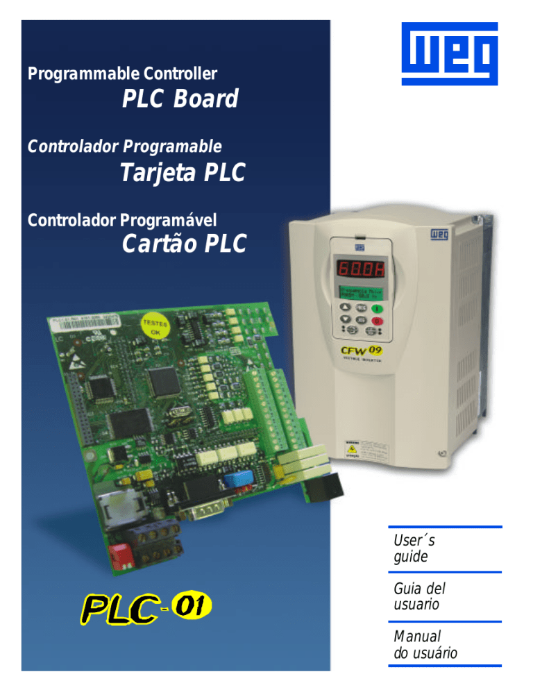 Programmable Controller PLC Board Controlador Programable Tarjeta PLC Controlador Programável Cartão PLC User´s guide Guia del usuario Manual do usuário MANUAL DO CARTÃO PLC1.01 PROGRAMÁVEL EM LINGUAGEM LADDER PELO SOFTWARE WLP 04/2004 Software da PLC1: V1.4X Software WLP: V3.4X 0899.4793 P/2 Sumário das revisões A informação abaixo descreve as revisões ocorridas neste manual. Revisão Descrição da revisão Capítulo 1 Primeira revisão - Índice 1 2 Referência Rápida dos Parâmetros .............................................. 04 Mensagens de Erro ...................................................................... 06 CAPÍTULO 1 Introdução CAPÍTULO 2 Instruções de Segurança CAPÍTULO 3 Informações Gerais CAPÍTULO 4 Características Gerais da PLC1 CAPÍTULO 5 Descrição dos Conectores CAPÍTULO 6 Configuração do conversor CFW-09 com a placa PLC CAPÍTULO 7 Instalação da placa no conversor CAPÍTULO 8 Descrição Detalhada dos Parâmetros CAPÍTULO 9 WLP CAPÍTULO 10 Blocos do WLP CAPÍTULO 11 Protocolo Modbus na PLC1 PLC - REFERÊNCIA RÁPIDA DOS PARÂMETROS REFERÊNCIA RÁPIDA DOS PARÂMETROS, MENSAGENS DE ERRO Software: V1.4X Aplicação: Modelo: N.o de série: Responsável: Data: / / . A faixa de parâmetros que vai de 750 a 899, totalizando 150. Os 50 primeiros, são pré-definidos pelo sistema ou reservados. Os 100 restantes são de uso geral, ou seja, podem ser programados pelo usuário. Segue abaixo a descrição dos parâmetros do sistema que estão definidos. 1. Parâmetros Parâmetro P750 Descrição P764 (*) Versão do firmware da PLC1 Ciclo de scan em unidades de 100µs Zera marcadores retentivos Carrega valores de fábrica, se =1234 Referência de posição (rotações) Referência de posição (fração de volta) Sinal da posição 0 = negativo 1 = positivo Posição real (rotações) Posição real (fração de volta) Kp: ganho proporcional de posição Ki: ganho integral de posição Erro de lag máximo Desabilita programa do usuário se =1 Endereço da PLC na rede P765 (*) Baud rate da RS232 P766 Estado das entradas digitais Velocidade síncrona do motor em RPM Número de pulsos do encoder Posição do pulso de nulo do encoder P751 P752 (*) P753 (*) P754 P755 P756 P757 P758 P760 P761 P762 P763 P767 (*) P768 (*) P769 (*) Ajuste de Fábrica Faixa de Valores Unidade Página Leitura Leitura x100µs 0...1 0 0..65535 0 Leitura rot Leitura graus / 10 Leitura Leitura Leitura rot graus / 10 0...200 50 0...200 0...65535 0 0 0...1 0 1...247 1 = 1200bps 2 = 2400bps 3 = 4800bps 4 = 9600bps 5 = 19200bps Leitura 1 4 bits / segundo 0...10000 1800 RPM 0...65535 1024 ppr 0...3599 0 graus / 10 graus / 10 (*) IMPORTANTE: o sistema precisa ser reinicializado quando um ou mais desses parâmetros for alterado, para que atue conforme o programado. 4 PLC - REFERÊNCIA RÁPIDA DOS PARÂMETROS Parâmetro Descrição Ajuste de Fábrica Faixa de Valores Unidade Página 0=1Mbit/s 1=Reservado 2=500 Kbit/s P772 Baudrate da CAN 3=250 Kbit/s 0 bits/segundo 4=125 Kbit/s 5=100 Kbit/s 6=50 Kbit/s 7=20 Kbit/s 8=10 Kbit/s P773 Recuperar bus off P775 Status da CAN Contador de telegramas recebidos Contador de telegramas P776 P777 0=Manual 1=Automático Leitura Leitura Leitura transmitidos P778 Contador de erros detectados Leitura 5 PLC - REFERÊNCIA RÁPIDA DOS PARÂMETROS 2. Mensagens de Erro Indicação E50 E51 E52 E53 E54 E55 E56 E57 E58 E61 Significado Erro de lag Falha ao gravar programa Dois ou mais movimentos habilitados simultaneamente Dados de movimento inválidos Observação Erro fatal, desabilita o inversor. Ver parâmetro P762. Reinicializar o sistema e tentar novamente. Verificar a lógica do programa do usuário. Provavelmente algum valor zerado de velocidade, aceleração, etc. Tentativa de executar um movimento Inversor desabilitado com o inversor desabilitado Programa incompatível Verificar programa e reenviá-lo. Esse ou fora dos limites erro também ocorre quando não há da memória programa na PLC (primeira vez que a mesma é energizada). CRC errado Transmitir novamente. Eixo não referenciado Antes de um movimento absoluto, para movimentação uma busca de zero de máquina deve absoluta ser executada. Erro fatal: após estabelecida Falta de referência comunicação inicial, entre mestre e do mestre escravo, por algum motivo a mesma foi interrompida. Bus off detectado no barramento CAN, devido a um grande número de Bus off erros de transmissão, seja por problemas no barramento ou instalação inadequada. Obs: nos erros fatais, E50 e E58, o inversor é desabilitado e precisa ser reinicializado. 6 CAPÍTULO 1 INTRODUÇÃO O cartão PLC1 agrega ao inversor CFW-09, funções importantes de CLP (Controlador Lógico Programável), possibilitando a execução de complexos programas de intertravamento, que utilizam as entradas e saídas digitais do cartão, bem como as entradas e saídas digitais e analógicas do próprio inversor, que podem ser acessadas pelo programa do usuário. Dentre as várias funções disponíveis, podemos destacar desde simples contatos e bobinas até funções utilizando ponto flutuante, como soma, subtração, multiplicação, divisão, funções trigonométricas, raiz quadrada, etc. Outras funções importantes são blocos PID, filtros passa-alta e passa-baixa, saturação, comparação, todos em ponto flutuante. Além das funções citadas acima, a PLC1 oferece blocos para controle de posição e velocidade do motor, que são posicionamentos com perfil trapezoidal, posicionamentos com perfil S, geração de referência de velocidade com rampa de aceleração trapezoidal, etc. (obs.: para posicionamento, é imperativo o uso de um encoder acoplado ao motor). Todas as funções podem interagir com o usuário, através dos 100 parâmetros programáveis, que podem ser acessados diretamente pela IHM do inversor e, através do WLP, podem ser customizados com textos e unidades do usuário. ATENÇÃO! A versão de software do inversor CFW-