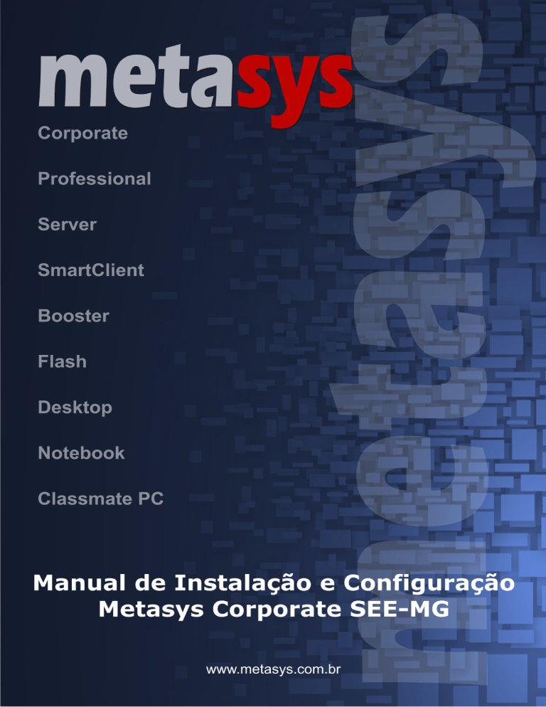 As informações contidas neste documento pertencem à International Syst S/A. Qualquer questão referente à utilização deste documento ou informações contidas no mesmo deverão ser dirigidas à International Syst S/A, responsável por sua elaboração. International Syst S/A Raja Gabáglia, 4055 - A - 215 - Santa Lúcia 30.360-370 - Belo Horizonte - MG - Brasil Telefone: +55 31 3503-9040 - Fax: +55 31 3503-9009 Contatos [email protected] Portal Metasys http://www.metasys.com.br Copyright© 2008 International Syst S/A. Todos os direitos reservados. Metasys Corporate SEE-MG Versão 2.2 Manual de Instalação e Configuração Sumário 1 Prefácio.............................................................................................................................................................7 1.1 A Quem se Destina...............................................................................................................................................................7 1.2 Documentos Relacionados...................................................................................................................................................7 1.3 Comentários..........................................................................................................................................................................7 1.4 Nomenclatura utilizada neste documento.............................................................................................................................7 2 Instalação do Metasys Corporate SEEMG......................................................................................................8 2.1 Considerações importantes sobre a instalação....................................................................................................................8 2.2 Requisitos Iniciais para a Instalação.....................................................................................................................................8 2.3 Executando o Instalador.......................................................................................................................................................9 2.4 Navegação nas telas de instalação e configuração do Metasys Corporate SEEMG..........................................................9 2.5 Contrato de Licença............................................................................................................................................................10 2.6 Instalação dos Pacotes.......................................................................................................................................................10 2.7 Particionamento..................................................................................................................................................................11 2.7.1 Montando Sistemas de Arquivos em RAID em sda para a partição /boot.................................................................12 2.7.2 Criando a partição para memória swap em sda.........................................................................................................13 2.7.3 Montando Sistemas de Arquivos em RAID em sda para a partição /........................................................................14 2.7.4 Montando Sistemas de Arquivos em RAID em sda para a partição /home...............................................................14 2.7.5 Montando Sistemas de Arquivos em RAID em sdb para a partição /boot.................................................................15 2.7.6 Criando a partição para memória swap em sdb.........................................................................................................16 2.7.7 Montando Sistemas de Arquivos em RAID em sdb para a partição /........................................................................17 2.7.8 Montando Sistemas de Arquivos em RAID em sdb para a partição /home...............................................................17 2.8 Criando Dispositivos RAID..................................................................................................................................................19 2.8.1 Criando Dispositivo RAID Referente à partição /.......................................................................................................19 2.8.2 Criando Dispositivo RAID Referente à partição /boot................................................................................................19 2.8.3 Criando Dispositivo RAID Referente à partição /home..............................................................................................20 2.9 Finalizando a instalação.....................................................................................................................................................22 2.10 Preparativos Iniciais de Configuração do Servidor...........................................................................................................23 2.11 Instalando os CDs adicionais............................................................................................................................................34 3 Console do Servidor.......................................................................................................................................37 3.1.1 Item 1 - Verificar status deste servidor.......................................................................................................................37 Metasys Corporate SEEMG – Versão 2.2 3 3.1.2 Item 2 - Configurar este servidor................................................................................................................................37 3.1.3 Item 3 – Cadastrar chave de ativação........................................................................................................................38 3.1.4 Item 4 – Rever configuração...