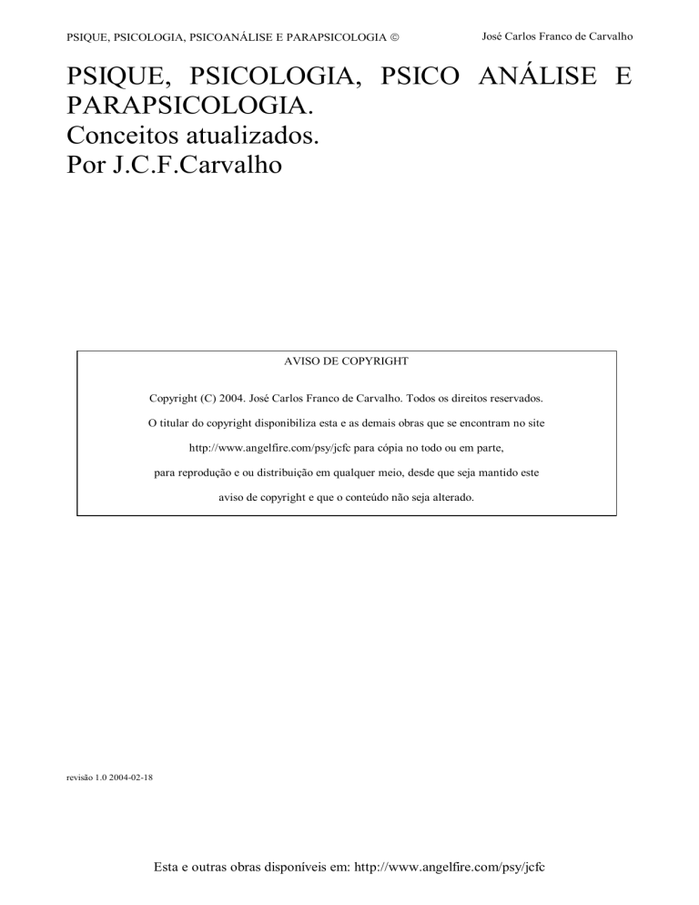 PSIQUE, PSICOLOGIA, PSICOANÁLISE E PARAPSICOLOGIA José Carlos Franco de Carvalho PSIQUE, PSICOLOGIA, PSICO ANÁLISE E PARAPSICOLOGIA. Conceitos atualizados. Por J.C.F.Carvalho AVISO DE COPYRIGHT Copyright (C) 2004. José Carlos Franco de Carvalho. Todos os direitos reservados. O titular do copyright disponibiliza esta e as demais obras que se encontram no site http://www.angelfire.com/psy/jcfc para cópia no todo ou em parte, para reprodução e ou distribuição em qualquer meio, desde que seja mantido este aviso de copyright e que o conteúdo não seja alterado. revisão 1.0 2004-02-18 Esta e outras obras disponíveis em: http://www.angelfire.com/psy/jcfc PSIQUE, PSICOLOGIA, PSICOANÁLISE E PARAPSICOLOGIA José Carlos Franco de Carvalho I- DUPLA NATUREZA – CORPO E ALMA A ALMA EXISTE? A PROCURA DO COMANDO CONSCIENTE. Os cientistas adquiriram conhecimentos de Biologia, Fisiologia, Anatomia, Neuranatomia, Neurofisiologia, Todavia ainda procuram a peça neurológica que desenvolve as atividades do comando consciente do psiquismo. É fato notável. Concluem que temos duas naturezas psíquicas fundamentais. Uma é a consciente e a outra é a inconsciente. Os fisiólogos já encontraram as peças neurológicas correspondentes às atividades inconscientes. Contudo ainda não encontraram a peça a qual desenvolve as atividades conscientes. Os médicos materialistas estão cansados das pesquisas que fazem em busca de uma peça neurológica que desenvolva as atividades do Eu. Ou melhor, da peça neurológica que comanda as atividades conscientes A realidade é que essa peça, em ocorrência material, não existe. A CONSCIÊNCIA. Nós, por meio de uma atividade do psiquismo, assimilamos os conhecimentos dos fatos vividos. Conscientizamos os fatos. Nesse processo o “Eu” de cada um conscientiza os fatos que estão a acontecer em sua vida. Todavia esse Eu exerce atividades importantíssimas. É o dono da natureza individual do ser; comanda e dirige o ser humano. Ele tem ligações neurológicas e produz, segundo seus desejos e vontades, os estímulos que acionam todas as atividades do corpo. Também é informado por estímulos neurológicos de todos os fatos que seu corpo vive. Assim sabemos que o Eu, é a atividade que dirige o comando consciente; o diretor do psiquismo; a peça neurológica que comanda o corpo que é uma máquina material biológica. ONDE ESTÁ ESSE COMANDO? O problema dos estudiosos é que no cérebro não existe uma peça neurológica material que tenha composição, formação, que a habilite às realizações das atividades do Eu. Uma peça para realizar essas atividades deveria ter muitas ligações e ser uma espécie de central eletrônica de comando. Isso no cérebro, no que diz respeito às origens dos estímulos do Eu, não existe. Vamos narrar o que encontram. OS VENTRÍCULOS. As ocorrências neurológicas que encontram às atividades psíquicas conscientes são formadas de “tecidos”. Esses envolvem espaços vazios que são chamados de ventrículos. São dois ventrículos laterais, um segundo ventrículo, e um terceiro ventrículo. A característica é que nas partes externas desses tecidos nascem os pulsos, estímulos, neurológicos que originam as atividades dos “Eus”. Vou apresentar ligeiro esboço dos ventrículos. Note-se. Na parte interna dos espaços vazios, as células dos tecidos, entre si, são desligadas. A situação é que nas paredes que envolvem esses espaços vazios estão as células que produzem os pulsos nervosos que acionam as atividades dirigidas pelo Eu; dirigidas pela consciência. Nos desenhos temos: Do lado esquerdo um esboço para dar idéia dos ventrículos do cérebro. Do lado direito a idéia de uma sacola. Na sacola temos o papel que envolve e no meio um espaço vazio. Os ventrículos e como funcionam. Pois bem os ventrículos são assim. Só que no lugar do papel temos um tecido para o qual os estudiosos deram o nome de tecido reticular. Esse tecido reticular é composto de células nervosas. Dentro dos espaços dos ventrículos temos um líquido para o qual deram o nome de líquor. Esses tecidos envolvem os vazios dos cérebros. Esta e outras obras disponíveis em: http://www.angelfire.com/psy/jcfc PSIQUE, PSICOLOGIA, PSICOANÁLISE E PARAPSICOLOGIA José Carlos Franco de Carvalho Os estímulos que acionam as atividades do corpo. A situação é que nessas células, das paredes desses vazios, são produzidos os estímulos que acionam as atividades voluntárias. As atividades voluntárias são as que acionam os movimentos, ações, e etc, que desenvolvemos nos instantes que o Eu deseja e quer. O córtex também aciona as atividades. Só que nessas situações o faz porque foi automatizado para esses procedimentos. Exemplo de atividade automatizada. O andar, depois que aprendemos a andar, o fazemos de forma automatizada. Assim balançamos os braços e movemos as pernas. São atividades automatizadas. O Eu não presta mais atenção nelas. Por meio das automatizações o córtex aciona quase todas as nossas atividades. Exemplo de atividade do “Eu”. Ex: Eu decido chamar uma pessoa para olhar uma cena. Quem aciona o falar chamando a pessoa é o Eu. CARACTERÍSTICAS DOS VAZIOS DO CÉREBRO. No cérebro temos quatro vazios Ventrículos laterais. Dois deles se localizam de entremeio a córtex. São ligados em suas extremidades inferiores e são denominados de ventrículos laterais. II Ventrículo. Ligado a esses está um outro vazio que é denominado de II Ventrículo. Depois, na parte inferior desse II Ventrículo, temos a ligação do III Ventrículo. A Medula Espinal. Em seguida, e ligada ao terceiro ventrículo, está a medula espinal. O problema dos estudiosos é que não existem ocorrências neurológicas nessas partes do cérebro que tenham condições de realizar as atividades conscientes. Também não existe explicação material sobre os meios pelos quais essas capas desses vazios podem desempenhar as atividades psíquic