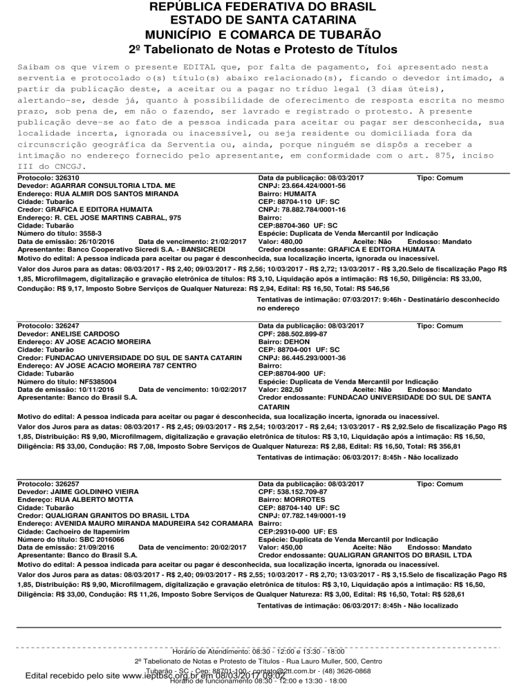 REPÚBLICA FEDERATIVA DO BRASIL ESTADO DE SANTA CATARINA MUNICÍPIO E COMARCA DE TUBARÃO 2º Tabelionato de Notas e Protesto de Títulos Saibam os que virem o presente EDITAL que, por falta de pagamento, foi apresentado nesta serventia e protocolado o(s) título(s) abaixo relacionado(s), ficando o devedor intimado, a partir da publicação deste, a aceitar ou a pagar no tríduo legal (3 dias úteis), alertando-se, desde já, quanto à possibilidade de oferecimento de resposta escrita no mesmo prazo, sob pena de, em não o fazendo, ser lavrado e registrado o protesto. A presente publicação deve-se ao fato de a pessoa indicada para aceitar ou pagar ser desconhecida, sua localidade incerta, ignorada ou inacessível, ou seja residente ou domiciliada fora da circunscrição geográfica da Serventia ou, ainda, porque ninguém se dispôs a receber a intimação no endereço fornecido pelo apresentante, em conformidade com o art. 875, inciso III do CNCGJ. Protocolo: 326310 Data da publicação: 08/03/2017 Tipo: Comum Devedor: AGARRAR CONSULTORIA LTDA. ME CNPJ: 23.664.424/0001-56 Endereço: RUA ALMIR DOS SANTOS MIRANDA Bairro: HUMAITA Cidade: Tubarão CEP: 88704-110 UF: SC Credor: GRAFICA E EDITORA HUMAITA CNPJ: 78.882.784/0001-16 Endereço: R. CEL JOSE MARTINS CABRAL, 975 Bairro: Cidade: Tubarão CEP:88704-360 UF: SC Número do título: 3558-3 Espécie: Duplicata de Venda Mercantil por Indicação Data de emissão: 26/10/2016 Data de vencimento: 21/02/2017 Valor: 480,00 Aceite: Não Endosso: Mandato Apresentante: Banco Cooperativo Sicredi S.A. - BANSICREDI Credor endossante: GRAFICA E EDITORA HUMAITA Motivo do edital: A pessoa indicada para aceitar ou pagar é desconhecida, sua localização incerta, ignorada ou inacessível. Valor dos Juros para as datas: 08/03/2017 - R$ 2,40; 09/03/2017 - R$ 2,56; 10/03/2017 - R$ 2,72; 13/03/2017 - R$ 3,20.Selo de fiscalização Pago R$ 1,85, Microfilmagem, digitalização e gravação eletrônica de títulos: R$ 3,10, Liquidação após a intimação: R$ 16,50, Diligência: R$ 33,00, Condução: R$ 9,17, Imposto Sobre Serviços de Qualquer Natureza: R$ 2,94, Edital: R$ 16,50, Total: R$ 546,56 Tentativas de intimação: 07/03/2017: 9:46h - Destinatário desconhecido no endereço Protocolo: 326247 Devedor: ANELISE CARDOSO Endereço: AV JOSE ACACIO MOREIRA Cidade: Tubarão Credor: FUNDACAO UNIVERSIDADE DO SUL DE SANTA CATARIN Endereço: AV JOSE ACACIO MOREIRA 787 CENTRO Cidade: Tubarão Número do título: NF5385004 Data de emissão: 10/11/2016 Data de vencimento: 10/02/2017 Apresentante: Banco do Brasil S.A. Data da publicação: 08/03/2017 Tipo: Comum CPF: 288.502.899-87 Bairro: DEHON CEP: 88704-001 UF: SC CNPJ: 86.445.293/0001-36 Bairro: CEP:88704-900 UF: Espécie: Duplicata de Venda Mercantil por Indicação Valor: 282,50 Aceite: Não Endosso: Mandato Credor endossante: FUNDACAO UNIVERSIDADE DO SUL DE SANTA CATARIN Motivo do edital: A pessoa indicada para aceitar ou pagar é desconhecida, sua localização incerta, ignorada ou inacessível. Valor dos Juros para as datas: 08/03/2017 - R$ 2,45; 09/03/2017 - R$ 2,54; 10/03/2017 - R$ 2,64; 13/03/2017 - R$ 2,92.Selo de fiscalização Pago R$ 1,85, Distribuição: R$ 9,90, Microfilmagem, digitalização e gravação eletrônica de títulos: R$ 3,10, Liquidação após a intimação: R$ 16,50, Diligência: R$ 33,00, Condução: R$ 7,08, Imposto Sobre Serviços de Qualquer Natureza: R$ 2,88, Edital: R$ 16,50, Total: R$ 356,81 Tentativas de intimação: 06/03/2017: 8:45h - Não localizado Tipo: Comum Protocolo: 326257 Data da publicação: 08/03/2017 Devedor: JAIME GOLDINHO VIEIRA CPF: 538.152.709-87 Endereço: RUA ALBERTO MOTTA Bairro: MORROTES Cidade: Tubarão CEP: 88704-140 UF: SC Credor: QUALIGRAN GRANITOS DO BRASIL LTDA CNPJ: 07.782.149/0001-19 Endereço: AVENIDA MAURO MIRANDA MADUREIRA 542 CORAMARA Bairro: Cidade: Cachoeiro de Itapemirim CEP:29310-000 UF: ES Número do título: SBC 2016066 Espécie: Duplicata de Venda Mercantil por Indicação Data de emissão: 21/09/2016 Data de vencimento: 20/02/2017 Valor: 450,00 Aceite: Não Endosso: Mandato Apresentante: Banco do Brasil S.A. Credor endossante: QUALIGRAN GRANITOS DO BRASIL LTDA Motivo do edital: A pessoa indicada para aceitar ou pagar é desconhecida, sua localização incerta, ignorada ou inacessível. Valor dos Juros para as datas: 08/03/2017 - R$ 2,40; 09/03/2017 - R$ 2,55; 10/03/2017 - R$ 2,70; 13/03/2017 - R$ 3,15.Selo de fiscalização Pago R$ 1,85, Distribuição: R$ 9,90, Microfilmagem, digitalização e gravação eletrônica de títulos: R$ 3,10, Liquidação após a intimação: R$ 16,50, Diligência: R$ 33,00, Condução: R$ 11,26, Imposto Sobre Serviços de Qualquer Natureza: R$ 3,00, Edital: R$ 16,50, Total: R$ 528,61 Tentativas de intimação: 06/03/2017: 8:45h - Não localizado Edital recebido pelo site Horário de Atendimento: 08:30 - 12:00 e 13:30 - 18:00 2º Tabelionato de Notas e Protesto de Títulos - Rua Lauro Muller, 500, Centro Tubarão - SC - Cep: 88701-100 - [email protected] - (48) 3626-0868 www.ieptbsc.org.br em 08/03/2017 09:02 Horário de funcionamento 08:30 - 12:00 e 13:30 - 18:00 REPÚBLICA FEDERATIVA DO BRASIL ESTADO DE SANTA CATARINA MUNICÍPIO E COMARCA DE TUBARÃO 2º Tabelionato de Notas e Protesto de Títulos Saibam os que virem o presente EDITAL que, por falta de pagamento, foi apresentado nesta serventia e protocolado o(s) título(s) abaixo relacionado(s), ficando o devedor intimado, a partir da publicação deste, a aceitar ou a pagar no tríduo legal (3 dias úteis), alertando-se, desde já, quanto à possibilidade de oferecimento de resposta escrita no mesmo prazo, sob pena de, em não o fazendo, ser lavrado e registrado o protesto. A presente publicação deve-se ao fato de a pessoa indicada para aceitar ou pagar ser desconhecida, sua localidade incerta, ignorada ou inacessível, ou seja residente ou domiciliada fora da circunscrição geográfica da Serventia ou, ainda, porque ninguém se dispôs a receber a i