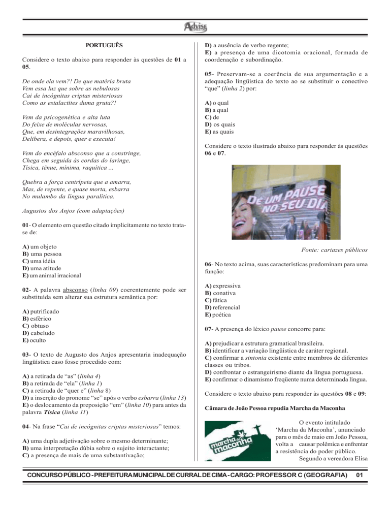 PORTUGUÊS Considere o texto abaixo para responder às questões de 01 a 05. De onde ela vem?! De que matéria bruta Vem essa luz que sobre as nebulosas Cai de incógnitas criptas misteriosas Como as estalactites duma gruta?! Vem da psicogenética e alta luta Do feixe de moléculas nervosas, Que, em desintegrações maravilhosas, Delibera, e depois, quer e executa! Vem do encéfalo absconso que a constringe, Chega em seguida às cordas do laringe, Tísica, tênue, mínima, raquítica ... D) a ausência de verbo regente; E) a presença de uma dicotomia oracional, formada de coordenação e subordinação. 05- Preservam-se a coerência de sua argumentação e a adequação lingüística do texto ao se substituir o conectivo “que” (linha 2) por: A) o qual B) a qual C) de D) os quais E) as quais Considere o texto ilustrado abaixo para responder às questões 06 e 07. Quebra a força centrípeta que a amarra, Mas, de repente, e quase morta, esbarra No mulambo da língua paralítica. Augustos dos Anjos (com adaptações) 01- O elemento em questão citado implicitamente no texto tratase de: A) um objeto B) uma pessoa C) uma idéia D) uma atitude E) um animal irracional 02- A palavra absconso (linha 09) coerentemente pode ser substituída sem alterar sua estrutura semântica por: A) putrificado B) esférico C) obtuso D) cabeludo E) oculto 03- O texto de Augusto dos Anjos apresentaria inadequação lingüística caso fosse procedido com: A) a retirada de “as” (linha 4) B) a retirada de “ela” (linha 1) C) a retirada de “quer e” (linha 8) D) a inserção do pronome “se” após o verbo esbarra (linha 13) E) o deslocamento da preposição “em” (linha 10) para antes da palavra Tísica (linha 11) 04- Na frase “Cai de incógnitas criptas misteriosas” temos: A) uma dupla adjetivação sobre o mesmo determinante; B) uma interpretação dúbia sobre o sujeito interactante; C) a presença de mais de uma substantivação; Fonte: cartazes públicos 06- No texto acima, suas características predominam para uma função: A) expressiva B) conativa C) fática D) referencial E) poética 07- A presença do léxico pause concorre para: A) prejudicar a estrutura gramatical brasileira. B) identificar a variação lingüística de caráter regional. C) confirmar a sintonia existente entre membros de diferentes classes ou tribos. D) confrontar o estrangeirismo diante da língua portuguesa. E) confirmar o dinamismo freqüente numa determinada língua. Considere o texto abaixo para responder às questões 08 e 09: Câmara de João Pessoa repudia Marcha da Maconha O evento intitulado ‘Marcha da Maconha’, anunciado para o mês de maio em João Pessoa, volta a causar polêmica e enfrentar a resistência do poder público. Segundo a vereadora Elisa CONCURSO PÚBLICO - PREFEITURA MUNICIPAL DE CURRAL DE CIMA - CARGO: PROFESSOR C (GEOGRAFIA) 01 Virginia (PPS), a Câmara Municipal de João Pessoa aprovou, mas sem unanimidade, um voto de repúdio à proposta. O projeto é de autoria do vereador Fernando Milanez (PMDB) e subscrito por Elisa. “A maioria dos vereadores votou a favor”, disse. No ano passado, a Marcha da Maconha não chegou a ser realizada devido a uma decisão judicial após a polêmica ser levada tanto à Câmara Municipal quanto na Assembléia Legislativa. Fonte: www.wscom.com.br (07:47 | 06.04.2009) 08- Com base nos estudos de Noam Chomsky (1965) que trata do paralelismo nas construções, assinale a proposta que adéqua um dos fragmentos extraídos do texto em questão: A) ...a Câmara Municipal de João Pessoa aprovou, mas sem unanimidade, votar o repúdio como proposta. B) O projeto é de autoria do vereador Fernando Milanez (PMDB), bem como, de autoria de Elisa. C) ...a Marcha da Maconha não chegou a ser realizada devido a uma decisão judicial após a polêmica ser levada tanto à Câmara Municipal quanto à Assembléia Legislativa. D) O evento intitulado ‘Marcha da Maconha’, anunciado para o mês de maio em João Pessoa, volta a causar polêmica e enfrenta a resistência do poder público. E) ...a Marcha da Maconha não chegou a ser realizada devido a uma decisão judicial e devido a polêmica ser levada tanto à Câmara Municipal quanto na Assembléia Legislativa. 09- No fragmento textual “O evento intitulado ‘Marcha da Maconha’, anunciado para o mês de maio em João Pessoa, volta a causar polêmica e enfrentar a resistência do poder público.”, registra-se: D) “A maioria dos vereadores votou a favor”; disse. E) A Marcha da Maconha não chegou a ser realizada no ano passado devido a uma decisão judicial após a polêmica ser levada tanto à Câmara Municipal quanto na Assembléia Legislativa. FUNDAMENTOS DA EDUCAÇÃO 11 - É sabido que alguns conhecimentos precedem outros e que um bom professor deve conhecer o caminho certo de ensinar, para que o aluno tenha êxito nas atividades escolares. Com isso, torna-se de fundamental importância que o educador, na hora de ensinar um novo conteúdo, leve em conta o (a): A) Plano de aula B) Recurso didático C) Conhecimento prévio do aluno D) O cotidiano do aluno E) Carga horária a ser utilizada 12 – A primeira forma de educação existente no Brasil foi a jesuíta, que foi introduzida assim que esses religiosos chegaram ao território brasileiro. O pilar desse tipo de educação era extremamente: A) Moral B) Intelectual C) Religioso D) Convencional E) Nenhuma das alternativas está correta. 13 – Segundo o Art. 13 da Lei Nº 9394/96 (LDB), todas as alternativas abaixo consistem no dever do professor, EXCETO: A) um subentendido de que é pretensão dos organizadores a apologia às drogas. B) uma informação implícita de que o poder público age de forma passiva para não desagradar a sociedade nem tão pouco os organizadores. C) a presença de um marcador de pressupostos caracterizado pela expressão “causar polêmica”. D) a presença de um veiculador de pressuposição que acusa a existência outrora d