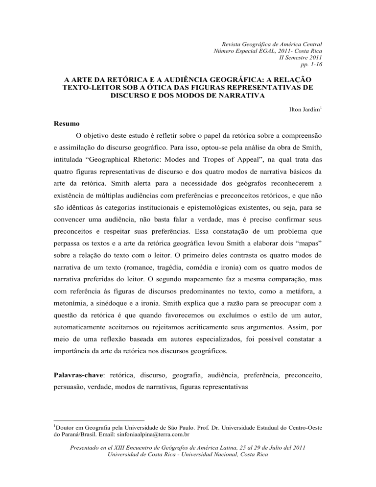 Revista Geográfica de América Central Número Especial EGAL, 2011- Costa Rica II Semestre 2011 pp. 1-16 A ARTE DA RETÓRICA E A AUDIÊNCIA GEOGRÁFICA: A RELAÇÃO TEXTO-LEITOR SOB A ÓTICA DAS FIGURAS REPRESENTATIVAS DE DISCURSO E DOS MODOS DE NARRATIVA Ilton Jardim1 Resumo O objetivo deste estudo é refletir sobre o papel da retórica sobre a compreensão e assimilação do discurso geográfico. Para isso, optou-se pela análise da obra de Smith, intitulada “Geographical Rhetoric: Modes and Tropes of Appeal”, na qual trata das quatro figuras representativas de discurso e dos quatro modos de narrativa básicos da arte da retórica. Smith alerta para a necessidade dos geógrafos reconhecerem a existência de múltiplas audiências com preferências e preconceitos retóricos, e que não são idênticas às categorias institucionais e epistemológicas existentes, ou seja, para se convencer uma audiência, não basta falar a verdade, mas é preciso confirmar seus preconceitos e respeitar suas preferências. Essa constatação de um problema que perpassa os textos e a arte da retórica geográfica levou Smith a elaborar dois “mapas” sobre a relação do texto com o leitor. O primeiro deles contrasta os quatro modos de narrativa de um texto (romance, tragédia, comédia e ironia) com os quatro modos de narrativa preferidas do leitor. O segundo mapeamento faz a mesma comparação, mas com referência às figuras de discursos predominantes no texto, como a metáfora, a metonímia, a sinédoque e a ironia. Smith explica que a razão para se preocupar com a questão da retórica é que quando favorecemos ou excluímos o estilo de um autor, automaticamente aceitamos ou rejeitamos acriticamente seus argumentos. Assim, por meio de uma reflexão baseada em autores especializados, foi possível constatar a importância da arte da retórica nos discursos geográficos. Palavras-chave: retórica, discurso, geografia, audiência, preferência, preconceito, persuasão, verdade, modos de narrativas, figuras representativas 1 Doutor em Geografia pela Universidade de São Paulo. Prof. Dr. Universidade Estadual do Centro-Oeste do Paraná/Brasil. Email: [email protected] Presentado en el XIII Encuentro de Geógrafos de América Latina, 25 al 29 de Julio del 2011 Universidad de Costa Rica - Universidad Nacional, Costa Rica A Arte da retórica e a audiência geográfica: a relação texto-leitor sob a ótica das figuras representativas de discurso e dos modos de narrativa Ilton Jardim Introdução O objetivo deste estudo é refletir sobre o papel da retórica sobre a compreensão e assimilação do discurso geográfico. Para isso, optou-se pela análise da obra de Smith, intitulada “Geographical Rhetoric: Modes and Tropes of Appeal”, na qual trata das quatro figuras representativas de discurso e dos quatro modos de narrativa básicos da arte da retórica. Smith alerta para a necessidade dos geógrafos reconhecerem a existência de múltiplas audiências com preferências e preconceitos retóricos, e que não são idênticas às categorias institucionais e epistemológicas existentes, ou seja, para se convencer uma audiência, não basta falar a verdade, mas é preciso confirmar seus preconceitos e respeitar suas preferências. Essa constatação de um problema que perpassa os textos e a arte da retórica geográfica levou Smith a elaborar dois “mapas” sobre a relação do texto com o leitor. O primeiro deles contrasta os quatro modos de narrativa de um texto (romance, tragédia, comédia e ironia) com os quatro modos de narrativa preferidas do leitor. O segundo mapeamento faz a mesma comparação, mas com referência às figuras de discursos predominantes no texto, como a metáfora, a metonímia, a sinédoque e a ironia. Smith explica que a razão para se preocupar com a questão da retórica é que quando favorecemos ou excluímos o estilo de um autor, automaticamente aceitamos ou rejeitamos acriticamente seus argumentos. Essa análise de Smith pode ser utilizada como uma das ferramentas para se analisar a crítica de textos geográficos. Em tese de doutorado defendida na Universidade de São Paulo, Carvalho Jr. analisou os equívocos da crítica ao chamado “determinismo ambiental” e procurou mostrar sua fragilidade e imprecisão no que concernem dois pontos: impertinência semântica, referente a conceitos, palavras e preconceitos associados; e a questão da crítica ao rótulo, da simplificação, do recorte descontextualizado, e das motivações anticientíficas associadas. Análise e discussão Ao contrário da literatura e de algumas áreas das ciências humanas, como a sociologia, a linguística e a filosofia, há pouca consciência entre os geógrafos de que a escrita feita em seus campos de atuação é muitas vezes mal compreendida porque foi 2 Revista Geográfica de América Central, Número Especial EGAL, Año 2011 ISSN-2115-2563 A Arte da retórica e a audiência geográfica: a relação texto-leitor sob a ótica das figuras representativas de discurso e dos modos de narrativa Ilton Jardim escrita num estilo retórico que não é do conhecimento ou do gosto da platéia. Nesse sentido aponta Smith, para quem There is, however, little agreement on how best to render this service, largely because there has been little thought about the nature of the audience, or about its role in shaping geographical discourse. Geographers must recognize the existence of multiple audiences, and understand that these audiences are not identical to existing Audiences institutional are and constituted by epistemological rhetoric categories. prejudices and preferences. To satisfy an audience, and earn its trust, the writer must confirm their prejudices and respect their preferences.” (SMITH, 1996, p.1) Essa constatação de um problema que perpassa os textos e a arte da retórica geográfica levou Smith a elaborar dois “mapas” sobre a relação do texto com o leitor. O primeiro deles contrasta os