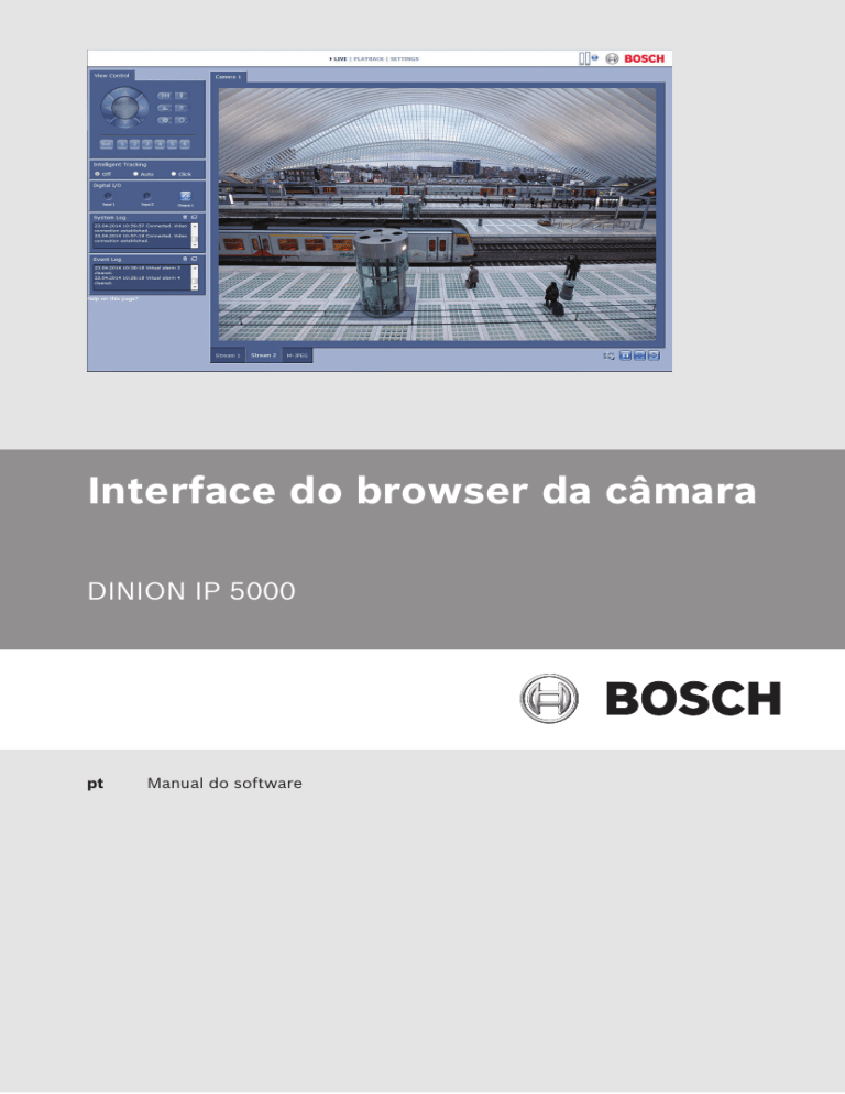 Interface do browser da câmara DINION IP 5000 pt Manual do software Interface do browser da câmara | pt 3 Índice 1 Ligação ao browser 11 1.1 Requisitos de sistema 11 1.2 Estabelecer ligação 11 1.2.1 Protecção por palavra-passe na câmara 12 1.3 Rede protegida 12 2 Vista geral do sistema 13 2.1 Página em directo 13 2.2 Reprodução 13 2.3 Definições 13 3 Funcionamento através do browser 14 3.1 Página em directo 14 3.1.1 Selecção de imagem 14 3.1.2 Área de interesse (ROI) - View Control 15 3.1.3 Digital I/O 16 3.1.4 System Log / Event Log 16 3.1.5 Estado de gravação 16 3.1.6 Guardar imagens paradas 17 3.1.7 Gravar sequências de vídeo 17 3.1.8 Visualização em ecrã inteiro 18 3.1.9 Comunicação áudio 18 3.1.10 Estado de rede, CPU e armazenamento 18 3.1.11 Ícones de estado 20 3.2 Reprodução 22 3.2.1 Seleccionar gravações para reprodução 22 3.2.2 Exportar faixas 23 3.2.3 Pesquisar faixas 23 3.2.4 Controlar a reprodução 23 4 Modo Básico 26 4.1 Acesso ao Dispositivo 26 4.1.1 Nome 26 4.1.2 Palavra-passe 26 4.2 Data/Hora 27 4.3 Rede 28 Bosch Security Systems 2015.04 | v1.592 | AM18-Q0678pt 4 Interface do browser da câmara pt | 4.4 Codificador 28 4.5 Áudio 30 4.6 Gravação 30 4.7 Vista geral do sistema 30 5 Definições gerais 31 5.1 Identificação 31 5.1.1 Designação 31 5.1.2 ID 31 5.1.3 iSCSI Initiator extension 32 5.2 Password 33 5.2.1 Introduzir palavra-passe 33 5.2.2 Confirm password 33 5.3 Date/Time 34 5.3.1 Date format 34 5.3.2 Device date / Device time 34 5.3.3 Device time zone 34 5.3.4 Daylight saving time 34 5.3.5 Time server IP address 35 5.3.6 Time server type 36 5.4 Display Stamping 37 5.4.1 Camera name stamping 37 5.4.2 Time stamping 37 5.4.3 Display milliseconds 37 5.4.4 Alarm mode stamping 37 5.4.5 Alarm message 38 5.4.6 Marca transparente 38 5.4.7 Autenticação de vídeo 38 5.5 GB/T 28181 38 6 Interface Web 39 6.1 Appearance 39 6.1.1 Website language 39 6.1.2 Company logo 39 6.1.3 Device logo 39 6.1.4 Ver metadados VCA 40 6.1.5 Mostrar trajectórias VCA 40 2015.04 | v1.592 | AM18-Q0678pt Bosch Security Systems Interface do browser da câmara | pt 5 6.1.6 Mostrar ícones em sobreposição 40 6.1.7 Seleccionar leitor de vídeo 40 6.1.8 Tamanho, intervalo e qualidade de JPEG 40 6.2 Funções LIVE 41 6.2.1 Transmit audio 41 6.2.2 Lease time [s] 41 6.2.3 Show alarm inputs 41 6.2.4 Ver saídas de alarme 41 6.2.5 Show event log 41 6.2.6 Show system log 42 6.2.7 Allow snapshots 42 6.2.8 Allow local recording 42 6.2.9 Fluxo único de fotogramas I 42 6.2.10 Mostrar o Intelligent Tracking 42 6.2.11 Path for JPEG and video files 42 6.3 Logging 43 6.3.1 Save event log 43 6.3.2 Save system log 43 7 Câmara 44 7.1 Installer Menu 44 7.1.1 Velocidade de fotogramas base 44 7.1.2 LED da câmara 44 7.1.3 Mirror image 44 7.1.4 Flip image 44 7.1.5 Botão Menu 44 7.1.6 Saída analógica 44 7.1.7 Reiniciar dispositivo 44 7.1.8 Predefinições de fábrica 45 7.1.9 Lens Wizard 45 7.2 Definições de imagem – Modo de cena 46 7.2.1 Current mode 46 7.2.2 Mode ID 46 7.2.3 Copy mode to 46 7.2.4 Restore Mode Defaults 46 7.2.5 Predefinições de fábrica do modo de cena 46 Bosch Security Systems 2015.04 | v1.592 | AM18-Q0678pt 6 Interface do browser da câmara pt | 7.3 Definições de imagem – Cor 48 7.3.1 White balance 48 7.4 Definições de imagem – ALC 50 7.4.1 Modo ALC 50 7.4.2 Nível de ALC 50 7.4.3 Exposure/frame rate 50 7.4.4 Day/night 51 7.5 Definições de imagem – Melhoria 52 7.5.1 Sharpness level 52 7.5.2 Backlight Compensation 52 7.5.3 Melhoramento de contraste 52 7.5.4 DNR inteligente 52 7.6 Definições de imagem – Programador do modo de cena 53 7.7 Encoder Settings (Definições do codificador) 54 7.8 Privacy Masks 55 7.9 Audio 56 7.9.1 Seleccionar a entrada 56 7.9.2 Ajustar o nível 56 7.9.3 Formato de gravação 56 7.10 Contador de pixéis 57 8 Encoder Settings (Definições do codificador) 58 8.1 Encoder Profile 59 8.1.1 Perfis predefinidos 59 8.1.2 Alterar um perfil 59 8.1.3 Profile name 60 8.1.4 Target bit rate 60 8.1.5 Maximum bit rate 60 8.1.6 Encoding interval 60 8.1.7 Resolução de vídeo de definição standard 60 8.1.8 Expert Settings 61 8.1.9 Default 62 8.2 Encoder Streams 63 8.2.1 H.264 settings 63 8.2.2 JPEG stream 64 8.3 Regiões do codificador 65 2015.04 | v1.592 | AM18-Q0678pt Bosch Security Systems Interface do browser da câmara | pt 7 8.3.1 Regiões 65 9 Gravação 66 9.1 Storage Management 66 9.1.1 Device manager 66 9.1.2 Recording media 67 9.1.3 Activar e configurar os suportes de armazenamento 68 9.1.4 Formatação dos suportes de armazenamento 68 9.1.5 Desactivação de suportes de armazenamento 69 9.2 Recording Profiles 70 9.2.1 Selecção da faixa de gravação 70 9.2.2 Standard recording 71 9.2.3 Gravação com alarme 71 9.3 Tempo de armazenamento máximo 73 9.4 Recording Scheduler 74 9.4.1 Weekdays 74 9.4.2 Holidays 74 9.4.3 Nomes dos perfis 75 9.4.4 Activar gravação 75 9.4.5 Recording status 75 9.5 Recording Status 76 10 Alarme 77 10.1 Alarm Connections 77 10.1.1 Connect on alarm 77 10.1.2 Number of destination IP address 77 10.1.3 Destination IP address 77 10.1.4 Destination password 77 10.1.5 Video transmission 78 10.1.6 Stream 78 10.1.7 Remote port 78 10.1.8 Video output 79 10.1.9 Decoder 79 10.1.10 SSL encryption 79 10.1.11 Auto-connect 80 10.1.12 Audio 80 10.2 Análise de conteúdo de vídeo (VCA) 81 Bosch Security Systems 2015.04 | v1.592 | AM18-Q0678pt 8 Interface do browser da câmara pt | 10.3 Audio Alarm 82 10.3.1 Audio alarm 82 10.3.2 Name 82 10.3.3 Gamas de sinal 82 10.3.4 Threshold 82 10.3.5 Sensitivity 82 10.4 Alarm E-Mail 83 10.4.1 Send alarm e-mail 83 10.4.2 Mail server IP address 83 10.4.3 SMTP user name 83 10.4.4 SMTP password 83 10.4.5 Format 83 84 10.4.6 Tamanho da imagem 10.4.7 Attach JPEG from camera 84 10.4.8 Destination address 84 10.4.9 Sender name 84 10.4.10 Test e-mail 84 10.5 Alarm Task Editor 85 11 Configurar VCA 86 11.1 VCA - VCA silencioso 86 11.2 VCA - Perfis 87 11.2.1 Aggregation tim