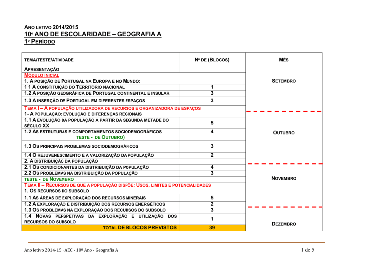 ANO LETIVO 2014/2015 10º ANO DE ESCOLARIDADE – GEOGRAFIA A 1º PERÍODO TEMA/TESTE/ATIVIDADE Nº DE (BLOCOS) APRESENTAÇÃO MÓDULO INICIAL 1. A POSIÇÃO DE PORTUGAL NA EUROPA E NO MUNDO: 1 1 A CONSTITUIÇÃO DO TERRITÓRIO NACIONAL 1.2 A POSIÇÃO GEOGRÁFICA DE PORTUGAL CONTINENTAL E INSULAR 1 3 1.3 A INSERÇÃO DE PORTUGAL EM DIFERENTES ESPAÇOS 3 TEMA I – A POPULAÇÃO UTILIZADORA DE RECURSOS E ORGANIZADORA DE ESPAÇOS 1- A POPULAÇÃO: EVOLUÇÃO E DIFERENÇAS REGIONAIS 1.1 A EVOLUÇÃO DA POPULAÇÃO A PARTIR DA SEGUNDA METADE DO SÉCULO XX 1.2 AS ESTRUTURAS E COMPORTAMENTOS SOCIODEMOGRÁFICOS TESTE - DE OUTUBRO) 5 1.3 OS PRINCIPAIS PROBLEMAS SOCIODEMOGRÁFICOS 3 SETEMBRO 4 1.4 O REJUVENESCIMENTO E A VALORIZAÇÃO DA POPULAÇÃO 2 2. A DISTRIBUIÇÃO DA POPULAÇÃO 2.1 OS CONDICIONANTES DA DISTRIBUIÇÃO DA POPULAÇÃO 4 2.2 OS PROBLEMAS NA DISTRIBUIÇÃO DA POPULAÇÃO 3 TESTE - DE NOVEMBRO TEMA II – RECURSOS DE QUE A POPULAÇÃO DISPÕE: USOS, LIMITES E POTENCIALIDADES 1. OS RECURSOS DO SUBSOLO 1.1 AS ÁREAS DE EXPLORAÇÃO DOS RECURSOS MINERAIS 5 1.2 A EXPLORAÇÃO E DISTRIBUIÇÃO DOS RECURSOS ENERGÉTICOS 2 1.3 OS PROBLEMAS NA EXPLORAÇÃO DOS RECURSOS DO SUBSOLO 3 1.4 NOVAS PERSPETIVAS DA EXPLORAÇÃO E UTILIZAÇÃO DOS 1 RECURSOS DO SUBSOLO TOTAL DE BLOCOS PREVISTOS Ano letivo 2014-15 - AEC - 10º Ano - Geografia A MÊS 39 OUTUBRO NOVEMBRO DEZEMBRO 1 de 5 ANO LETIVO 2014/2015 10º ANO DE ESCOLARIDADE – GEOGRAFIA A 2º PERÍODO TEMA/TESTE/ATIVIDADE Nº DE (BLOCOS) 1.4 NOVAS PERSPETIVAS DA EXPLORAÇÃO E UTILIZAÇÃO DOS RECURSOS DO SUBSOLO (CONTINUAÇÃO) 2. A RADIAÇÃO SOLAR 2.1 A AÇÃO DA ATMOSFERA SOBRE A RADIAÇÃO SOLAR TESTE - JANEIRO 2.2 A VARIABILIDADE DA RADIAÇÃO SOLAR 2.3 A DISTRIBUIÇÃO DA TEMPERATURA EM PORTUGAL A DISTRIBUIÇÃO DA TEMPERATURA EM PORTUGAL (CONTINUAÇÃO) 2.4 A VALORIZAÇÃO ECONÓMICA DA RADIAÇÃO SOLAR TESTE - MARÇO 3. OS RECURSOS HÍDRICOS 3.1 A ESPECIFICIDADE DO CLIMA PORTUGUÊS ESPECIFICIDADE DO CLIMA PORTUGUÊS (CONTINUAÇÃO) 3.2 AS DISPONIBILIDADES HÍDRICAS (INÍCIO) (BLOCOS) - AULAS PREVISTAS MÊS 2 3 JANEIRO 4 3 1 4 FEVEREIRO 5 8 1 MARÇO 31 OBERVAÇÕES Ano letivo 2014-15 - AEC - 10º Ano - Geografia A 2 de 5 ANO LETIVO 2014/2015 10º ANO DE ESCOLARIDADE – GEOGRAFIA A 3º PERÍODO TEMA/TESTE/ATIVIDADE 3.2 AS DISPONIBILIDADES HÍDRICAS (CONTINUAÇÃO) 3.3 A GESTÃO DOS RECURSOS HÍDRICOS A GESTÃO DOS RECURSOS HÍDRICOS (CONTINUAÇÃO) TESTE -3 DE MAIO) 4. OS RECURSOS MARÍTIMOS 4.1 AS POTENCIALIDADES DO LITORAL 4.2 A ATIVIDADE PISCATÓRIA 4.3 A GESTÃO DO ESPAÇO MARÍTIMO (CONTINUAÇÃO) 4.4 A RENTABILIZAÇÃO DO LITORAL E DOS RECURSOS MARÍTIMOS (BLOCOS) - AULAS PREVISTAS Nº DE (BLOCOS) MÊS 6 5 5 ABRIL 3 3 1 2 4 MAIO JUNHO 29 OBERVAÇÕES Ano letivo 2014-15 - AEC - 10º Ano - Geografia A 3 de 5 PREVISÃO DE AULAS E SUMÁRIOS _10º ANO – TURMA - DE ESCOLARIDADE – GEOGRAFIA A ANO LECTIVO 2014/2015 - 1º PERÍODO SETEMBRO 15 A 19 DATA___/___/2014 LIÇÃO Nº _____ 22 A 26 DATA___/___/2014 LIÇÃO Nº _____ DATA___/___/2014 LIÇÃO Nº _____ DATA___/___/2014 LIÇÃO Nº _____ DATA___/___/2014 LIÇÃO Nº _____ 29 A 30 DATA___/___/2014 LIÇÃO Nº _____ DATA___/___/2014 LIÇÃO Nº _____ DATA___/___/2014 LIÇÃO Nº _____ DATA___/___/2014 LIÇÃO Nº _____ DATA___/___/2014 LIÇÃO Nº _____ OUTUBRO 01 A 03 DATA___/___/2014 LIÇÃO Nº _____ 06 A 10 DATA___/___/2014 LIÇÃO Nº _____ DATA___/___/2014 LIÇÃO Nº _____ 13 A 17 DATA___/___/2014 LIÇÃO Nº _____ DATA___/___/2014 LIÇÃO Nº _____ DATA___/___/2014 LIÇÃO Nº _____ OUTUBRO 20 A 24 DATA___/___/2014 LIÇÃO Nº _____ DATA___/___/2014 LIÇÃO Nº _____ Ano letivo 2014-15 - AEC - 10º Ano - Geografia A 27 A 31 DATA___/___/2014 LIÇÃO Nº _____ DATA___/___/2014 LIÇÃO Nº _____ DATA___/___/2014 LIÇÃO Nº _____ DATA___/___/2014 LIÇÃO Nº _____ 4 de 5 NOVEMBRO 03 A 07 DATA___/___/2014 LIÇÃO Nº _____ DATA___/___/2014 LIÇÃO Nº _____ 10 A 14 DATA___/___/2014 LIÇÃO Nº _____ DATA___/___/2014 LIÇÃO Nº _____ DATA___/___/2014 LIÇÃO Nº _____ DATA___/___/2014 LIÇÃO Nº _____ NOVEMBRO 17 A 21 DATA___/___/2014 LIÇÃO Nº _____ DATA___/___/2014 LIÇÃO Nº _____ 24 A 28 DATA___/___/2014 LIÇÃO Nº _____ DATA___/___/2014 LIÇÃO Nº _____ DATA___/___/2014 LIÇÃO Nº _____ DEZEMBRO 09 A 12 01 A 05 DATA___/___/2014 LIÇÃO Nº _____ DATA___/___/2014 LIÇÃO Nº _____ DATA___/___/2014 LIÇÃO Nº _____ Ano letivo 2014-15 - AEC - 10º Ano - Geografia A DATA___/___/2014 LIÇÃO Nº _____ DATA___/___/2014 LIÇÃO Nº _____ DATA___/___/2014 LIÇÃO Nº _____ 15 A 16 DATA___/___/2014 LIÇÃO Nº _____ DATA___/___/2014 LIÇÃO Nº _____ 5 de 5