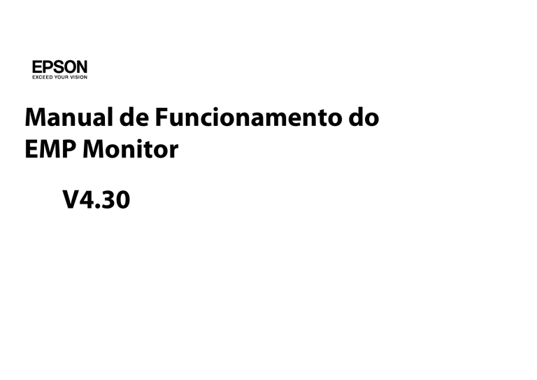 Manual de Funcionamento do EMP Monitor V4.30 2 Significado dos símbolos utilizados A seguinte tabela indica os símbolos utilizados neste manual, juntamente com as descrições sobre os seus significados. s [ (Nome) ] Indica uma página na qual pode obter informações pormenorizadas relativas a um tópico. Indica o nome dos botões do controle remoto ou do painel de controle. Exemplo: Botão Esc "(Nome)" Temporizador Indica a nomenclatura dos botões ou itens no EMP Monitor. Exemplo: Seleccione "Temporizador" - "Definições do Temporizador". Seleccione Temporizador - Definições do Temporizador. Índice de Conteúdo Significado dos símbolos utilizados EMP Monitor Funções 3 Se o nome do videoprojector ou o endereço IP for alterado após o registo . . 21 Para videoprojectores registados manualmente . . . . . . . . . . . . . . . . . . . . . . 21 Para videoprojectores que foram registados através da busca automática 21 Cancelar (apagar) os registos do videoprojector . . . . . . . . . . . . . . . . . . . . . . . . . 21 Funções do EMP Monitor . . . . . . . . . . . . . . . . . . . . . . . . . . . . . . . . . . . . . . 6 Propriedades da janela de monitorização . . . . . . . . . . . . . . . . . . . . . . 22 Ambiente de funcionamento . . . . . . . . . . . . . . . . . . . . . . . . . . . . . . . . . . 8 Monitorizar através de Exibir grupos . . . . . . . . . . . . . . . . . . . . . . . . . . . . . . . . . . . . 22 Significados dos ícones Exibir grupos . . . . . . . . . . . . . . . . . . . . . . . . . . . . . . . . . 22 Utilização dos ícones em Exibir grupos . . . . . . . . . . . . . . . . . . . . . . . . . . . . . . . 24 Monitorização com Exibir lista de detalhes . . . . . . . . . . . . . . . . . . . . . . . . . . . . . . 24 Significados dos ícones Exibir lista de detalhes. . . . . . . . . . . . . . . . . . . . . . . . 24 Seleccionar itens de visualização . . . . . . . . . . . . . . . . . . . . . . . . . . . . . . . . . . . . . 26 Listas ordenadas . . . . . . . . . . . . . . . . . . . . . . . . . . . . . . . . . . . . . . . . . . . . . . . . . . . . . 27 Localização de ícones desejados (Lista do videoprojector) . . . . . . . . . . . . . . . 27 Monitorizar através do tabuleiro do sistema . . . . . . . . . . . . . . . . . . . . . . . . . . . . . 27 Exibir em lista, videoprojectores com estados de problema ou advertência. . 28 Verificação de propriedades em detalhes . . . . . . . . . . . . . . . . . . . . . . . . . . . . . . . 31 Exibição das propriedades dos grupos. . . . . . . . . . . . . . . . . . . . . . . . . . . . . . . . 31 Exibição das propriedades dos videoprojectores . . . . . . . . . . . . . . . . . . . . . . 31 Exibição e deleção de registos . . . . . . . . . . . . . . . . . . . . . . . . . . . . . . . . . . . . . . . . . . 31 Exibição de registos. . . . . . . . . . . . . . . . . . . . . . . . . . . . . . . . . . . . . . . . . . . . . . . . . . 32 Deleção de registos . . . . . . . . . . . . . . . . . . . . . . . . . . . . . . . . . . . . . . . . . . . . . . . . . . 32 Computadores compatíveis . . . . . . . . . . . . . . . . . . . . . . . . . . . . . . . . . . . . . . . . . . . . . 8 Instalação do EMP Monitor . . . . . . . . . . . . . . . . . . . . . . . . . . . . . . . . . . . . . . . . . . . . . . 8 Limitações impostas por um ambiente Windows Vista . . . . . . . . . . . . . . . . . . . . 9 Antes de iniciar as operações . . . . . . . . . . . . . . . . . . . . . . . . . . . . . . . . . . . . . . . . . . . . 9 Utilização do EMP Monitor Registo e deleção de videoprojectores para monitorização . . . . . 11 Início do EMP Monitor . . . . . . . . . . . . . . . . . . . . . . . . . . . . . . . . . . . . . . . . . . . . . . . . . . 11 Registar videoprojectores com a busca automática (Buscar e registar videoprojectores localizados no mesmo segmento) . . . . . . . . . . . . . . . . . . . . . 12 Procedimentos para busca automática . . . . . . . . . . . . . . . . . . . . . . . . . . . . . . . 12 Procedimentos de registo . . . . . . . . . . . . . . . . . . . . . . . . . . . . . . . . . . . . . . . . . . . . 13 Definição duma gama de endereços para realizar uma busca automática e registo . . . . . . . . . . . . . . . . . . . . . . . . . . . . . . . . . . . . . . . . . . . . . . . . . . . . . . . . . . . . . . . 14 Procedimentos para busca automática . . . . . . . . . . . . . . . . . . . . . . . . . . . . . . . 14 Procedimentos de registo . . . . . . . . . . . . . . . . . . . . . . . . . . . . . . . . . . . . . . . . . . . . 16 Registo mediante especificação dum endereço IP (Registo Manual) . . . . . . 18 Registo de vários videoprojectores duma só vez num grupo de monitorização. . . . . . . . . . . . . . . . . . . . . . . . . . . . . . . . . . . . . . . . . . . . . . . . . . . . . . . 19 Utilização das funções de controle . . . . . . . . . . . . . . . . . . . . . . . . . . . . 33 Realização de controle com os botões de controle. . . . . . . . . . . . . . . . . . . . . . . 33 Realização de controle com um navegador web (Controle da Web) . . . . . . 34 Realização do controle com as definições do temporizador . . . . . . . . . . . . . . 35 Procedimentos para novas definições de temporizador . . . . . . . . . . . . . . . 36 Definições da função de notificação por correio electrônico . . . . . 38 4 Notificaçáo por e-mail sobre problema/advertência/estado. . . . . 40 Função de protecção de aplicação. . . . . . . . . . . . . . . . . . . . . . . . . . . . . 42 Comutar a proteger aplicação entre activada e desactivada. . . . . . . . . . . . . . 42 Activação da protecção de aplicações . . . . . . . . . . . . . . . . . . . . . . . . . . . . . . . . 42 Desactivação da protecção de aplicações . . . . . . . . . . . . . . . . . . . . . . . . . . . . . 42 Definir uma senha para cancelar a protecção de aplicação . . . . . . . . . . . . . . . 42 Apêndice Resolução de problemas. . . . . . . . . . . . . . 