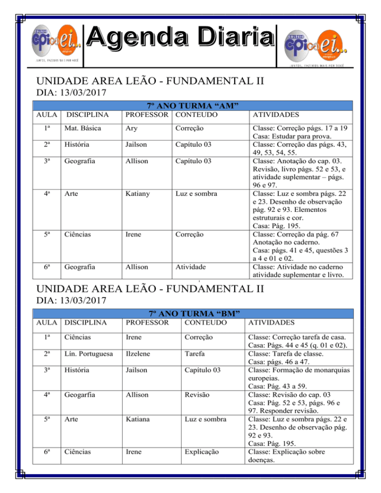 CiêCiências UNIDADE AREA LEÃO - FUNDAMENTAL II DIA: 13/03/2017 7º ANO TURMA “AM” AULA DISCIPLINA PROFESSOR CONTEUDO ATIVIDADES 1ª Mat. Básica Ary Correção 2ª História Jailson Capítulo 03 3ª Geografia Allison Capítulo 03 4ª Arte Katiany Luz e sombra 5ª Ciências Irene Correção 6ª Geografia Allison Atividade Classe: Correção págs. 17 a 19 Casa: Estudar para prova. Classe: Correção das págs. 43, 49, 53, 54, 55. Classe: Anotação do cap. 03. Revisão, livro págs. 52 e 53, e atividade suplementar – págs. 96 e 97. Classe: Luz e sombra págs. 22 e 23. Desenho de observação pág. 92 e 93. Elementos estruturais e cor. Casa: Pág. 195. Classe: Correção da pág. 67 Anotação no caderno. Casa: págs. 41 e 45, questões 3 a 4 e 01 e 02. Classe: Atividade no caderno atividade suplementar e livro. i UNIDADE AREA LEÃO - FUNDAMENTAL II DIA: 13/03/2017 7º ANO TURMA “BM” AULA DISCIPLINA PROFESSOR CONTEUDO ATIVIDADES Classe: Correção tarefa de casa. Casa: Págs. 44 e 45 (q. 01 e 02). Classe: Tarefa de classe. Casa: págs. 46 a 47. Classe: Formação de monarquias europeias. Casa: Pág. 43 a 59. Classe: Revisão do cap. 03 Casa: Pág. 52 e 53, págs. 96 e 97. Responder revisão. Classe: Luz e sombra págs. 22 e 23. Desenho de observação pág. 92 e 93. Casa: Pág. 195. Classe: Explicação sobre doenças. 1ª Ciências Irene Correção 2ª Lín. Portuguesa Ilzelene Tarefa 3ª História Jailson Capítulo 03 4ª Geogarfia Allison Revisão 5ª Arte Katiana Luz e sombra 6ª Ciências Irene Explicação