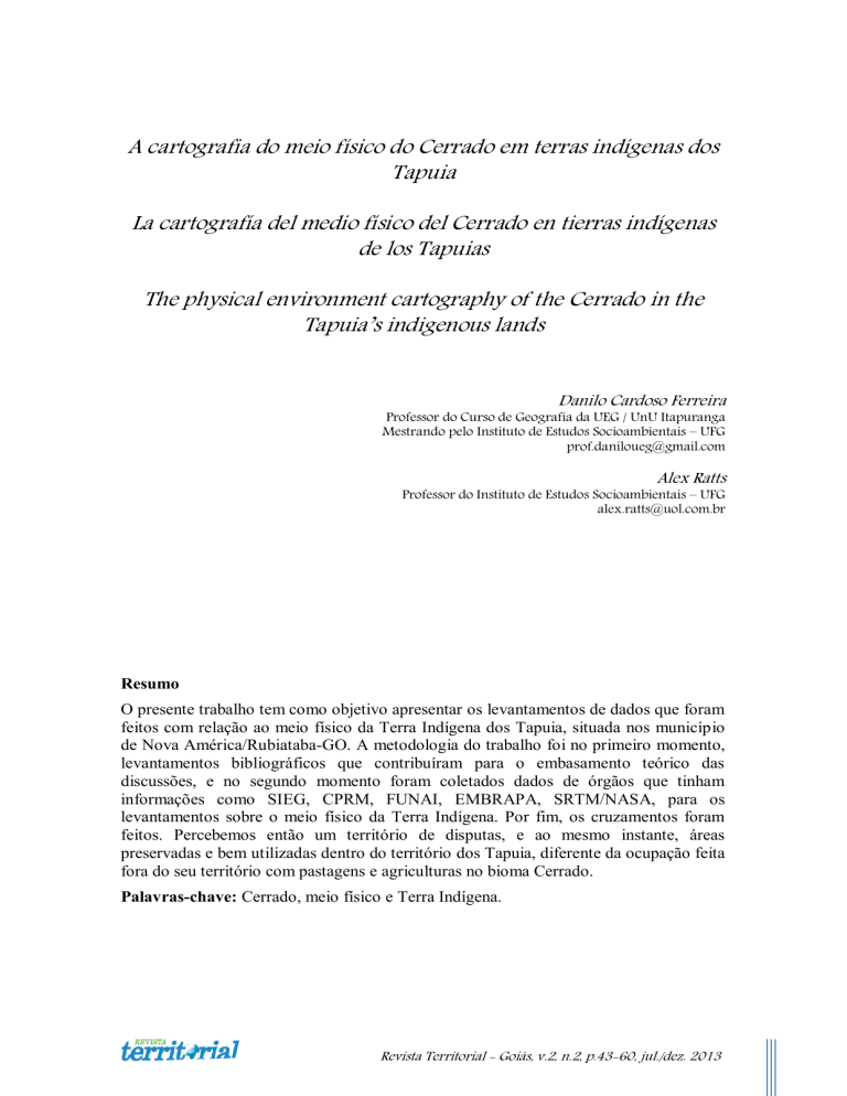 A cartografia do meio físico do Cerrado em terras indígenas dos Tapuia La cartografía del medio físico del Cerrado en tierras indígenas de los Tapuias The physical environment cartography of the Cerrado in the Tapuia’s indigenous lands Danilo Cardoso Ferreira Professor do Curso de Geografia da UEG / UnU Itapuranga Mestrando pelo Instituto de Estudos Socioambientais – UFG [email protected] Alex Ratts Professor do Instituto de Estudos Socioambientais – UFG [email protected] Resumo O presente trabalho tem como objetivo apresentar os levantamentos de dados que foram feitos com relação ao meio físico da Terra Indígena dos Tapuia, situada nos município de Nova América/Rubiataba-GO. A metodologia do trabalho foi no primeiro momento, levantamentos bibliográficos que contribuíram para o embasamento teórico das discussões, e no segundo momento foram coletados dados de órgãos que tinham informações como SIEG, CPRM, FUNAI, EMBRAPA, SRTM/NASA, para os levantamentos sobre o meio físico da Terra Indígena. Por fim, os cruzamentos foram feitos. Percebemos então um território de disputas, e ao mesmo instante, áreas preservadas e bem utilizadas dentro do território dos Tapuia, diferente da ocupação feita fora do seu território com pastagens e agriculturas no bioma Cerrado. Palavras-chave: Cerrado, meio físico e Terra Indígena. Revista Territorial - Goiás, v.2, n.2, p.43-60, jul./dez. 2013 A cartografia do meio físico do Cerrado em terras indígenas... FERREIRA, D. C.; RATTS, A. Resumen 44 Este trabajo tiene como objetivo presentar los levantamientos de datos que fueran hechos en relación con el medio físico de la Tierra Indígena Tapuia, ubicada en el municipio de Nova América / Rubiataba-GO. La metodología del trabajo fue en primer momento, levantamientos bibliográficos, que contribuyeron a las discusiones teóricas, y en un según momento, fueran colectados los datos de órganos que tenían informaciones como SIEG, MRCP, FUNAI, EMBRAPA, SRTM / NASA, para levantamientos sobre el ambiente físico de la Tierra Indígena. Por último, los cruzamientos fueron hechos. Percibimos entonces un territorio de disputas, y al mismo tiempo, áreas conservadas y bien utilizadas dentro de los Tapuia, diferente de la ocupación hecha fuera de su territorio con pastos vulnerables y agriculturas en el bioma Cerrado. Palabras clave: cerrado, medio físico y Tierras indígenas Abstract This work has as an objective to present the data surveys which have been carried out with relation to the physical environment of the Tapuia’s Indigenous Land, located in Nova América/Rubiataba town, Goiás State. The work methodology was at the first moment, bibliographical surveys which contributed to the theoretical foundation of the discussions, and at the second moment were collected data of bodies which had information like SIEG, CPRM, FUNAI, EMBRAPA, SRTM/NASA, for the surveys about the indigenous land physical environment. At last, the junctions were carried out. So, we perceive a dispute territory, and at the same time, preserved and well-used areas inside the Tapuia’s territory, different from the occupation taken out of its territory with vulnerable pastures and agriculture in the biome Cerrado (vegetation of the Brazilian interior). Keywords: Cerrado, physical environment and Indigenous Land. Introdução A cartografia que envolve a representação das questões físicas da terra indígena dos Tapuias vem para contribuir para a literatura e à interpretação do meio físico da Terra indígena, e principalmente, pois atualmente nesta localidade possui índios pesquisadores, e este trabalho vai oportunizarmos a discussões, debates e pesquisas mais profícuas. Revista Territorial - Goiás, v.2, n.2, p.43-60, jul./dez. 2013 A proposta deste trabalho é apresentar a interpretação “Geoambiental” com a utilização do SIGs1 para contribuir com a informação sobre o espaço da Terra Indígena Tapuia, propondo um trabalho de análise e descrição desta área. O trabalho se propõe em discutir como a terra indígena é vista pela descrição da geografia. E também porque existe uma carência por parte de mapeamentos da T.I2 do Carretão, apesar de que a FUNAI tem algumas informações, porém com mapas de pequenas escalas. Agora algumas peculiaridades que serão apontados sobre a T.I são de embasamentos teóricos que conseguimos da própria comunidade, e vale resaltar que não foi feito trabalho de campo ou questionário de nossa parte; mas as informações de características particulares foram feitas por acadêmicos/as da própria comunidade que são alunos/as do Curso de Licenciatura Intercultural da Universidade Federal de Goiás. Então o trabalho faz uma descrição pormenorizada da T.I do Carretão, utilizando bases com escalas grandes para a fundamentação da nossa análise. A percepção da ocupação do uso da terra feita pela a comunidade e pelas regiões vizinhas também é de nosso interesse para, apontamentos ambientais com relação ao mau uso. O Cerrado numa análise conceitual A princípio esta discussão ambiental na Geografia sempre buscou a percepção de degradação da paisagem dentre outros aspectos, neste texto a nossa proposta inicial é trabalhar com a categoria paisagem, para que possamos melhor entender o meio físico da Terra Indígena estudada. Levantando aspectos com relação geologia, clima, hidrografia, pedologia, uso do solo, geomorfologia e vegetação. Com relação ao método de análise utilizado, a paisagem é a categoria que auxiliará o desenvolvimento conceitual do trabalho; para isso, precisa-se esclarecer o que entendemos por paisagem. A palavra paisagem segundo o dicionário de (GEOLOGIA SEDIMENTAR de KENITIRO, 1998, p. 378) diz que: “Conceito de Geografia Física (physical Geography) baseado em princípios sistêmicos ou holísticos, aproximadamente equivalente à paisagem (landscape), através do qual são estudados os elementos co