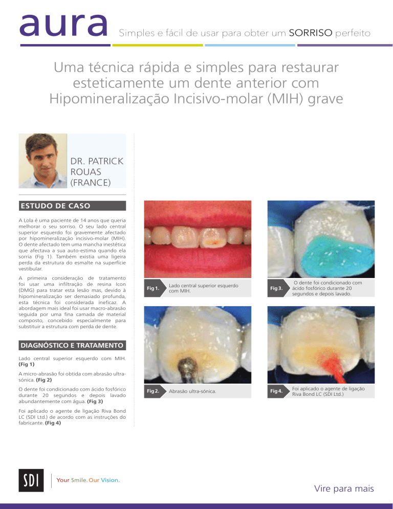 aura Simples e fácil de usar para obter um SORRISO perfeito Uma técnica rápida e simples para restaurar esteticamente um dente anterior com Hipomineralização Incisivo-molar (MIH) grave DR. Patrick Rouas (France) ESTUDO DE CASO A Lola é uma paciente de 14 anos que queria melhorar o seu sorriso. O seu lado central superior esquerdo foi gravemente afectado por hipomineralização incisivo-molar (MIH). O dente afectado tem uma mancha inestética que afectava a sua auto-estima quando ela sorria (Fig 1). Também existia uma ligeira perda da estrutura do esmalte na superfície vestibular. A primeira consideração de tratamento foi usar uma infiltração de resina Icon (DMG) para tratar esta lesão mas, devido à hipomineralização ser demasiado profunda, esta técnica foi considerada ineficaz. A abordagem mais ideal foi usar macro-abrasão seguida por uma fina camada de material composto, concebido especialmente para substituir a estrutura com perda de dente. Fig 1. Lado central superior esquerdo com MIH. Fig 3. O dente foi condicionado com ácido fosfórico durante 20 segundos e depois lavado. Fig 2. Abrasão ultra-sónica. Fig 1. Fig 4. Foi aplicado o agente de ligação Riva Bond LC (SDI Ltd.) DIAGNÓSTICO E TRATAMENTO Lado central superior esquerdo com MIH. (Fig 1) A micro-abrasão foi obtida com abrasão ultrasónica. (Fig 2) O dente foi condicionado com ácido fosfórico durante 20 segundos e depois lavado abundantemente com água. (Fig 3) Foi aplicado o agente de ligação Riva Bond LC (SDI Ltd.) de acordo com as instruções do fabricante. (Fig 4) Your Smile. Our Vision. Vire para mais aura Simples e fácil de usar para obter um SORRISO perfeito DIAGNÓSTICO E TRATAMENTO CASE 2 Foi aplicado um opaco usando um pincel e fotopolimerização. (Fig 5) O esmalte perdido foi substituído com Aura (SDI Ltd.) de tons E1 e E2 e fotopolimerizado. (Fig 6) A restauração foi polida usando discos de polimento grosseiro e depois finos. Foram então usadas pastas de polimento com um pincel, para alcançar um acabamento de elevado brilho. (Fig 7) A ponte de borracha foi removida e o excelente resultado foi aprovado tanto pelo paciente como pelos seus pais. (Fig 8) Your Smile. Our Vision. Fig 5. Foi aplicado um opaco usando um pincel e fotopolimerização. Fig 7. A restauração foi polida usando discos de polimento grosseiro e depois finos Fig 6. O esmalte perdido foi substituído com Aura (SDI Ltd.) de tons E1 e E2 e fotopolimerizado Fig 8. A ponte de borracha foi removida e o excelente resultado foi aprovado.