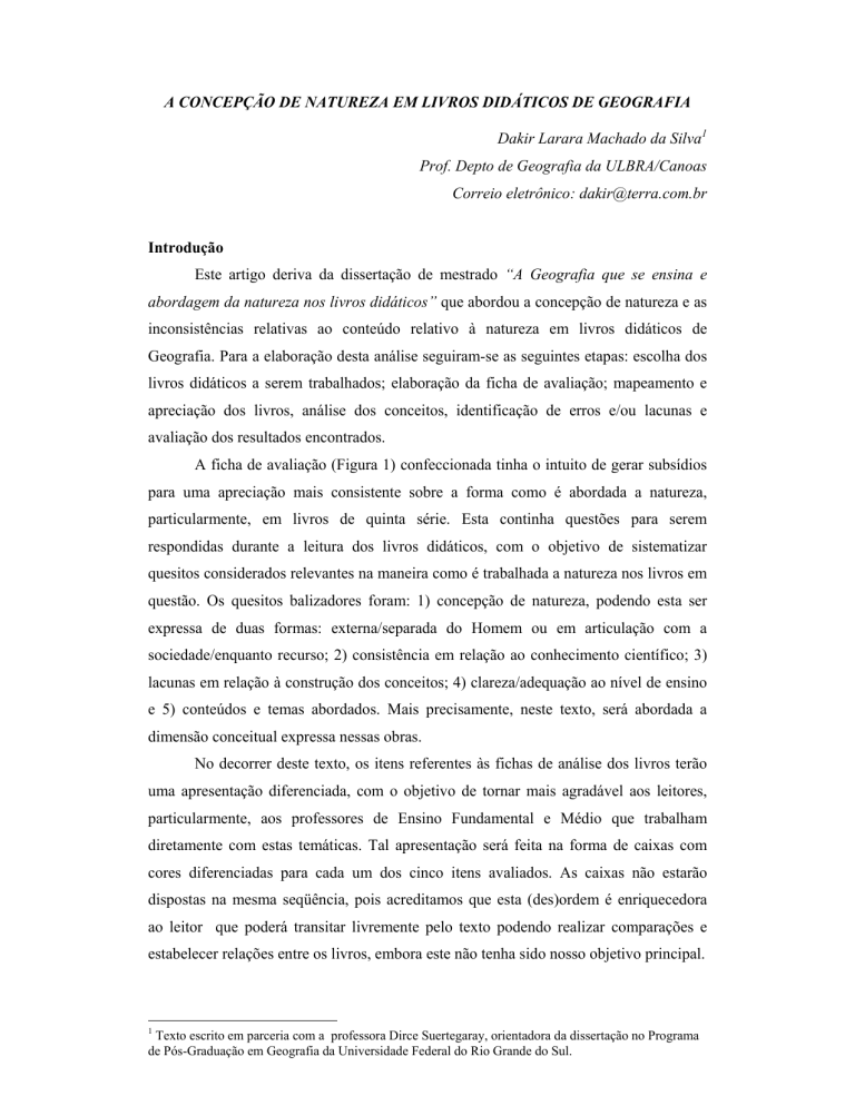 A CONCEPÇÃO DE NATUREZA EM LIVROS DIDÁTICOS DE GEOGRAFIA Dakir Larara Machado da Silva1 Prof. Depto de Geografia da ULBRA/Canoas Correio eletrônico: [email protected] Introdução Este artigo deriva da dissertação de mestrado “A Geografia que se ensina e abordagem da natureza nos livros didáticos” que abordou a concepção de natureza e as inconsistências relativas ao conteúdo relativo à natureza em livros didáticos de Geografia. Para a elaboração desta análise seguiram-se as seguintes etapas: escolha dos livros didáticos a serem trabalhados; elaboração da ficha de avaliação; mapeamento e apreciação dos livros, análise dos conceitos, identificação de erros e/ou lacunas e avaliação dos resultados encontrados. A ficha de avaliação (Figura 1) confeccionada tinha o intuito de gerar subsídios para uma apreciação mais consistente sobre a forma como é abordada a natureza, particularmente, em livros de quinta série. Esta continha questões para serem respondidas durante a leitura dos livros didáticos, com o objetivo de sistematizar quesitos considerados relevantes na maneira como é trabalhada a natureza nos livros em questão. Os quesitos balizadores foram: 1) concepção de natureza, podendo esta ser expressa de duas formas: externa/separada do Homem ou em articulação com a sociedade/enquanto recurso; 2) consistência em relação ao conhecimento científico; 3) lacunas em relação à construção dos conceitos; 4) clareza/adequação ao nível de ensino e 5) conteúdos e temas abordados. Mais precisamente, neste texto, será abordada a dimensão conceitual expressa nessas obras. No decorrer deste texto, os itens referentes às fichas de análise dos livros terão uma apresentação diferenciada, com o objetivo de tornar mais agradável aos leitores, particularmente, aos professores de Ensino Fundamental e Médio que trabalham diretamente com estas temáticas. Tal apresentação será feita na forma de caixas com cores diferenciadas para cada um dos cinco itens avaliados. As caixas não estarão dispostas na mesma seqüência, pois acreditamos que esta (des)ordem é enriquecedora ao leitor que poderá transitar livremente pelo texto podendo realizar comparações e estabelecer relações entre os livros, embora este não tenha sido nosso objetivo principal. 1 Texto escrito em parceria com a professora Dirce Suertegaray, orientadora da dissertação no Programa de Pós-Graduação em Geografia da Universidade Federal do Rio Grande do Sul. Título do Livro: Autor(es): Editora: Ano de Publicação: A) Conteúdos abordados - relato/síntese sobre o conteúdo proposto em cada livro, tomando como referência o sumário, capítulos, sub-capítulos. Descrição da obra nas unidades relativas ao conteúdo da natureza. B) Concepção de Natureza - análise da concepção de natureza presente em cada livro. Observar se é compreendida como sendo externalidade ou como articulação da natureza com a sociedade. C) Consistência – consistência em relação ao conhecimento atual. Verificar se os conteúdos estão atualizados e corretamente apresentados, considerando o acúmulo de conhecimento sobre a natureza neste último século (XX). D) Lacunas na construção dos conceitos - avaliar a presença de lacunas ou inconsistência na formulação dos conceitos e/ou outras informações relativas ao tema. E) Clareza e adequação ao nível do ensino - avaliar se a linguagem utilizada na construção do conhecimento da natureza está adequada ao nível de ensino a que se propõe. Avaliar se a proposta de construção do conceito é adequada ao nível de ensino que se propõe. Figura 1 - Ficha de Avaliação de Livro Didático 5ª série. A seguir, o leitor será instruído com a legenda de cores para que possam ser feitas as associações entre os diferentes quesitos: conteúdos abordados – caixa verde; concepção de natureza – caixa amarela; consistência – caixa azul; lacunas na construção dos conceitos – caixa laranja; clareza e adequação ao nível de ensino – caixa lilás. O conceito de natureza nos livros didáticos Na etapa da seleção dos livros didáticos, foram escolhidos sete livros relativos à quinta série do Ensino Fundamental. A escolha destes livros estava amparada em minha experiência enquanto professor de Geografia no Ensino Fundamental durante três anos em uma escola particular de Porto Alegre, associado ao fato de serem estes livros muito divulgados pelas editoras nas escolas. Além disso, a minha experiência no Ensino Superior na Universidade Luterana do Brasil (ULBRA), hoje lecionando as disciplinas de Geografia Física, Climatologia e Biogeografia, colaborou muito para a maturação da desta idéia. Nesta perspectiva, a inter-relação das duas atividades criou uma interface entre elas – o Ensino Fundamental e o uso do livro didático e o Ensino Superior e o conteúdo de Geografia Física abordado. A amostra selecionada procurou trazer as mais diferentes abordagens do tema natureza, refletindo posicionamentos bastante distintos dentro do ensino de Geografia. São eles: ARAÚJO, R. GUIMARÃES, R. B.; RIBEIRO, W. C. Construindo a Geografia. Livro do professor, 5ª Série. São Paulo: Editora Moderna, 1999. 192p. BOLIGIAN, L.; MARTINEZ, R.; GARCIA, W.; ALVES, A. Geografia Espaço e Vivência. Introdução à ciência geográfica: 5ª série. São Paulo: Atual, 2001. 176p. CASTELLAR, S.; MAESTRO, V. Geografia. Livro do professor, 5ª Série. São Paulo: Quinteto Editorial, 2001. 191p. GARCIA, H. C.; GARAVELLO, T. M. Novo lições de Geografia. Espaço geográfico e fenômenos naturais. Livro do professor. São Paulo: Editora Scipione, 2002. 192p. MAGNOLI, D. GÉIA. Fundamentos da Geografia. Livro do professor. 5ª Série. São Paulo: Editora Moderna, 2002. 223p. MOREIRA, I. Construindo o espaço humano: 5ª série. São Paulo: Ática, 2002. 279p. VESENTINI, J. W.; VLACH, V. Geografia Crítica: o espaço natural e a ação humana. 
