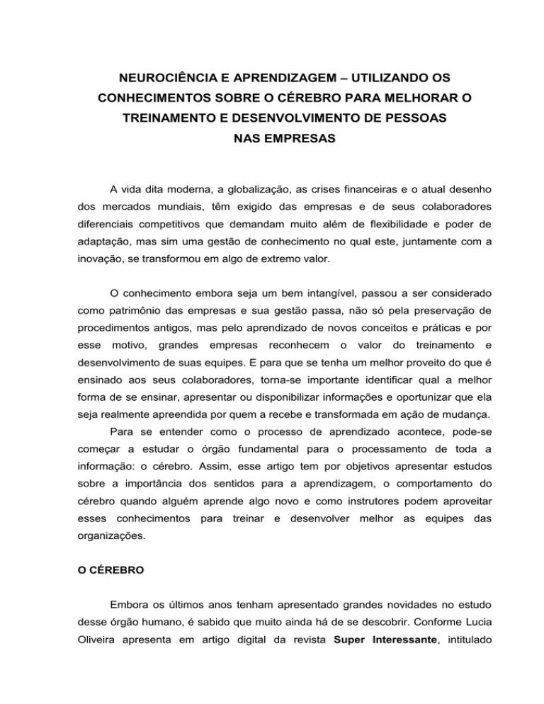 NEUROCIÊNCIA E APRENDIZAGEM – UTILIZANDO OS CONHECIMENTOS SOBRE O CÉREBRO PARA MELHORAR O TREINAMENTO E DESENVOLVIMENTO DE PESSOAS NAS EMPRESAS A vida dita moderna, a globalização, as crises financeiras e o atual desenho dos mercados mundiais, têm exigido das empresas e de seus colaboradores diferenciais competitivos que demandam muito além de flexibilidade e poder de adaptação, mas sim uma gestão de conhecimento no qual este, juntamente com a inovação, se transformou em algo de extremo valor. O conhecimento embora seja um bem intangível, passou a ser considerado como patrimônio das empresas e sua gestão passa, não só pela preservação de procedimentos antigos, mas pelo aprendizado de novos conceitos e práticas e por esse motivo, grandes empresas reconhecem o valor do treinamento e desenvolvimento de suas equipes. E para que se tenha um melhor proveito do que é ensinado aos seus colaboradores, torna-se importante identificar qual a melhor forma de se ensinar, apresentar ou disponibilizar informações e oportunizar que ela seja realmente apreendida por quem a recebe e transformada em ação de mudança. Para se entender como o processo de aprendizado acontece, pode-se começar a estudar o órgão fundamental para o processamento de toda a informação: o cérebro. Assim, esse artigo tem por objetivos apresentar estudos sobre a importância dos sentidos para a aprendizagem, o comportamento do cérebro quando alguém aprende algo novo e como instrutores podem aproveitar esses conhecimentos para treinar e desenvolver melhor as equipes das organizações. O CÉREBRO Embora os últimos anos tenham apresentado grandes novidades no estudo desse órgão humano, é sabido que muito ainda há de se descobrir. Conforme Lucia Oliveira apresenta em artigo digital da revista Super Interessante, intitulado 2 Cérebro Humano, com a ajuda da câmara de pósitrons (aparelho que permite visualizar o cérebro em atividade), foi possível verificar que: ...as últimas descobertas aconselham apagar da memória a gasta analogia do computador. Parece muito mais adequado comparar o cérebro humano a um movimentado pregão da Bolsa ou a um igualmente agitado debate estudantil em que as informações pipocam de forma desorganizada e muitas vezes prevalece quem fala mais alto. No ano passado, cientistas americanos concluíram que qualquer estímulo que chega ao cérebro não segue uma rota definida, mas percorre diversos caminhos de neurônios, e alguns vão levar a dados que nada têm a ver com o assunto tratado. Esse órgão espetacular que apresenta aproximadamente 86 bilhões de neurônios (células nervosas) é dividido em dois hemisférios, o esquerdo e o direito, sendo que cada lado é responsável por determinadas funções, mas embora seja muito difundida a teoria de que o lado esquerdo é mais racional e lógico e o direito mais ligado às emoções e a criatividade, sabe-se que o cérebro trabalha em conjunto e a ligação entre os dois lados é feita por uma fissura que é composta por fibras nervosas brancas (axônios envolvidos em mielina) a qual faz uma ponte para a troca de informações entre as muitas áreas do cérebro. Além dos dois lados, que coordenam a inteligência e o raciocínio do indivíduo, o cérebro é formado por mais dois componentes, isso em sua estrutura básica, o cerebelo e o tronco cerebral, sendo o primeiro o coordenador geral da motricidade, da manutenção do equilíbrio e da postura corporal, segundo compartilhou Marcelo Oliveira, outras partes ainda ligam o cérebro à medula espinhal, o que faz a sua ligação com o restante do corpo. O CÉREBRO E OS CINCO SENTIDOS O conhecimento está intrinsecamente ligado aos sentidos. Aprende-se ouvindo, vendo, escutando e sentindo. Nenhum aprendizado é processado pelo cérebro antes de ter passado por um dos órgãos dos sentidos. Por esse motivo compreender-se que o estimulo de cada um deles é importante, e como eles combinados podem ser mais bem utilizados para se assimilar um novo processo. Desde a infância é através dos órgãos dos sentidos (olhos, nariz, ouvido, boca, pele) que as crianças passam a descobrir o mundo e interagir com ele. Em cada uma das fases as crianças desenvolvem determinadas aptidões até que em determinado período, segundo WADSWORTH (1996) as estruturas cognitivas 3 passam a permitir uma abstração total das representações. Ela passa a ser capaz de pensar logicamente, formulando hipóteses e buscando soluções não só dependendo da observação do real. Assim, suas percepções passam a ser um conjunto das informações captadas pelos sentidos e processadas pelo cérebro. Esse processamento, é claro, não acontece de forma sistêmica e igual para todos. Pois as condições ambientais, hereditárias e as experiências de cada pessoa, fazem com que os dados sejam armazenados, eliminados ou reorganizados de forma bastante distinta de pessoa para pessoa. Desse modo, a maneira como as informações “entram” no cérebro são determinantes para que sejam armazenadas e processadas de forma que produzam uma mudança de comportamento e uma memória mais facilmente recuperada quando necessária. Portanto é interessante saber que o cérebro retém apenas 5% daquilo que ouve; 10% do que lê, 20% do que vê, 30% do que demonstra, 50% do que discute em grupo, 75% do que pratica e 90% do que ensina aos outros. Assim sendo, se depois de se ler, ouvir ou ver, houver uma prática dialética, haverá um processamento maior dos dados e uma mudança comportamental que é comandada pelo cérebro. E embora estudiosos como Heckman (2004) considerem que a infância e a adolescência sejam determinantes para a qualidade do aprendizado e mesmo do sucesso do ser humano, sempre se está aprendendo algo novo e descobrindo novas capacidades do cérebro e sua plasticidade. Segundo Pantano (2009), a plasticidade é um termo usado referindo-se as capacidades adaptativas do Sistema Nervoso Central, se