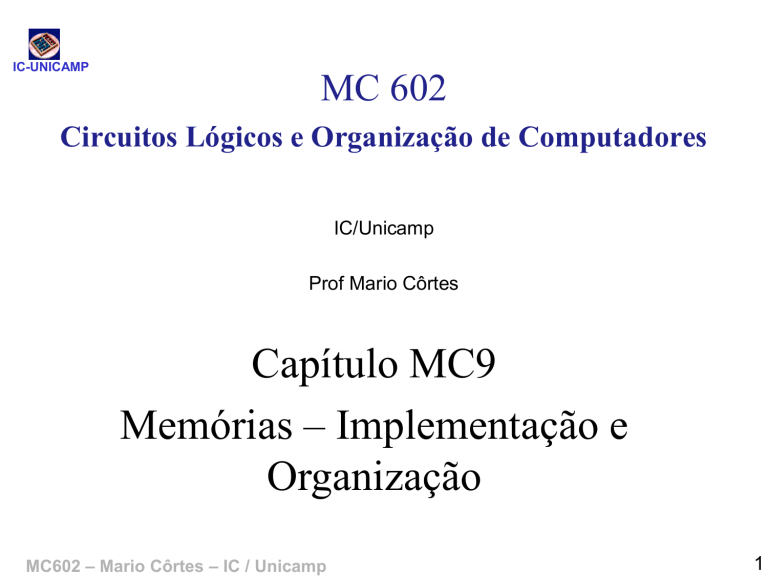 IC-UNICAMP MC 602 Circuitos Lógicos e Organização de Computadores IC/Unicamp Prof Mario Côrtes Capítulo MC9 Memórias – Implementação e Organização MC602 – Mario Côrtes – IC / Unicamp 1 Tópicos IC-UNICAMP • Tipos de memórias • Organização • Decodificação de endereço MC602 – Mario Côrtes – IC / Unicamp 2 IC-UNICAMP Memórias • Matrizes de células capazes de armazenar eficientemente grande quantidadde de dados • Principais tipos memórias: – Memória somente de leitura – Read only memory (ROM) – Memórias de leitura e escrita – Random Access Memory (RAM) • Memórias dinâmicas – Dynamic random access memory (DRAM) • Memórias estáticas – Static random access memory (SRAM) • Um dado de valor de M-bit pode ser lido ou escrito por vez em um endereço de N-bit. MC602 – Mario Côrtes – IC / Unicamp 3 IC-UNICAMP Organização e dimensões • Organizadas como uma matriz (array) de duas dimensões de células de bits – Cada célula armazena um bit • Dimensões – Largura (width): nº de colunas no array = nº de bits na linha de dados = word size – Profundidade (Depth): número de linhas do array – Tamanho do array = largura x profundidade MC602 – Mario Côrtes – IC / Unicamp 4 Organização e dimensões (2) IC-UNICAMP • Entradas – Endereço: n bits selecionam 2n linhas – Dados (bidirecional): m bits de dados de escrita ou leitura – Controle: WR, RD, OutputEnable • Tamanho da memória – 2n * m bits – Exemplo: se m = 8 (1 Byte) e n = 10 • • • • 1024 linhas (1K) e 8 colunas tamanho da memória = 1 KB ou 1K x 1B ou 8 Kb MC602 – Mario Côrtes – IC / Unicamp n Address Array m Data 5 Memória : Exemplo IC-UNICAMP • Array de 22 × 3-bit • Word size de 3-bits Address Data Address 2 Array 3 Data MC602 – Mario Côrtes – IC / Unicamp 11 0 1 0 10 1 0 0 01 1 1 0 00 0 1 1 depth width 6 IC-UNICAMP Memória : Exemplo • Nº de linhas = 210 = 1024 = 1K • Nº de colunas = word size = 32 bits = 4B • Tamanho – 1K x 4B – ou 4KB – ou 32 Kb Address 10 1024-word x 32-bit Array 32 Data MC602 – Mario Côrtes – IC / Unicamp 7 Memória: Célula de bit IC-UNICAMP • Procedimento para leitura bitline – Endereço seleciona (decodificador) 1 linha – Cada célula selecionada aciona o bitline, levando o valor para a saída wordline stored bit • Procedimento para escrita Exemplo bitline = wordline = 1 bitline = wordline = 0 stored bit = 0 stored bit = 0 bitline = wordline = 1 bitline = wordline = 0 stored bit = 1 (a) MC602 – Mario Côrtes – IC / Unicamp – Endereço seleciona (decodificador) 1 linha – Valor a ser escrito colocado na bitline (bidirecional) – Sinal de controle WR ativa a escrita do valor do bitline na célula stored bit = 1 (b) 8 Memória: 4x3 IC-UNICAMP 2:4 Decoder 11 Address wordline3 2 10 01 00 bitline2 wordline2 wordline1 wordline0 stored bit = 0 stored bit = 1 stored bit = 0 stored bit = 1 stored bit = 0 stored bit = 0 stored bit = 1 stored bit = 1 stored bit = 0 stored bit = 0 stored bit = 1 stored bit = 1 Data2 MC602 – Mario Côrtes – IC / Unicamp bitline1 Data1 bitline0 Data0 9 IC-UNICAMP Tipos de Memórias • Read only memory (ROM): não volátil • Random access memory (RAM): volátil MC602 – Mario Côrtes – IC / Unicamp 10 ROM IC-UNICAMP • Read only memory (ROM) – Não volátil: não perdem seus dados quando a alimentação é desligada – Pode ser lida rapidamente, porém a escrita é lenta (no caso das ROMs reprogramáveis) – Memórias em câmeras digitais, pen drives são ROMs – Historicamente denominadas de read only memory porque as primeiras ROMs eram fabricadas já com os dados ou escritas posteriormente queimando-se fusíveis somente leitura MC602 – Mario Côrtes – IC / Unicamp 11 ROM IC-UNICAMP 2:4 Decoder 11 Address wordline 2 bit cell containing 0 10 bitline 01 00 Data2 Data1 Data0 wordline bit cell containing 1 bitline MC602 – Mario Côrtes – IC / Unicamp 12 ROM IC-UNICAMP 2:4 Decoder 11 Address Address Data 11 0 1 0 10 1 0 0 01 01 1 1 0 00 00 0 1 1 2 10 Data2 Data1 Data0 MC602 – Mario Côrtes – IC / Unicamp depth width 13 Detalhes da ROM IC-UNICAMP • 4-word x 6-bit ROM – Representada por diagrama de pontos – Pontos indicam 1’s na ROM Word 0: 010101 Word 1: 011001 Word 2: 100101 Word 3: 101010 weak pseudo-nMOS pullups A1 A0 2:4 DEC ROM Array Y5 Y4 Y3 Y2 Y1 Y0 MC602 – Mario Côrtes – IC / Unicamp 14 Lógica com ROM IC-UNICAMP 2:4 Decoder 11 Address Data2 = A1 2 A0 10 Data1 = (A1 . A0) 01 Data0 = A1.A0 00 Data2 Data1 Data0 MC602 – Mario Côrtes – IC / Unicamp 15 Lógica com ROM Exemplo IC-UNICAMP • Implemente as seguintes funções lógica usando uma ROM 22 × 3-bit: X = AB Y=A+B Z = AB 2:4 Decoder 11 Address 2 10 01 00 Data2 Data1 Data0 MC602 – Mario Côrtes – IC / Unicamp 16 Lógica com ROM Exemplo IC-UNICAMP • Implemente as seguintes funções lógica usando uma ROM 22 × 3-bit: X = AB Y=A+B Z = AB 2:4 Decoder 11 A, B 2 10 01 00 X MC602 – Mario Côrtes – IC / Unicamp Y Z 17 Lógica com Memória IC-UNICAMP • Implemente as seguintes funções lógicas com uma memória 22 × 3-bit: X = AB Y=A+B Z = AB 2:4 Decoder 11 A, B wordline3 2 10 01 00 bitline2 wordline2 wordline1 wordline0 stored bit = 1 stored bit = 1 stored bit = 0 stored bit = 0 stored bit = 1 stored bit = 1 stored bit = 0 stored bit = 1 stored bit = 0 stored bit = 0 stored bit = 0 stored bit = 0 X MC602 – Mario Côrtes – IC / Unicamp bitline1 Y bitline0 Z 18 IC-UNICAMP Lógica com LUT (Look Up Table) Truth Table A 0 0 1 1 B 0 1 0 1 4-word x 1-bit Array Y 0 0 0 1 • Memórias usadas para executar funções lógicas são denominadas lookup tables (LUT) • O usuário tem o valor de saída para cada combinação das entradas (address) MC602 – Mario Côrtes – IC / Unicamp 2:4 Decoder 00 A A1 B A0 bitline stored bit = 0 01 stored bit = 0 10 stored bit = 0 11 stored bit = 1 Y 19 ROM Programável (PROM) IC-UNICAMP • Arquitetura semel