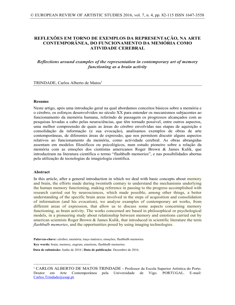 © EUROPEAN REVIEW OF ARTISTIC STUDIES 2016, vol. 7, n. 4, pp. 82-115 ISSN 1647-3558 REFLEXÕES EM TORNO DE EXEMPLOS DA REPRESENTAÇÃO, NA ARTE CONTEMPORÂNEA, DO FUNCIONAMENTO DA MEMÓRIA COMO ATIVIDADE CEREBRAL Reflections around examples of the representation in contemporary art of memory functioning as a brain activity TRINDADE, Carlos Alberto de Matos1 Resumo Neste artigo, após uma introdução geral na qual abordamos conceitos básicos sobre a memória e o cérebro, os esforços desenvolvidos no século XX para entender os mecanismos subjacentes ao funcionamento da memória humana, referindo de passagem os progressos alcançados com as pesquisas levadas a cabo pelas neurociências, que têm tornado possível, entre outros aspectos, uma melhor compreensão de quais as áreas do cérebro envolvidas nas etapas de aquisição e consolidação da informação (e sua evocação), analisamos exemplos de obras de arte contemporâneas, de diferentes áreas de expressão, que nos permitem discutir alguns aspectos relativos ao funcionamento da memória, como actividade cerebral. As obras abrangidas assentam em modelos filosóficos ou psicológicos, num estudo pioneiro sobre a relação da memória com as emoções dos cientistas americanos Roger Brown & James Kulik, que introduziram na literatura científica o termo “flashbulb memories”, e nas possibilidades abertas pela utilização de tecnologias de imagiologia científica. Abstract In this article, after a general introduction in which we deal with basic concepts about memory and brain, the efforts made during twentieth century to understand the mechanisms underlying the human memory functioning, making reference in passing to the progress accomplished with research carried out by neurosciences, which made possible, among other things, a better understanding of the specific brain areas involved in the steps of acquisition and consolidation of information (and his evocation), we analyze examples of contemporary art works, from different areas of expression, that allow us to discuss some aspects concerning memory functioning, as brain activity. The works concerned are based in philosophical or psychological models, in a pioneering study about relationship between memory and emotions carried out by american scientists Roger Brown & James Kulik, that introduced in scientific literature the term flashbulb memories, and the opportunities posed by using imaging technologies. Palavras-chave: cérebro; memória; traço mnésico; emoções; flashbulb memories. Key words: brain, memory, engram, emotions, flashbulb memories. Data de submissão: Junho de 2016 | Data de publicação: Dezembro de 2016. 1 CARLOS ALBERTO DE MATOS TRINDADE - Professor da Escola Superior Artística do Porto. Doutor em Arte Contemporânea [email protected]. pela Universidade de Vigo. PORTUGAL. E-mail: 83 | TRINDADE, Carlos Alberto de Matos 1. MEMÓRIA E CÉREBRO. NATUREZA DA MEMÓRIA Em sentido lato, o termo “memória” (do latim memorĭa) designa a faculdade mental que permite ao cérebro reter e restituir as informações apreendidas pelo ser humano, através de funções cerebrais distintas; a memória pode, por isso, ser definida genericamente como o processo através do qual tudo aquilo que o ser humano aprende perdura no tempo. Como afirmam Eric Kandel e Larry Squire, “A maior parte daquilo que sabemos sobre o mundo não está integrado no nosso cérebro à nascença, sendo antes adquirido através da experiência e guardado pela memória (…) Consequentemente, somos quem somos, em grande parte, devido ao que aprendemos e relembramos. Mas a memória não é apenas um registo da experiência pessoal: também nos permite adquirir uma formação e é uma poderosa força de progresso social” (KANDEL & SQUIRE, 2002, p. 10). Se existe de facto um tipo de aprendizagem que não exige um conhecimento consciente (o hábito), implicando a evocação de qualquer experiência passada, mesmo quando resultou dum processo de repetição continuada – como as actividades motoras em geral, meras acções reflexivas e mecânicas –, já um outro, pelo contrário, é responsável pela aptidão humana de evocar conscientemente eventos passados, que está sujeita a ser perdida através de uma amnésia. Em finais do século XIX, tanto o psicólogo e filósofo norte-americano William James (1841, Nova Iorque – Chocorua, New Hampshire, 1910) na sua obra clássica The principles of Psychology (1890), como o filósofo françês Henri Bergson (1859, Paris – Paris, 1941), na muito influente obra Matière et mémoire: Essai sur la relation du corps à l’esprit (1896), já tinham reconhecido a existência desses dois tipos de aprendizagem. Do ponto de vista científico tradicional, a memória humana e animal depende de vestígios mnésicos imateriais a que se dá o nome de engrama (s)2, inscritos no cérebro (sistema nervoso) por um estímulo durante o processo de aquisição de informações, e depois armazenados e conservados sob forma mais ou menos explícita: a concepção está ainda intimamente relacionada com a antiga noção de “marca”, aquela que remonta a Platão e é depois mantida por Leibniz e Descartes, entre outros. Foi o biólogo evolucionista alemão Richard Wolfgang Semon (1859, Berlim-1918, Munique), nos dias de hoje pouco referido, quem propôs o termo engram (The Mneme. Londres: 2 Vd. sobre o engrama, idem, pp. 81-82; e Jean CAMBIER – A Memória. Lisboa: Editorial Inquérito, 2004, p. 37. Representação na arte contemporânea: do funcionamento da memória como atividade cerebral | 84 George Allen and Unwin, 1900) para denominar o “traço mnésico” duradouro que uma percepção deixa no cérebro, o qual passou a ser usado na psicologia. Semon na sua teoria da memória sustentava já então que o engram não era um traço imutável e definitivo, porque defendia que a aquisição de novas lembranças modifica sempre as antigas – algo amplamente com